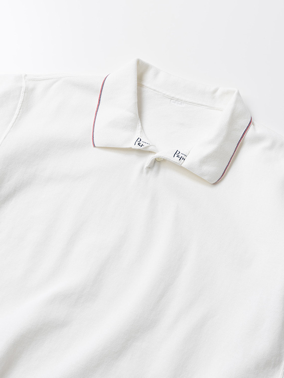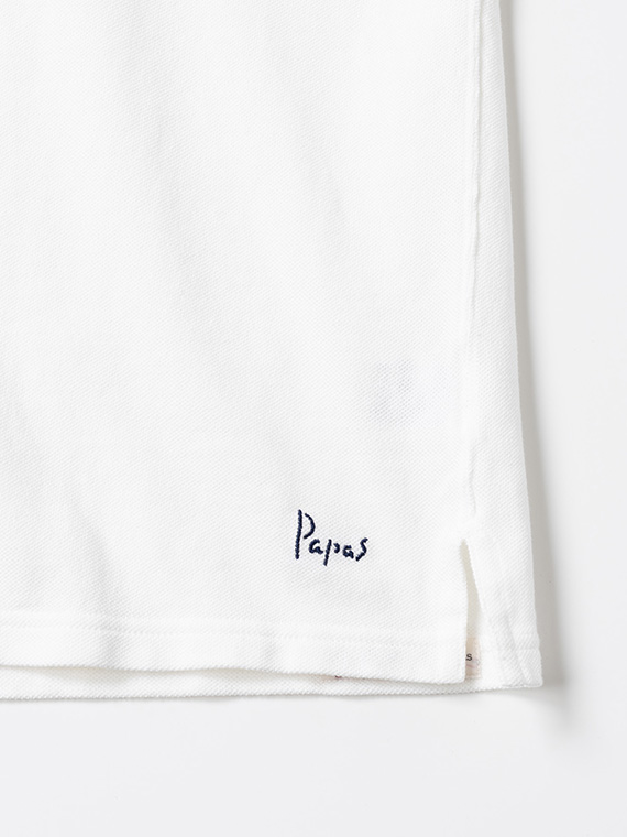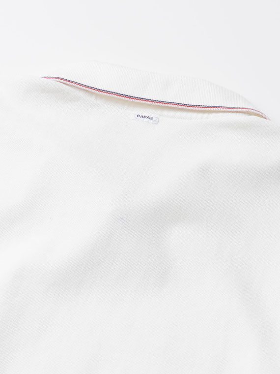 上前見返し・下前持ち出し・裾脇スリット裏にはロゴ入りテープを使用し、細部にまでこだわりを込めました。左右裾脇にはスリットを入れ、動きやすさにも配慮しています。左裾には「Papas」の1色刺繍を施し、控えめなポイントに。シンプルながらディテールで差をつけた、着回し力の高い一枚です。