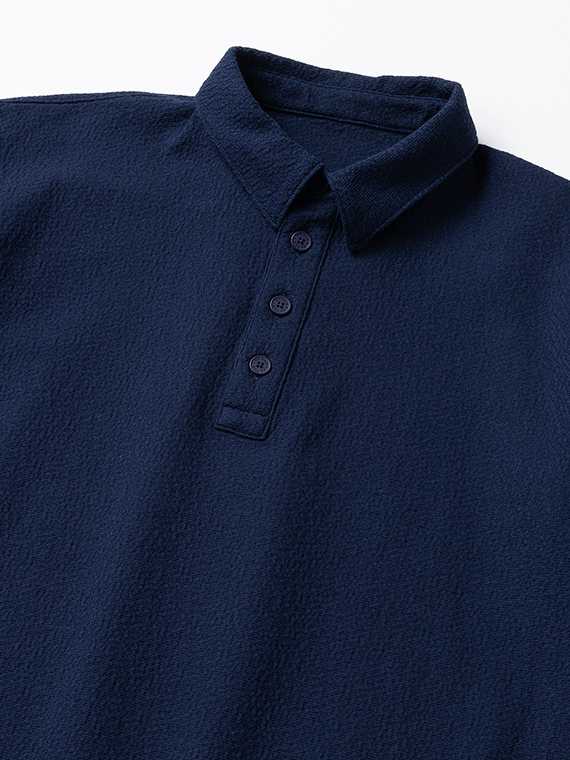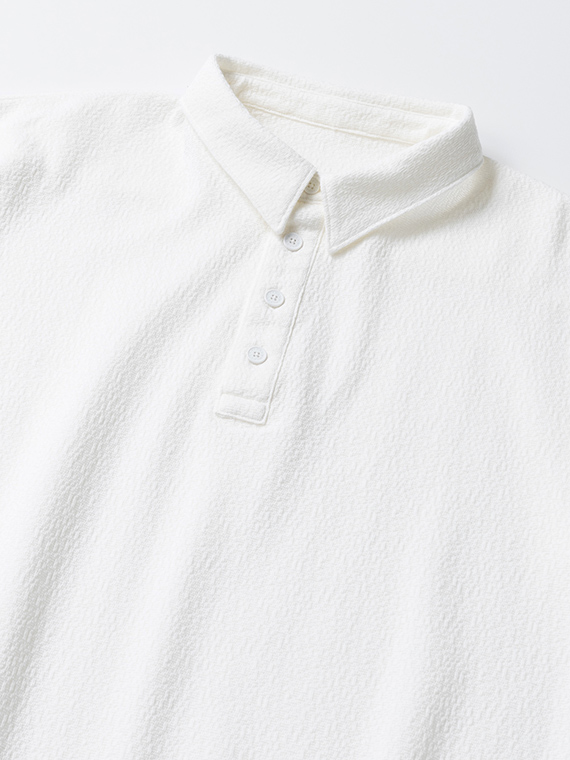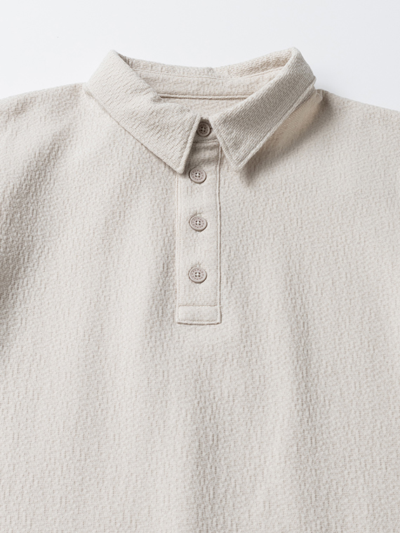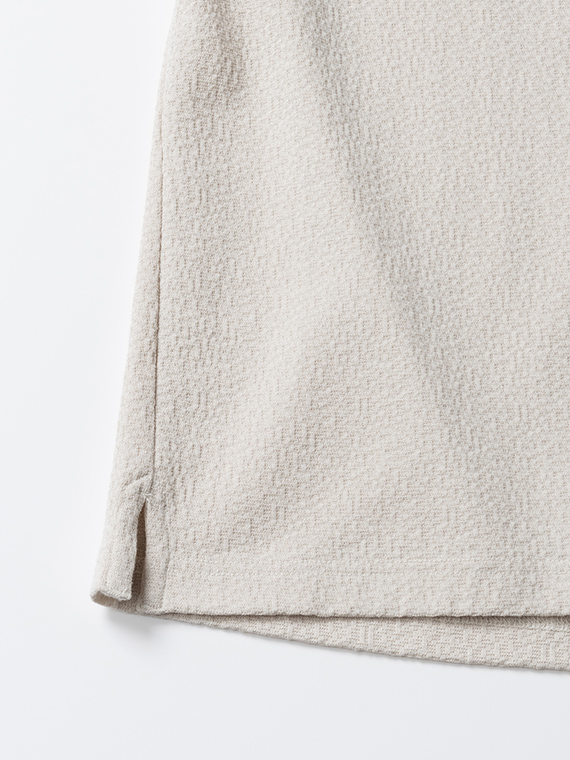 素材には、希少な編み機で編み上げたリンクスジャカードのモザイク柄生地を使用。リンクス編みは、平編みの横列を一列おきに表目と裏目で構成する編み方で、編地の凹凸によってモザイク柄を表現しています。プリントとは異なる立体的な表情が特徴で、奥行きのある見え方をお楽しみいただけます。縦横ともに伸縮性に優れており、動きやすく快適な着心地も魅力の素材です。