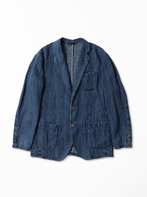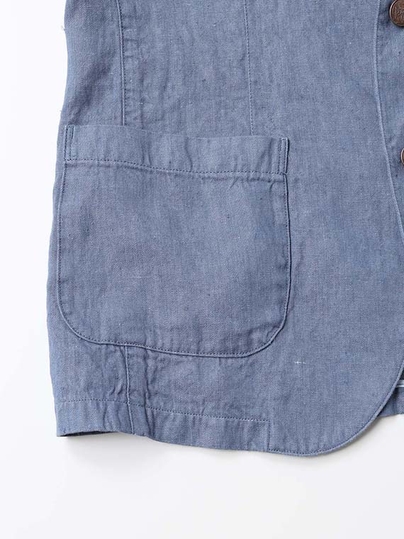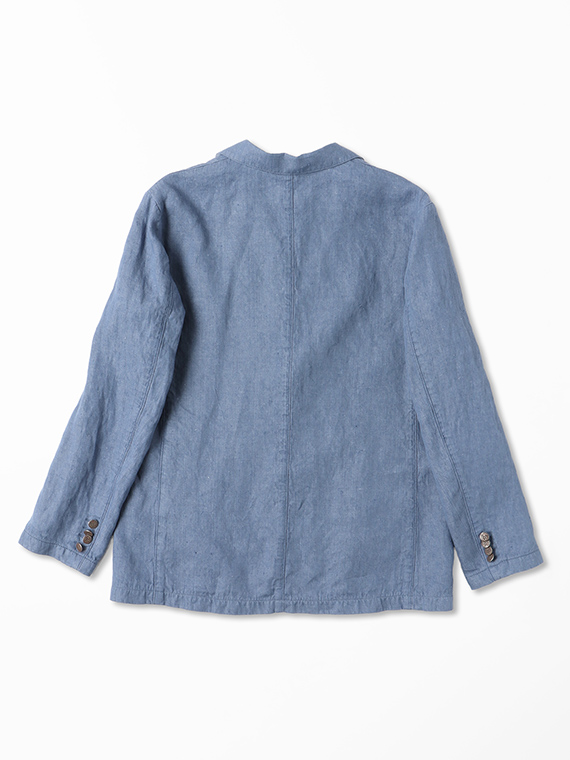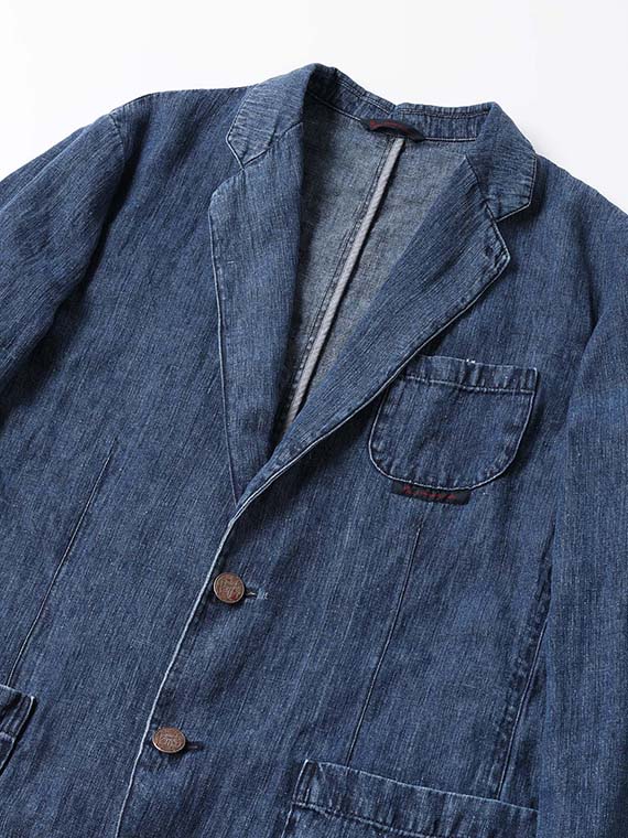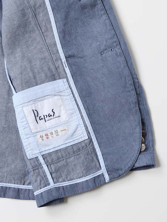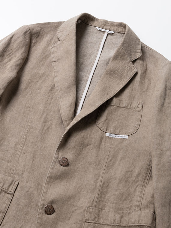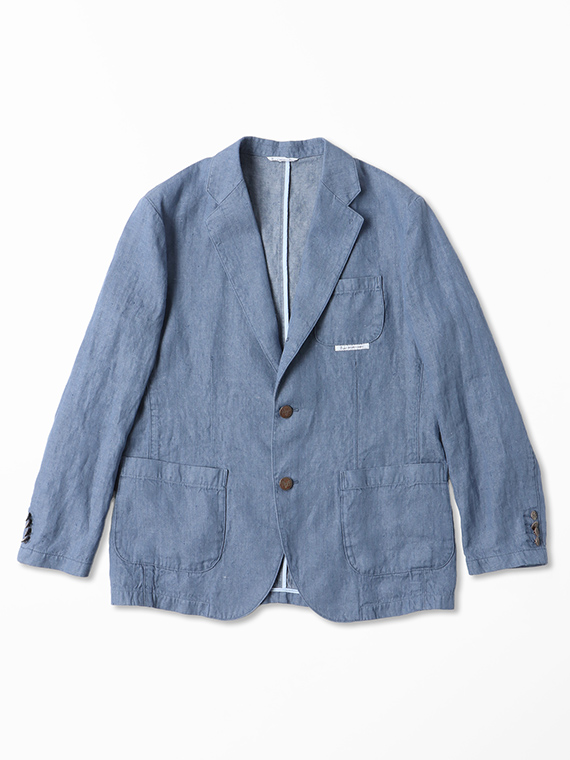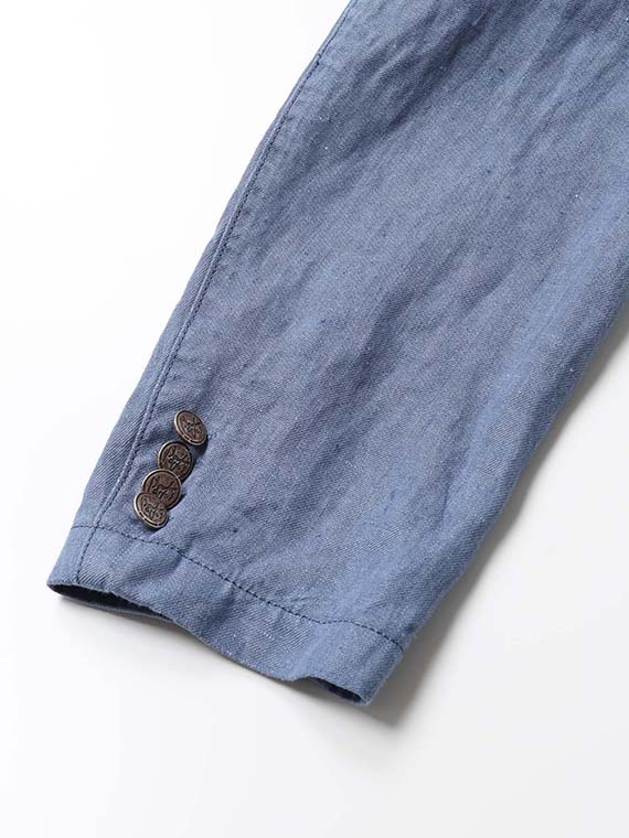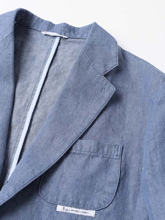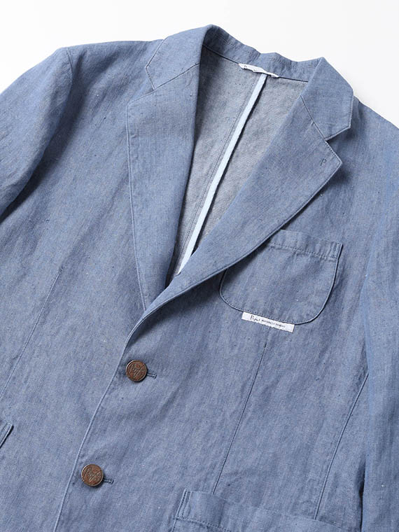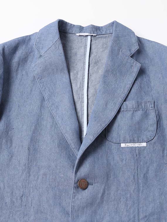 定番の段返りスリム3つ釦仕様で、すっきりとしたシルエットに仕上げています。左胸・腰ともパッチポケットを配した軽快なデザインで、単衣仕立てのため軽く羽織れる着用感も魅力。胸パッチポケット下にはネームをあしらいアクセントをプラス。地衿にはオックスフォードの別布を使用し、細部までこだわった仕上がりです。