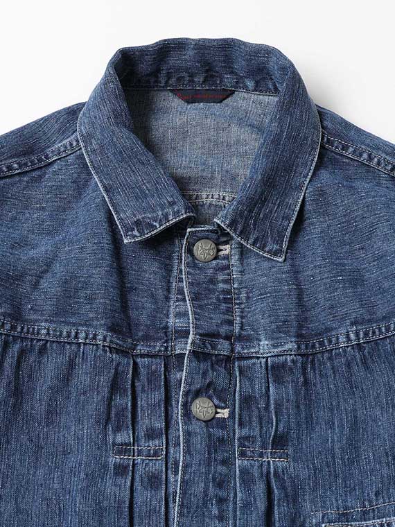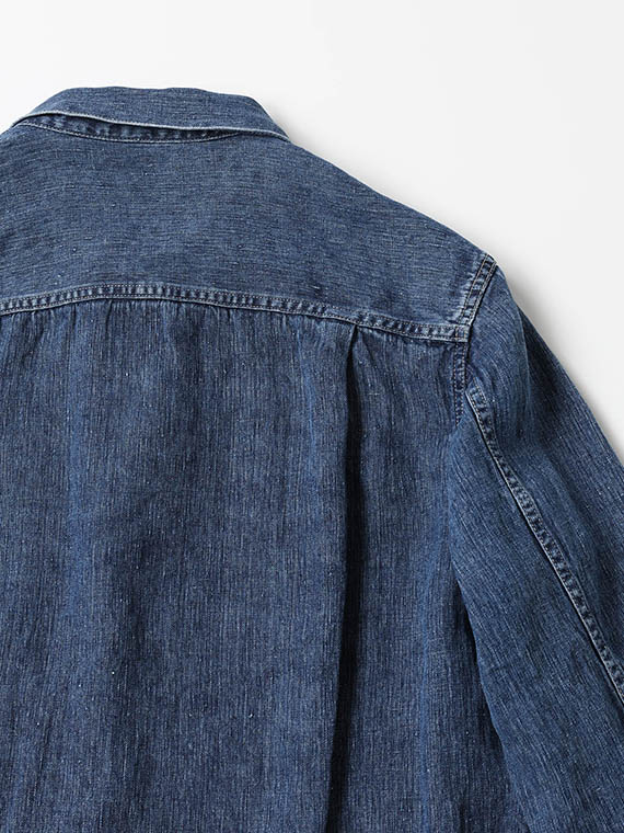前身頃には4本のタックを配し、立体的な表情を加えています。左胸にはパッチポケットを配置し、デザインのアクセントと実用性を兼ね備えました。前後にヨークを設け、後身頃の上下にも4本のタックを入れることで動きのあるシルエットに仕上げています。随所に配した配色ステッチがデニムらしい表情を引き立て、カジュアルな雰囲気を高めています。