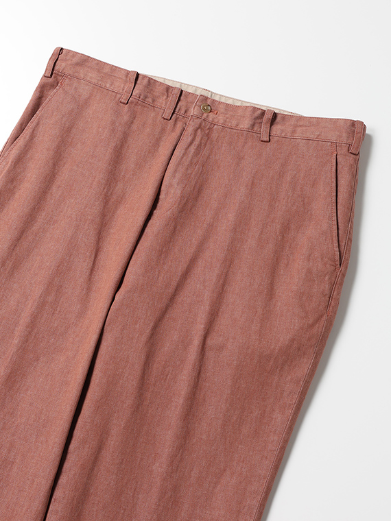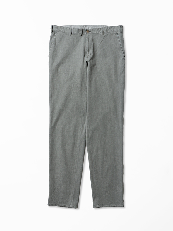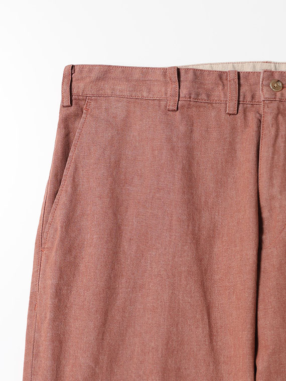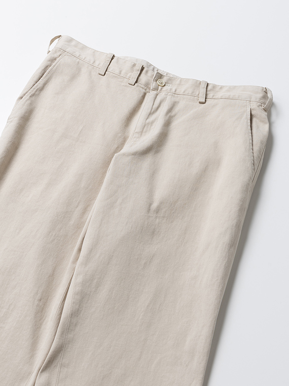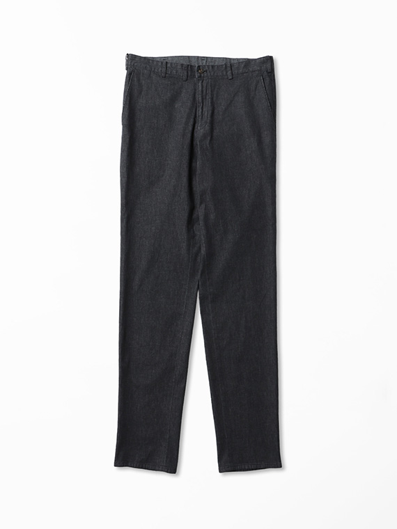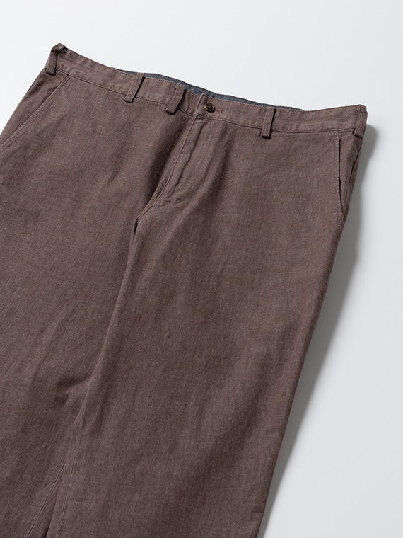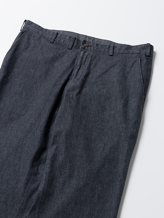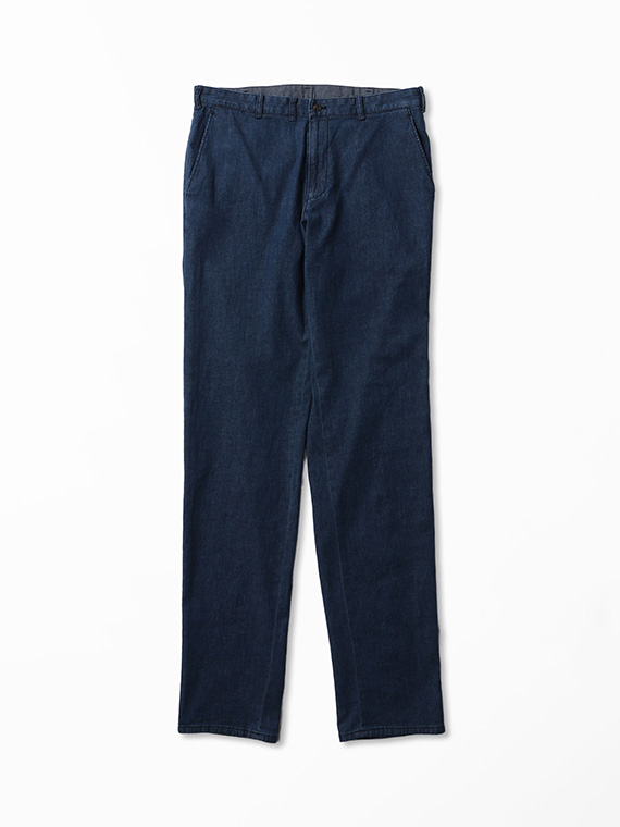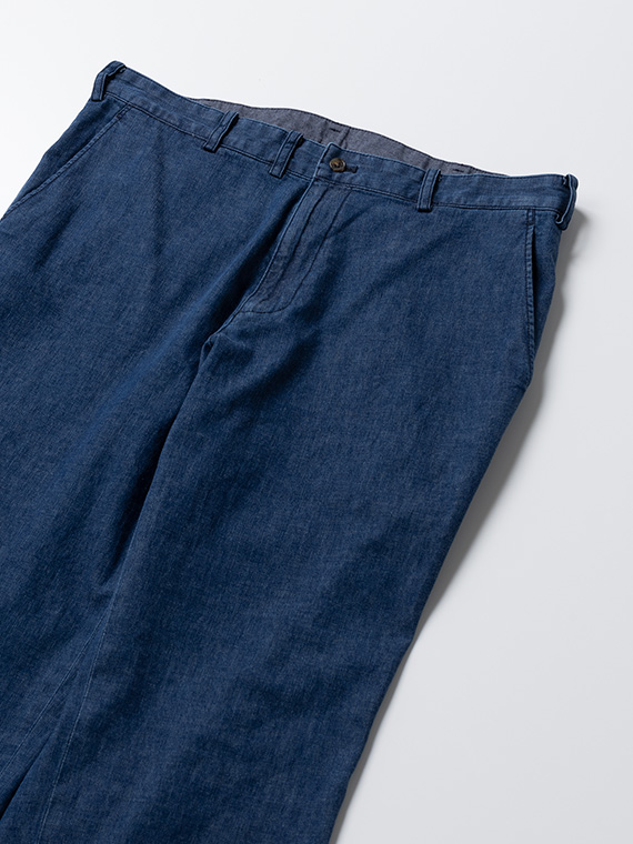 すっきりとしたシルエットの定番ノータックデザインで、カジュアルからきれいめまで幅広いコーディネートに対応します。脇ポケットは使いやすい斜めポケット仕様、後ろには両玉縁の釦止めポケットを配し、端正な印象に仕上げています。腰裏にはダンガリー生地をあしらい、見えない部分にもさりげないアクセントを加えました。シンプルながら細部まで丁寧に仕立てた、日常使いしやすい一本です。