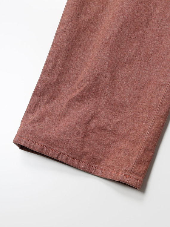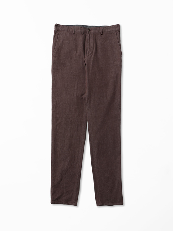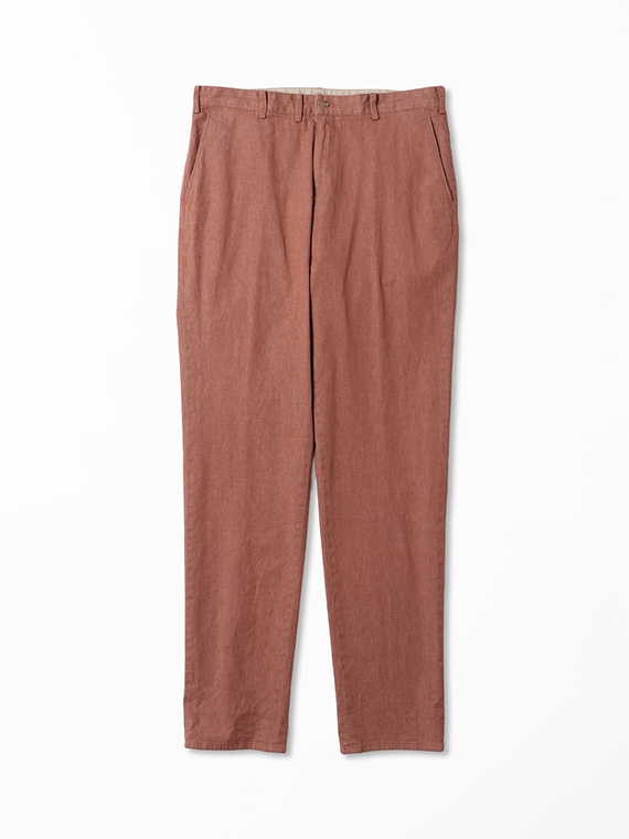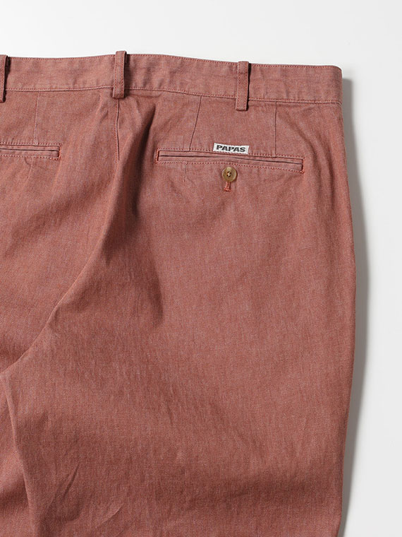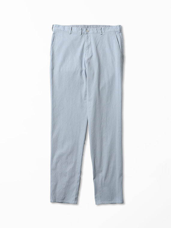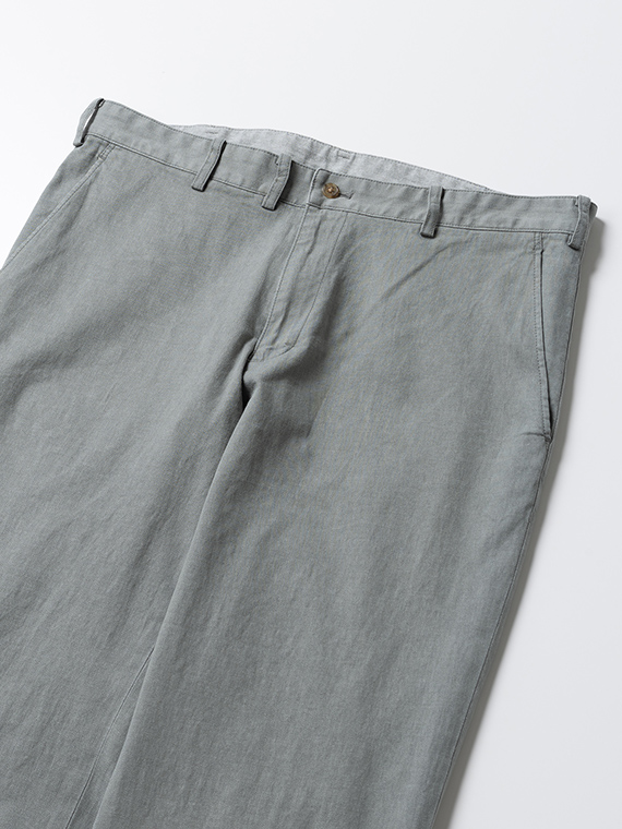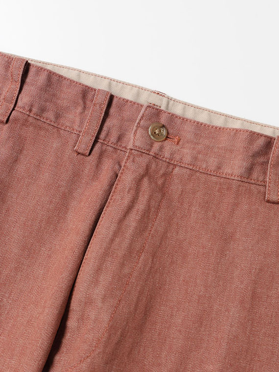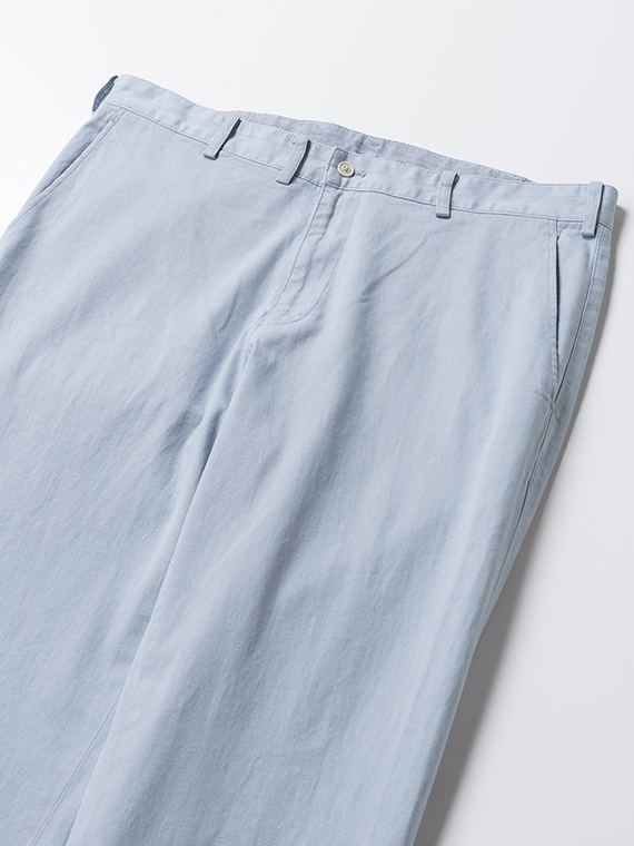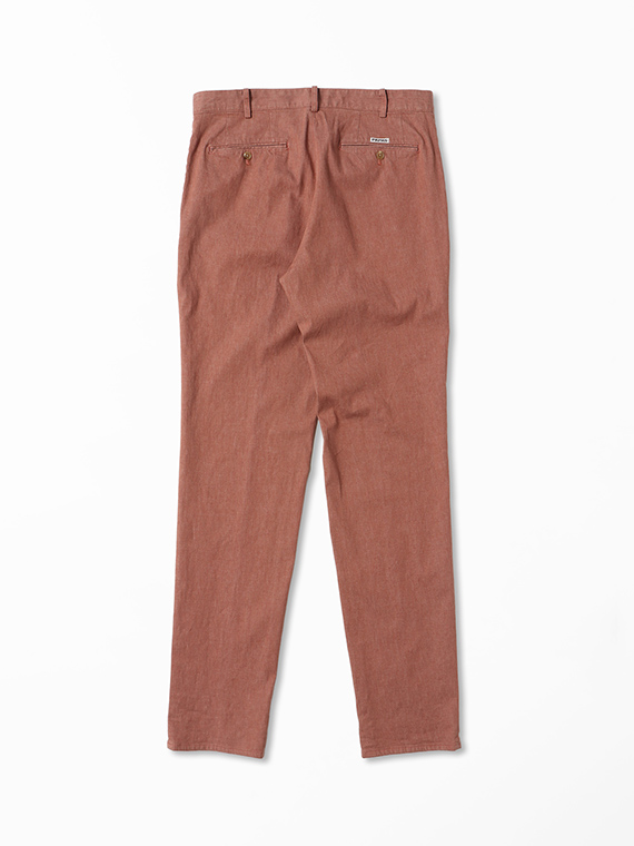 すっきりとしたシルエットの定番ノータックデザインで、カジュアルからきれいめまで幅広いコーディネートに対応します。脇ポケットは使いやすい斜めポケット仕様、後ろには両玉縁の釦止めポケットを配し、端正な印象に仕上げています。腰裏にはダンガリー生地をあしらい、見えない部分にもさりげないアクセントを加えました。シンプルながら細部まで丁寧に仕立てた、日常使いしやすい一本です。