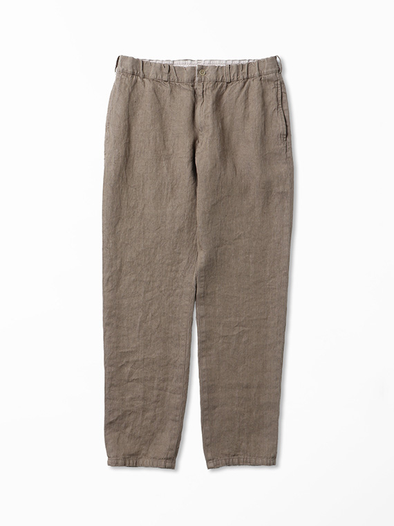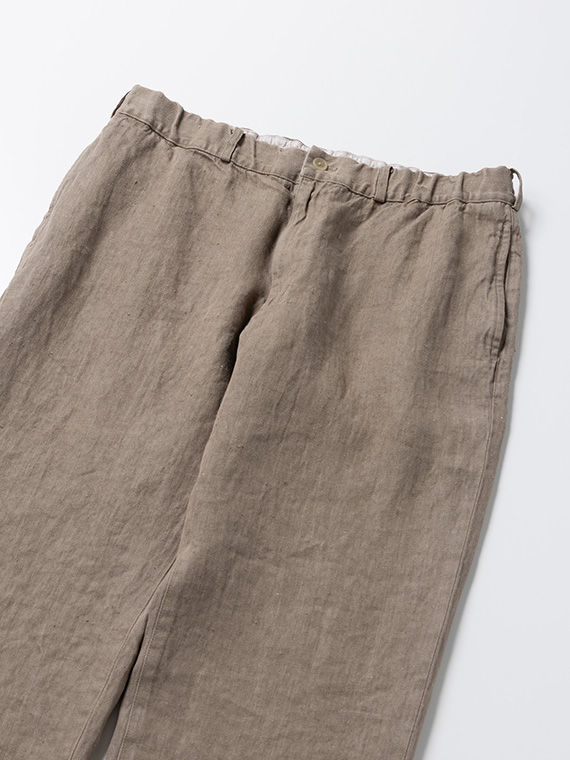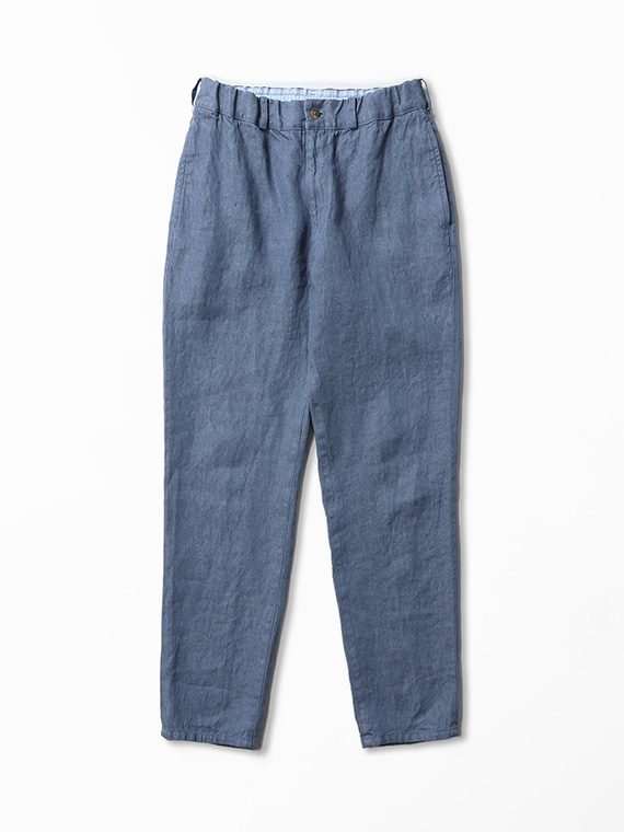 スリムなノータックデザインで、ウエストはゴム仕様に内側へ平スピンドルを通し、快適なフィット感に調整できるつくり。ベルトループも備えているため、ベルトを合わせた着こなしにも対応します。脇には使い勝手のよいスラッシュポケットを配し、後ろには片玉縁のボタン止めポケットを配置。腰裏にはオックスフォードの別布をあしらい、細部まで丁寧に仕上げています。