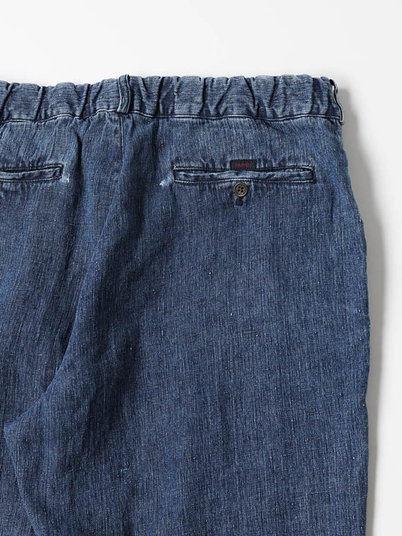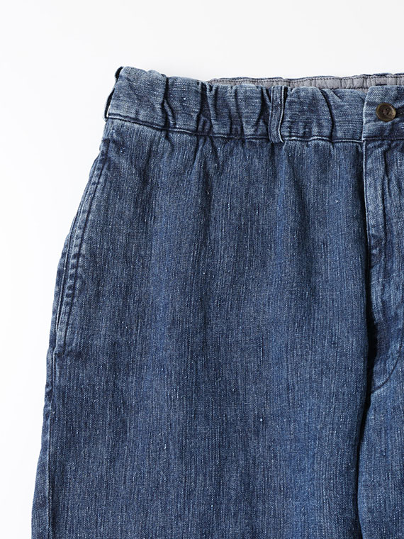 天然素材ならではのナチュラルな表情とデニムのヴィンテージライクな雰囲気を併せ持つ素材で、春先に適した仕上がりです。アイテムごとに洗い加工の強弱を調整しており、こちらのイージーパンツと、セットアップのジャケットはやや弱めの洗いで合わせています。なお今回はブリーチによる脱色を行わず、生地への負担を抑えた仕上げとなっています。