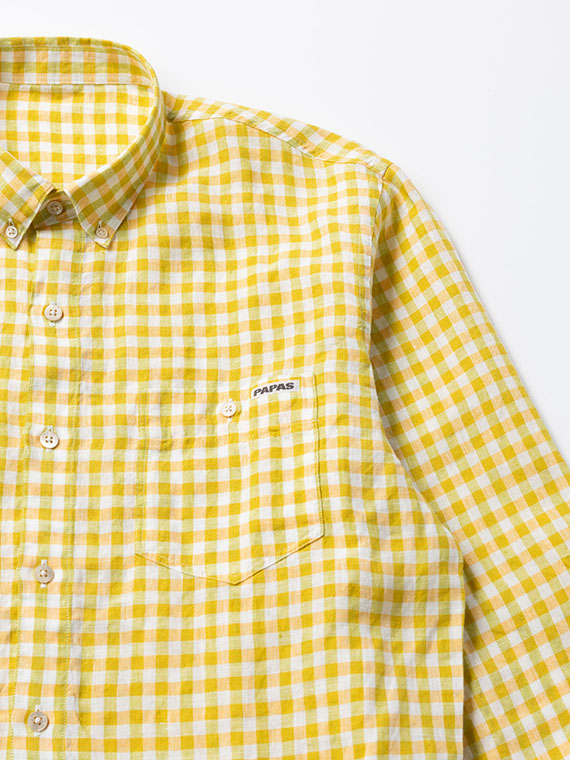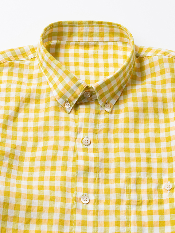 素材には、タテ糸・ヨコ糸ともにフランス・ノルマンディ地方の上質なリネン原料を使用した平織生地を採用。66/1の糸でホワイトリネンと反応染めの糸を組み合わせ、18本×18本でギンガムチェックの配列を構成しています。糸染めは日本の伝統的な染色技法である綛(かせ)染めで行い、素材への負担を抑えながら均一で奥行きのある色合いを実現するとともに、織り工程に必要な強度も確保しています。