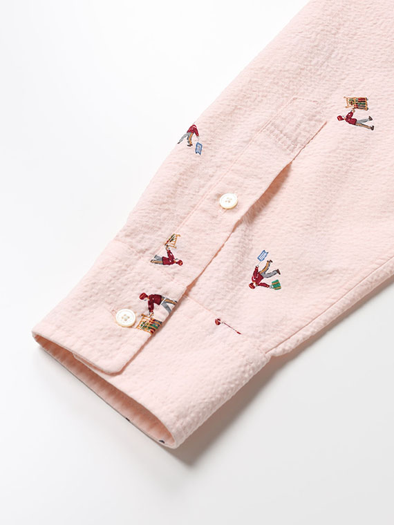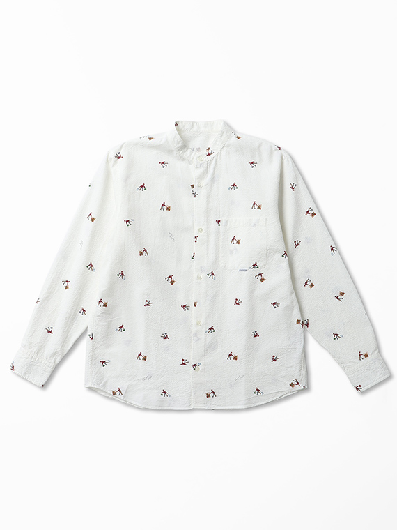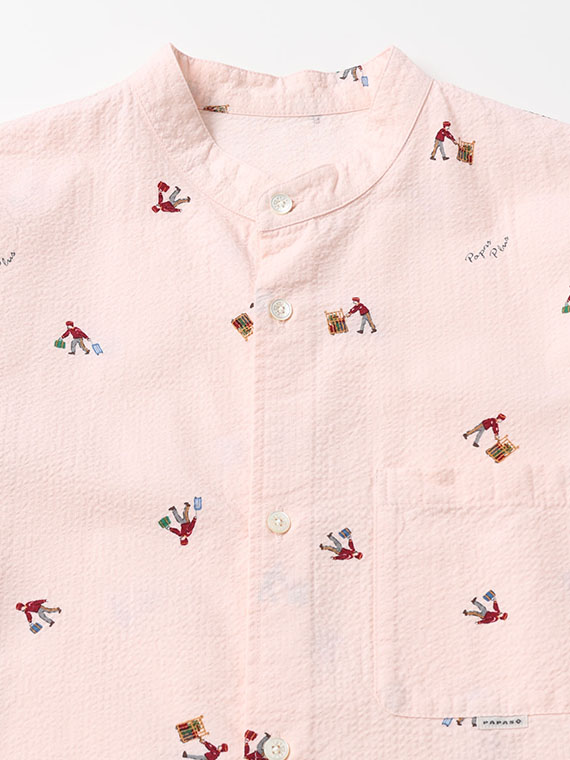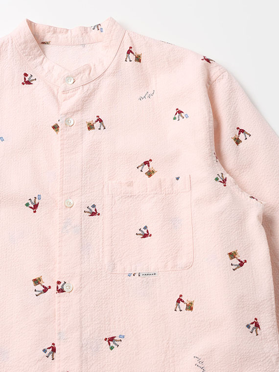 柄は、荷物を運ぶポーターの姿をモチーフにしたユニークなプリント。さまざまなポーズで荷物を扱う様子が散りばめられており、遊び心のある表情がシャツ全体にあしらわれています。軽やかな素材感と相まって、着こなしにさりげない個性を添えてくれる一着です。