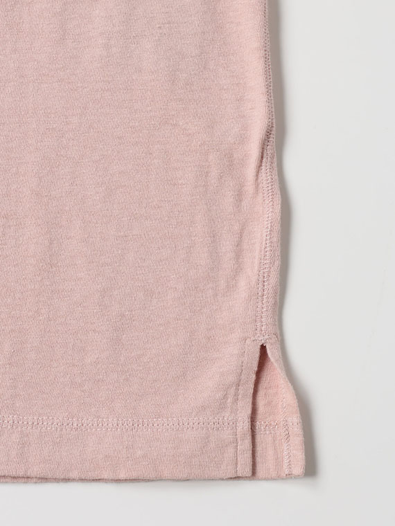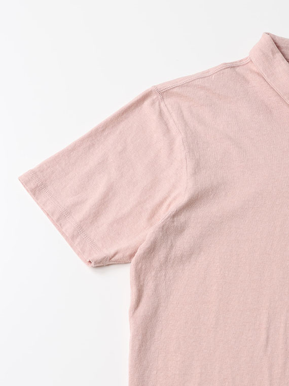 素材には、大正紡績の代表的な「ラフィ」に良質なベルギー産リネンを加えた綿麻天竺を使用。リネンのしなやかさとラミーの持つハリ・コシをバランスよくブレンドし、ラフィ特有のムラ糸の表情を組み合わせることで、ナチュラルな風合いを引き出しています。麻ならではのドライなタッチとさらりとした肌離れの良さを備え、軽やかで心地よい着用感に仕上げています。