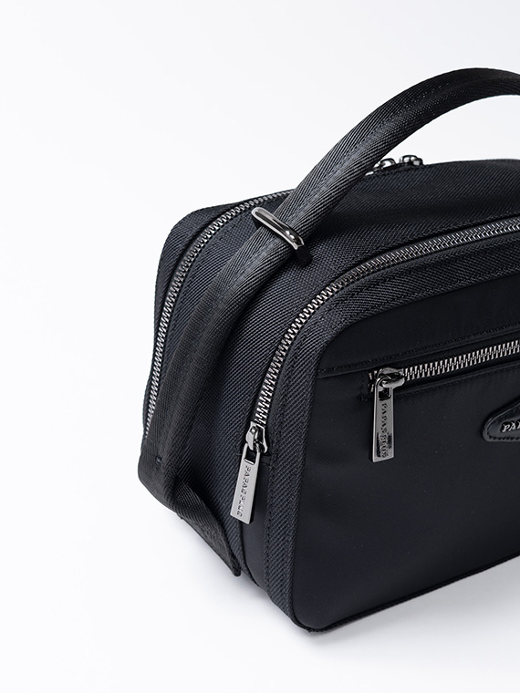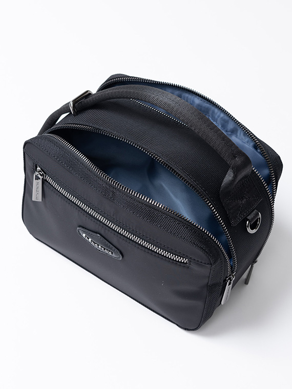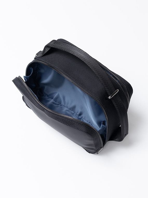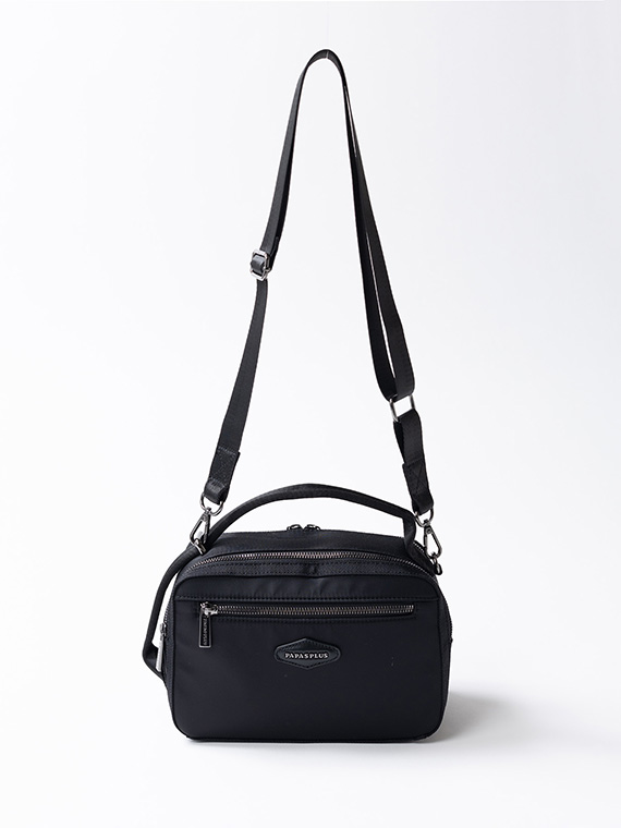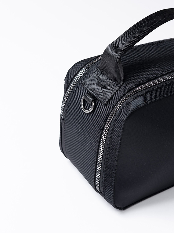 天マチから左マチにかけて配したハンドルにより手持ちでも扱いやすく、付属のショルダーストラップを装着すれば肩掛けや斜め掛けとしても使用可能な3WAY仕様。メイン収納はダブルファスナーで開閉しやすく、正面にはファスナーポケットを備えることで小物の整理もしやすい構造になっています。