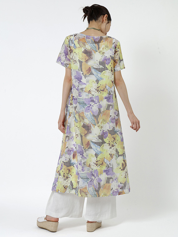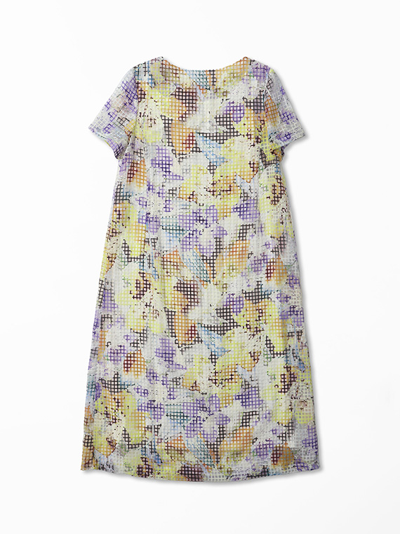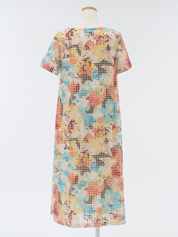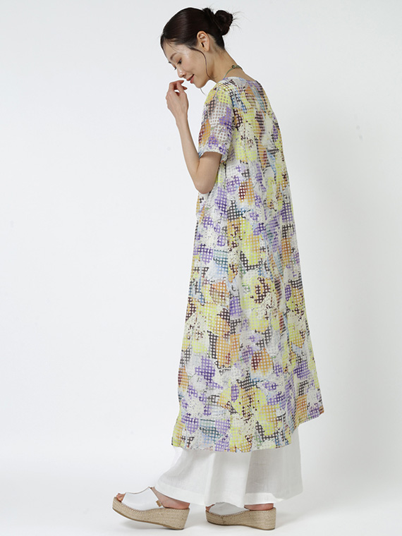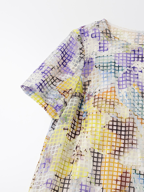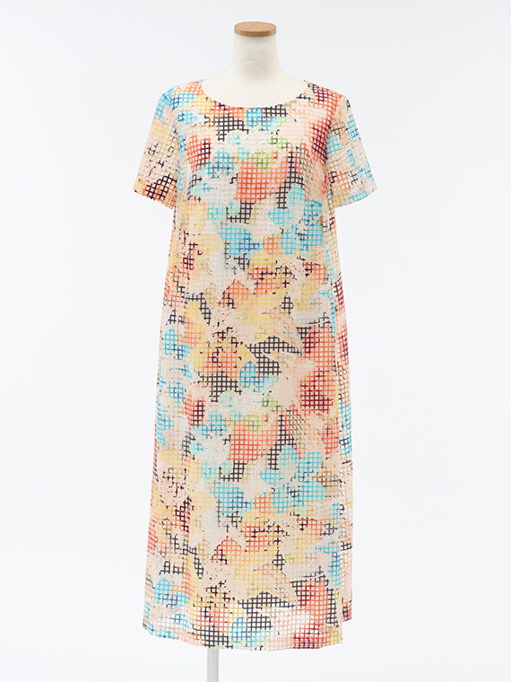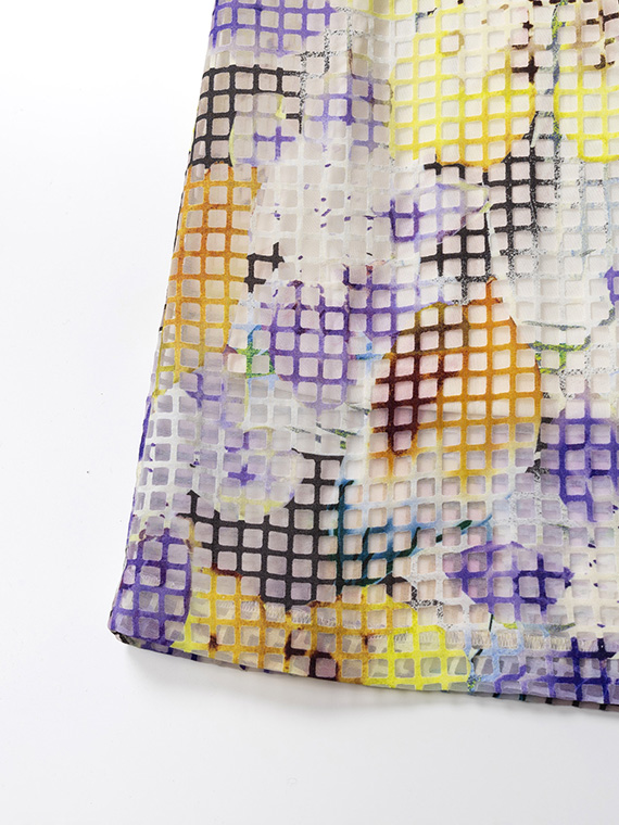・インクジェットの色彩美:その格子柄の上に、さらにコンピューター制御による緻密な手描き風フラワー柄を重ねました。色数の制限がないインクジェットだからこそ、筆致の揺らぎまで再現した多色使いのブーケが、まるでお肌の上に直接描かれているかのように美しく映えます。