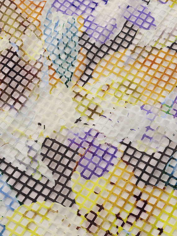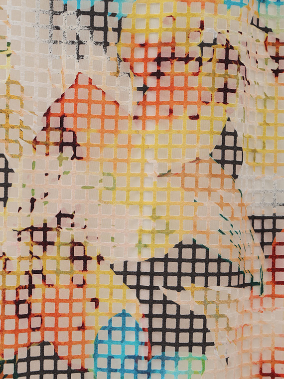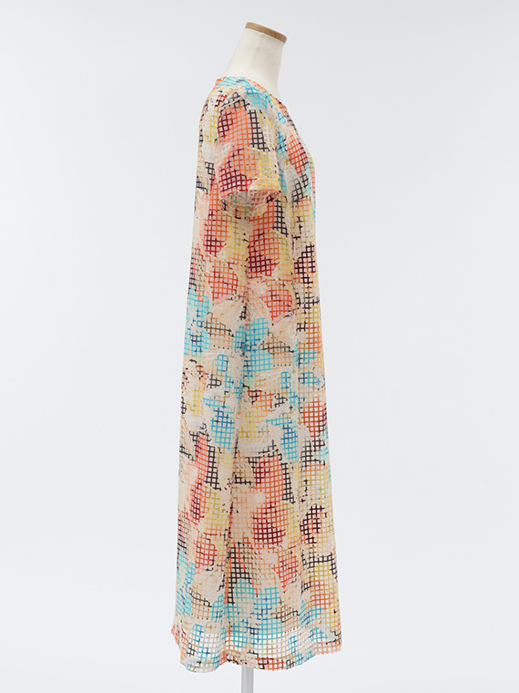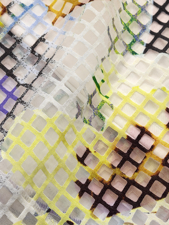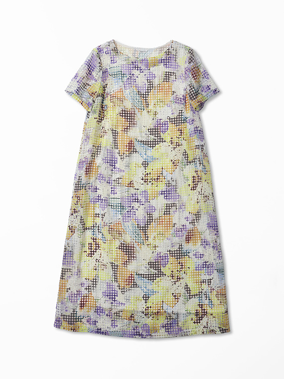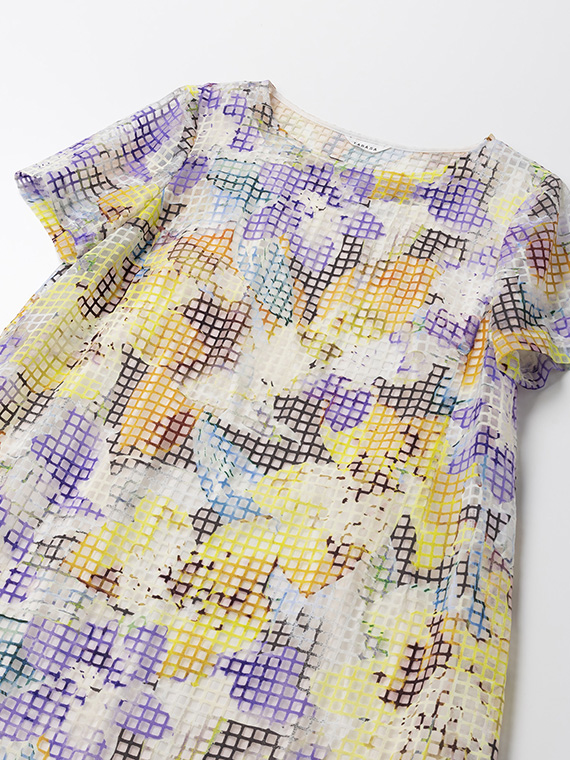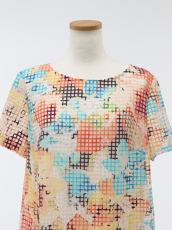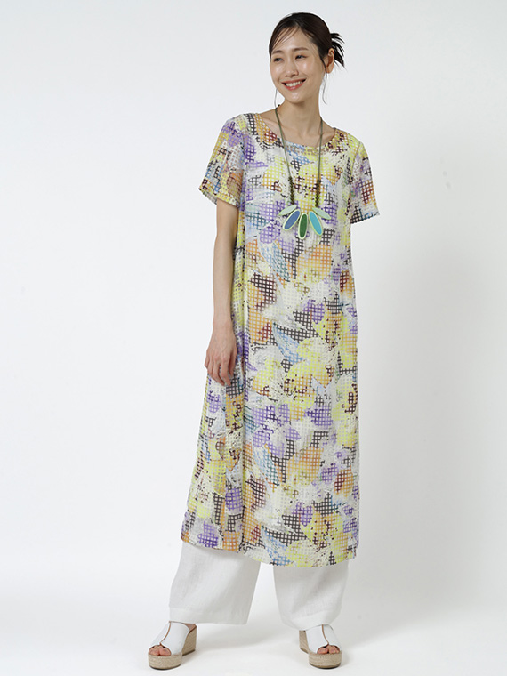 ・インクジェットの色彩美:その格子柄の上に、さらにコンピューター制御による緻密な手描き風フラワー柄を重ねました。色数の制限がないインクジェットだからこそ、筆致の揺らぎまで再現した多色使いのブーケが、まるでお肌の上に直接描かれているかのように美しく映えます。