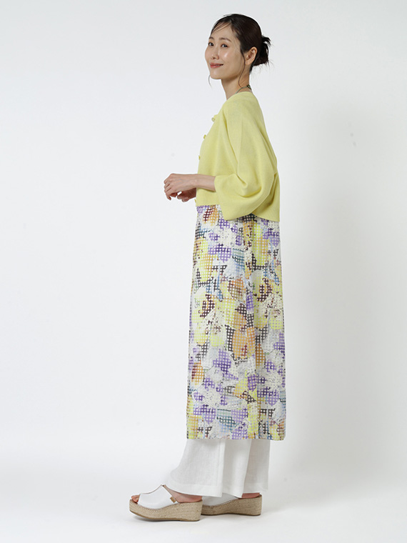 裾に向かって優雅に広がるゆるやかなAラインシルエットが、歩くたびに光を透過し、花々を揺らします。