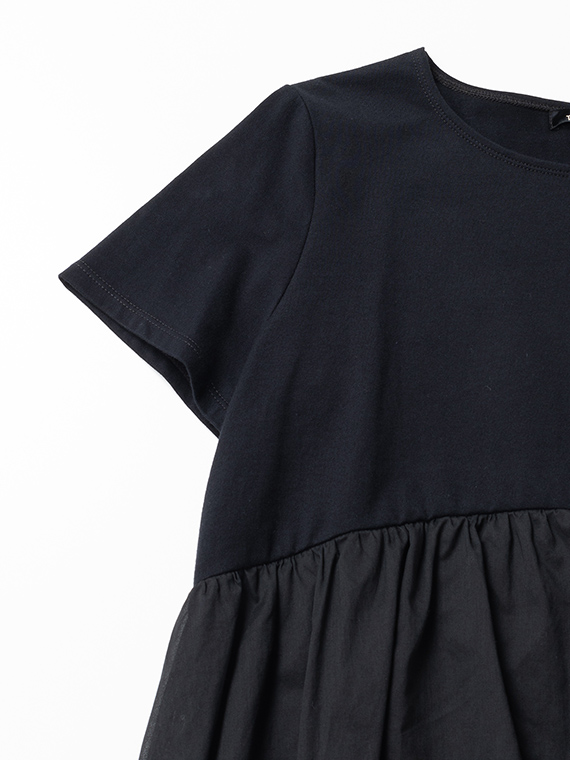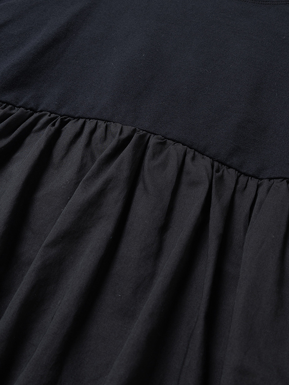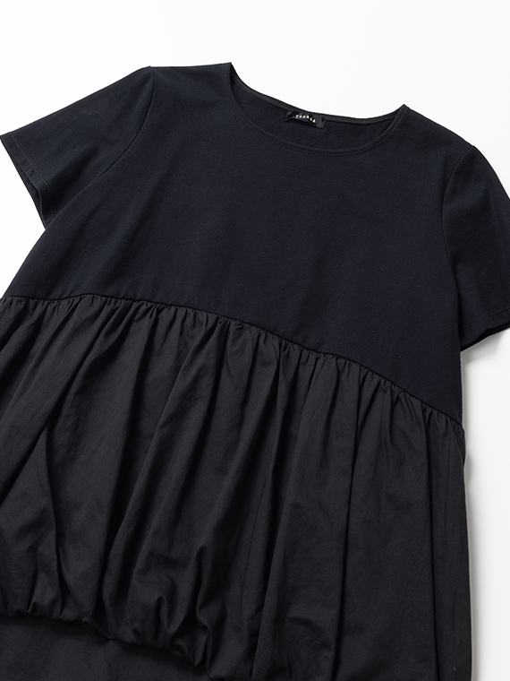 この胸下からのたっぷりとしたギャザーが、裾に向かってふんわりと丸みを帯びて収まることで、ウエスト周りやヒップを可愛らしく、さりげなくカバーしてくれます。
