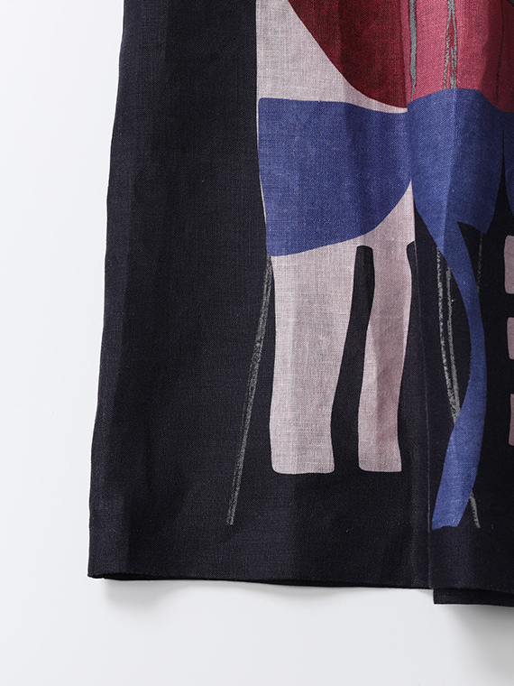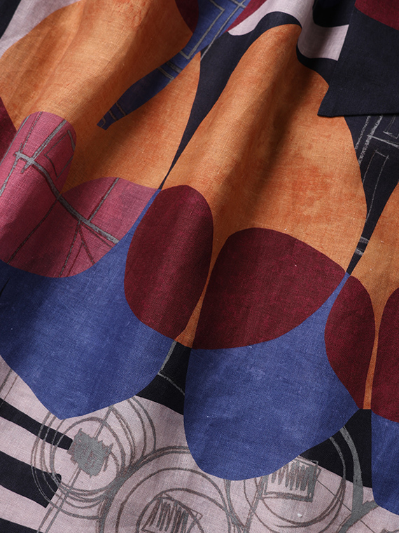 どっしりとした力強さを感じる思い切りのよいカラーを活かした柄と、繊細でリズミカルな線描きの柄。この対照的な2つの要素をインクジェットプリントで組み合わせることで、単なるプリント柄を超えた、現代アートのようなグラフィカルな奥行きを生み出しています。