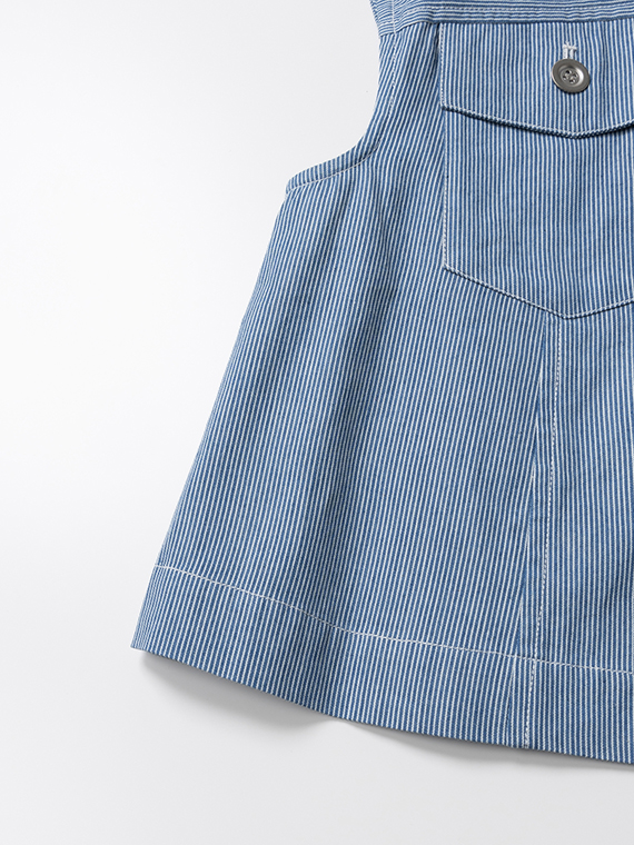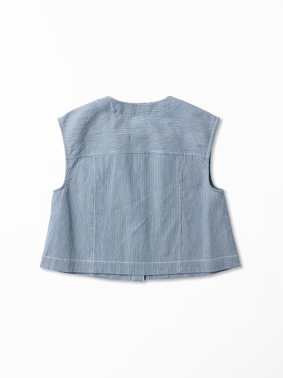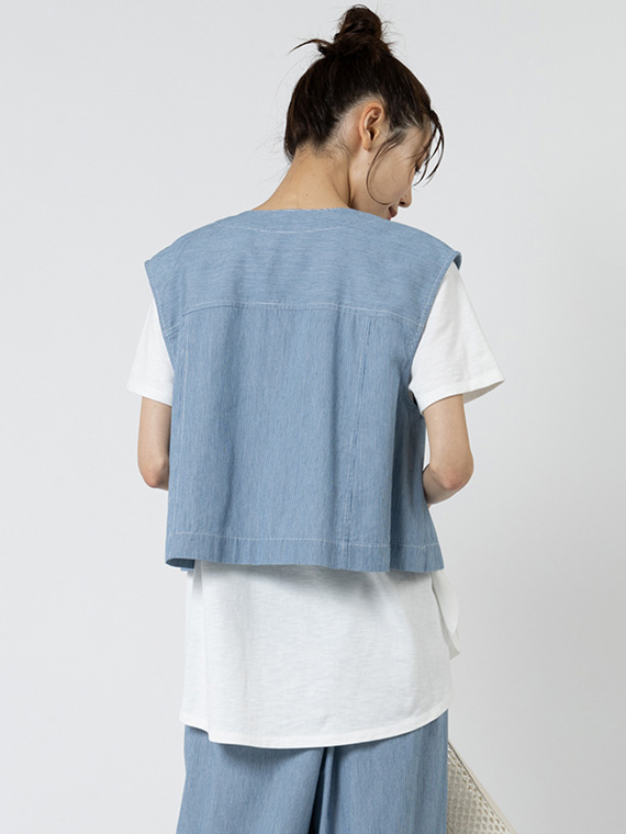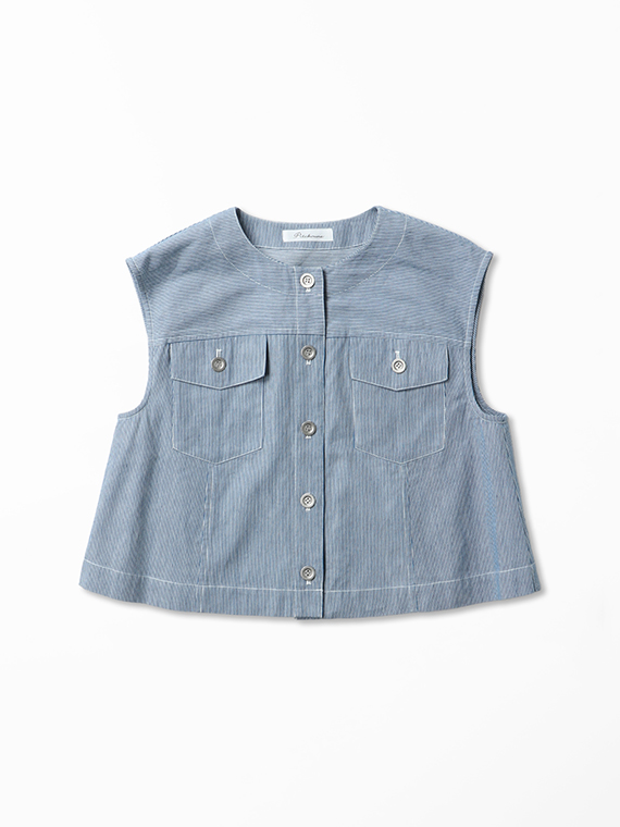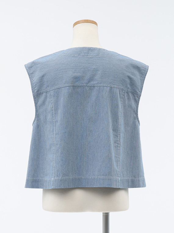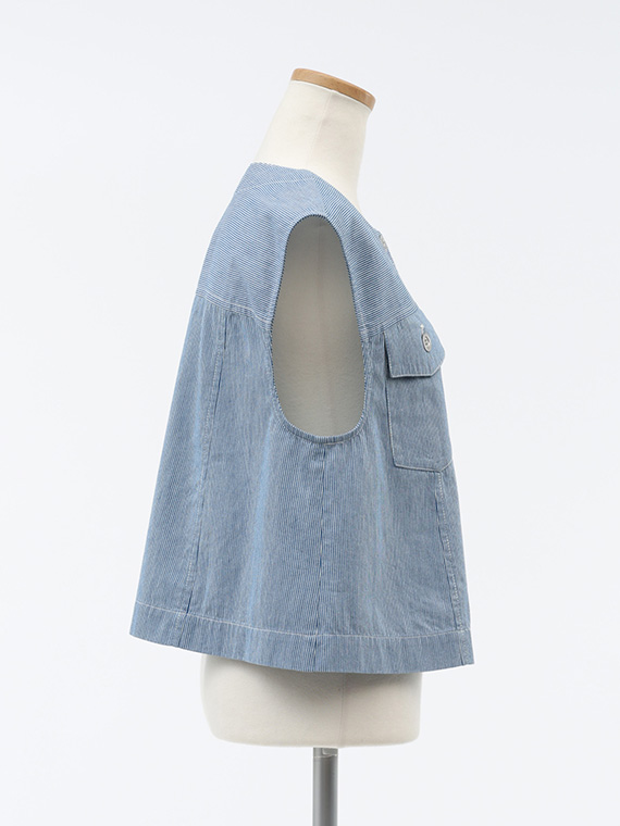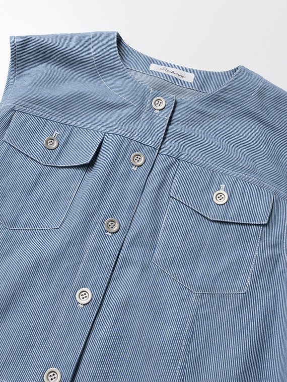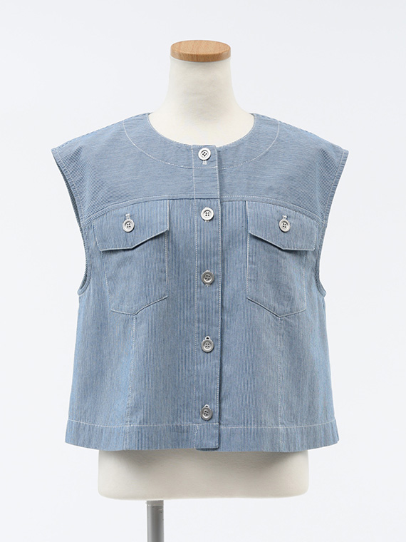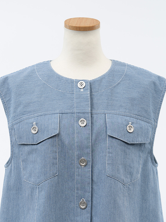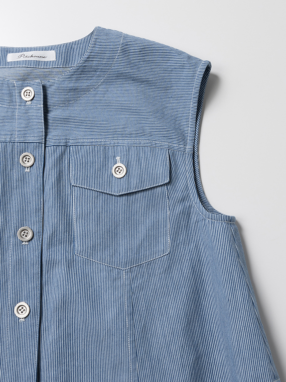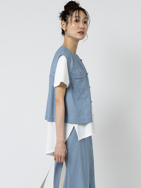 オーセンティックなGジャンのディテールを、夏らしくノーカラー&ノースリーブに落とし込んだ潔いブルゾンです。