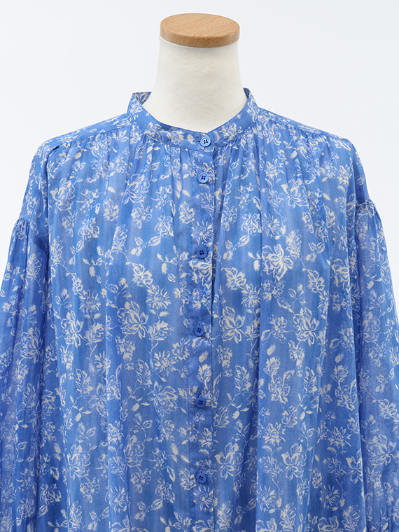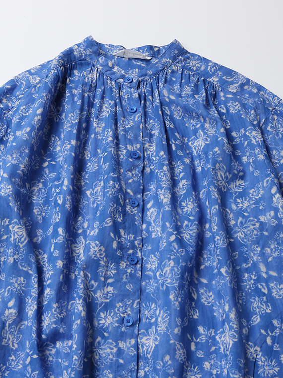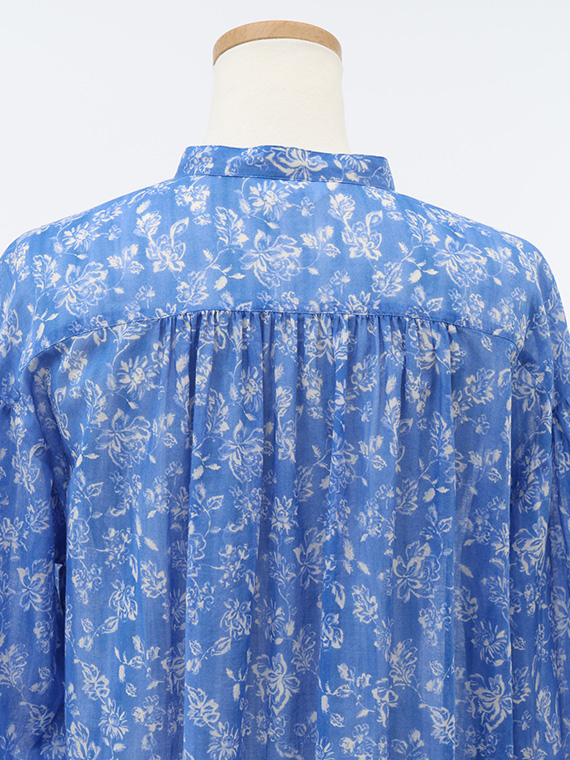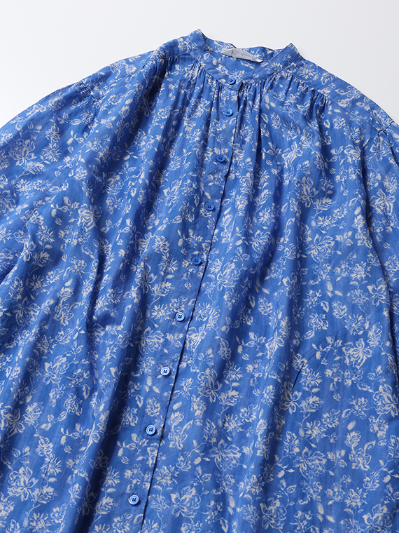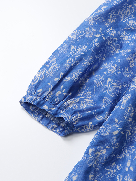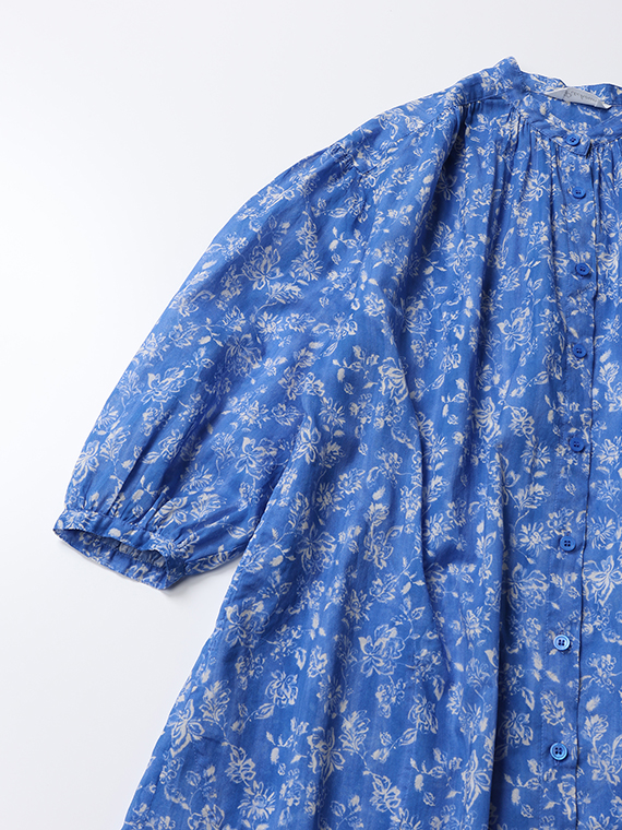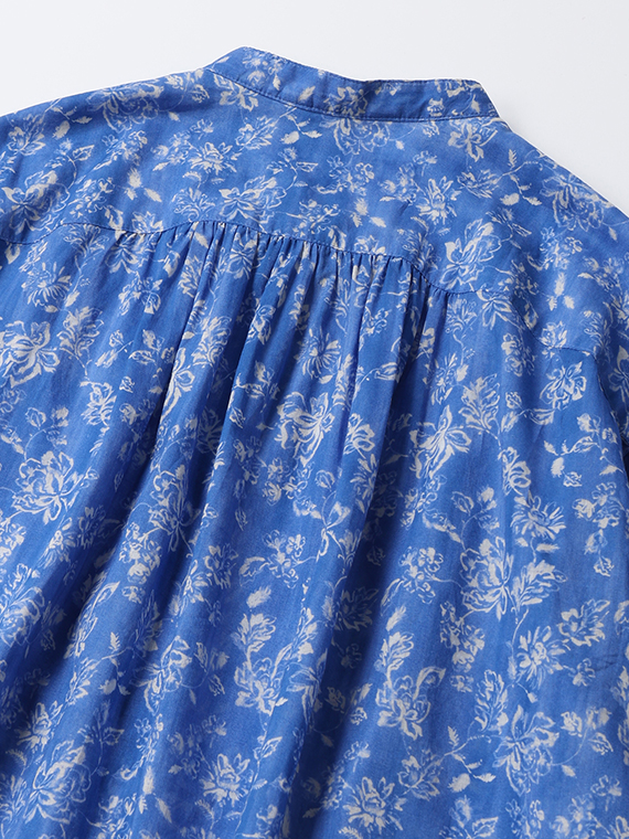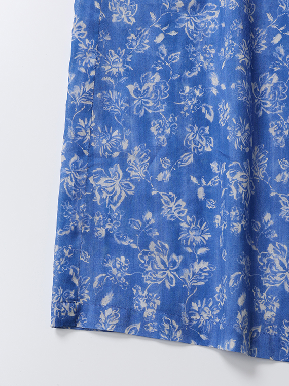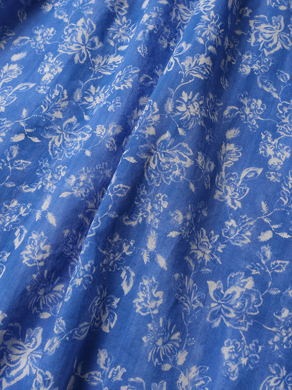 コンピューター制御により、色数に制限なく染め上げるこの技法だからこそ、ヴィンテージファブリックのような複雑な色調と、奥行きのあるグラデーションが実現しました。素材が非常に繊細で薄いため、ベースのブルーに絶妙なムラ感が生まれ、それがまるで長年大切に着込まれたような、こなれた格好良さを醸し出しています。