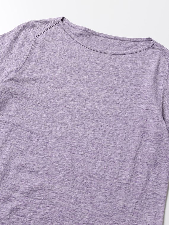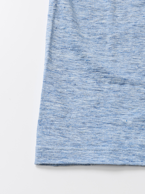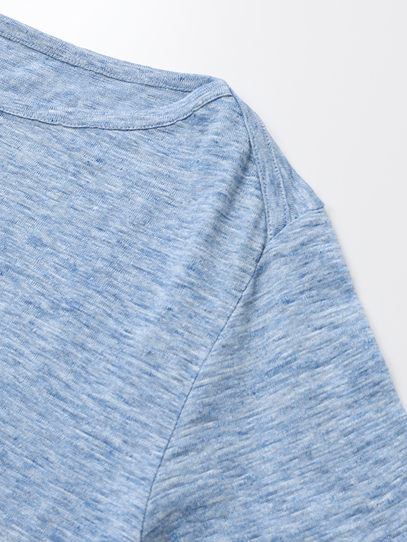 麻-100%の糸を使用しています。特殊加工を施す事で家庭洗濯が可能になりました。柔らかさを重視して何度も試験を重ねて作り上げた、オリジナルのリネン天竺です。麻の清涼感と特殊加工による柔らかさが特徴です。