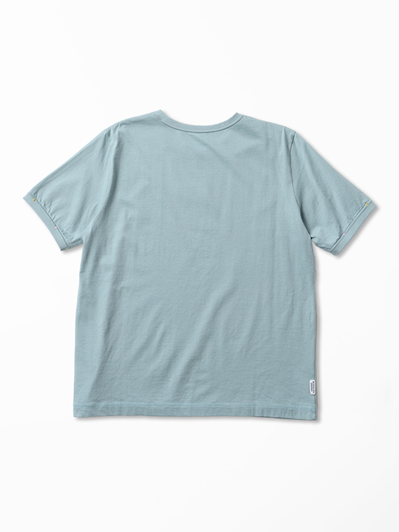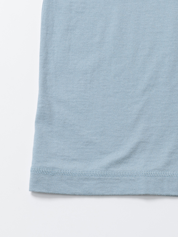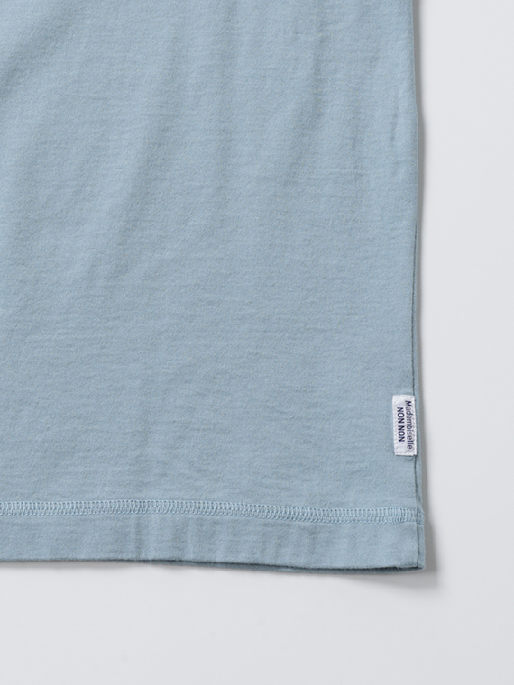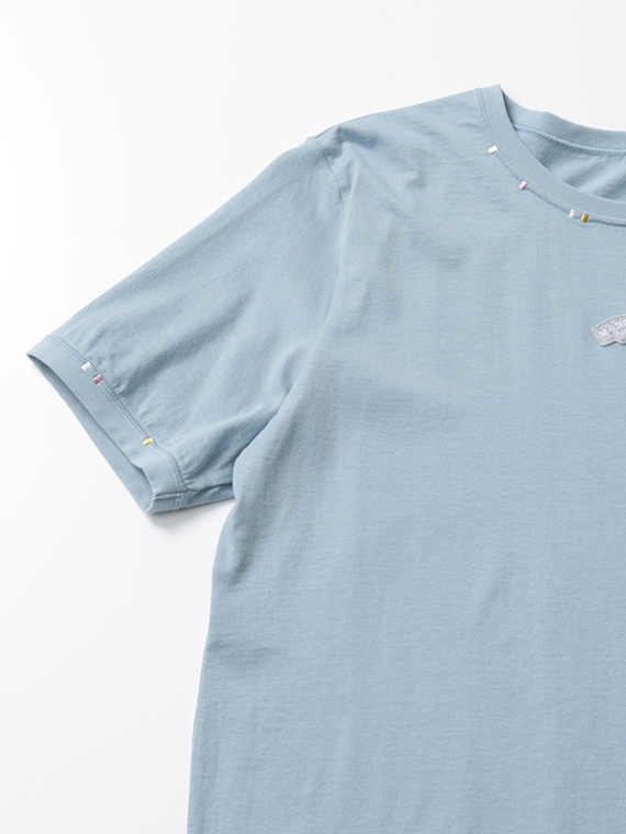 60/2コンパクト糸を使用しています。2本の糸を同じ撚り数にして、丁寧に双糸加工を施すことで斜行を軽減しています。染色はなるべく化学薬品は使用せず、生地に負荷をかけずに、優しく、丁寧に、空気を含ませながら染色しています。コンパクト糸の綺麗な表面感と肌触り、環境に優しい染色方法で仕上げた着心地の良い天竺です。