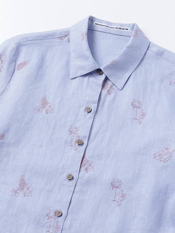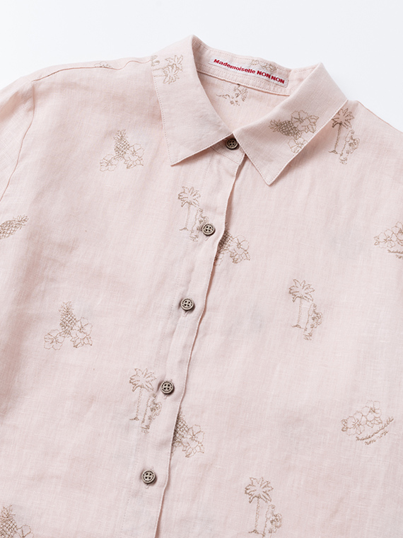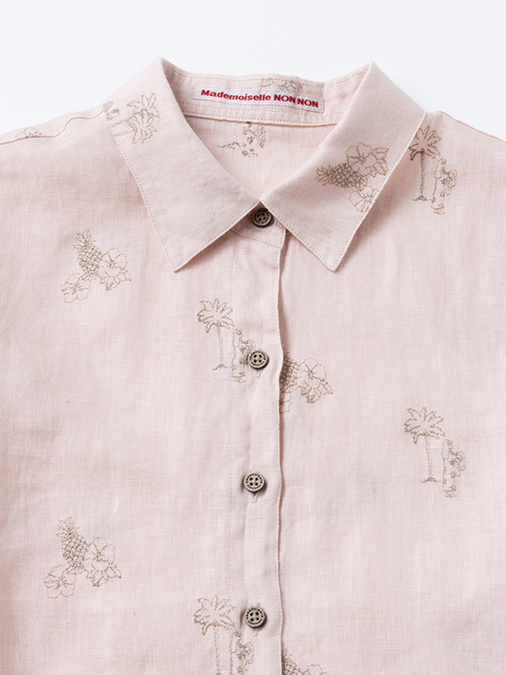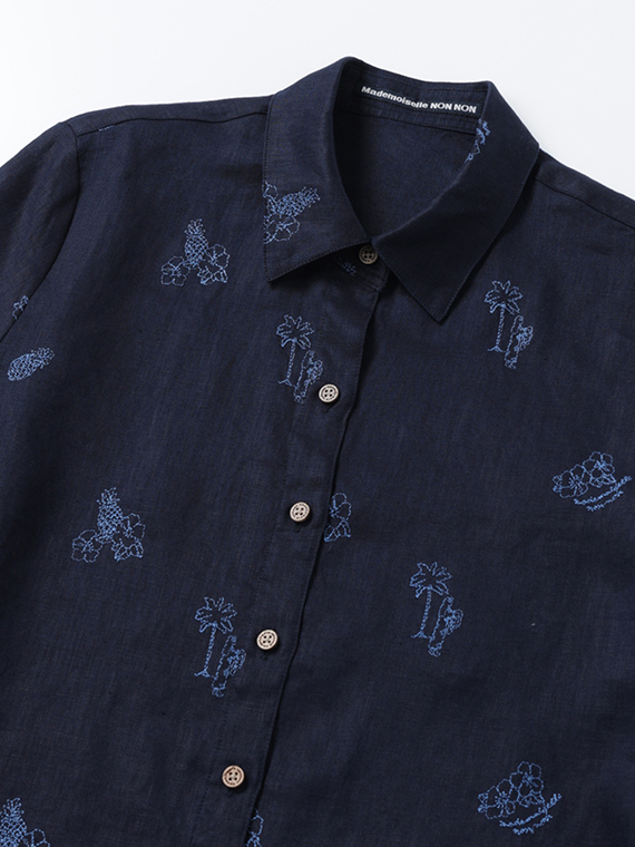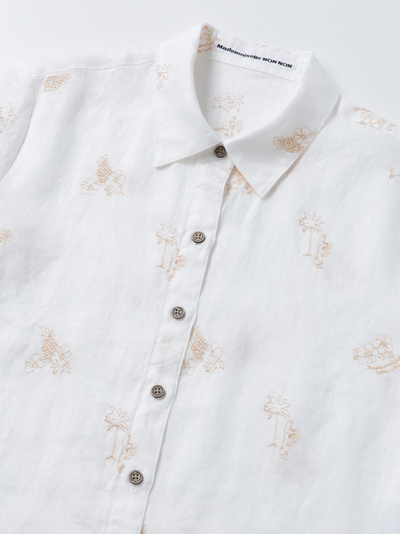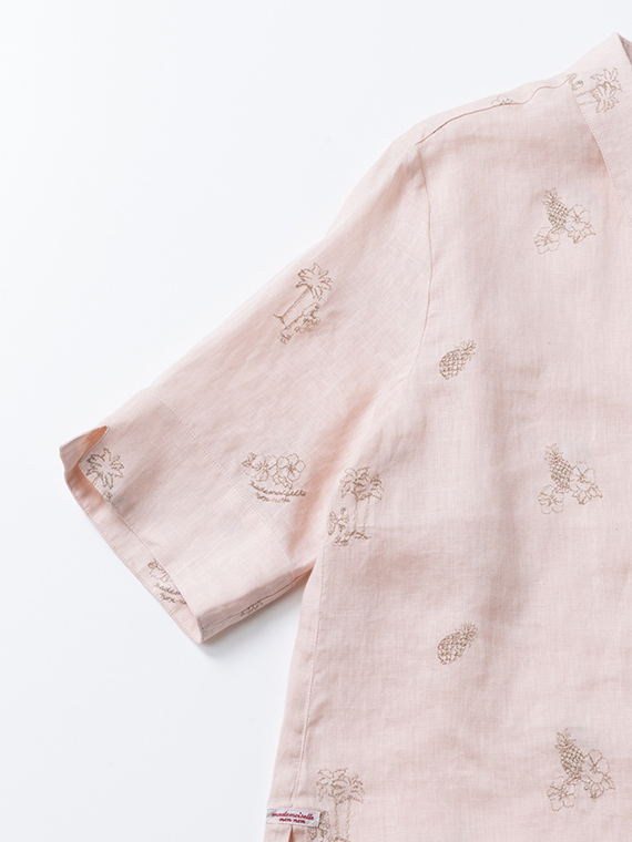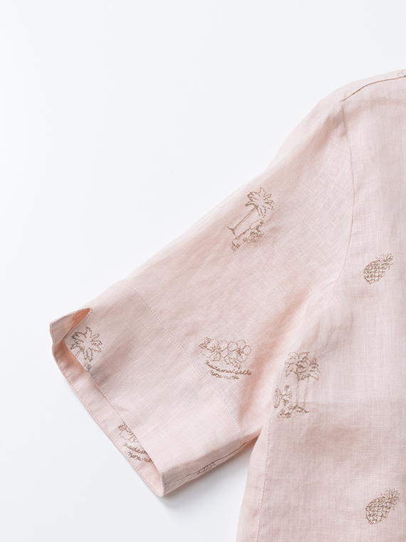 下生地は60/1リネンキャンバスです。最後のエアフロー加工でソフトな風合いに仕上げた素材です。夏の定番モチーフでもあるハワイに関するフラガール、ヤシ、ハイビスカス、パイナップルと『medemoiselle nonnon』を組み合わせて少し小さめにサイズを設定しました。光沢感、清涼感のある生地で単色のシンプルなステッチで、カジュアルで着やすい刺繍柄となりました。