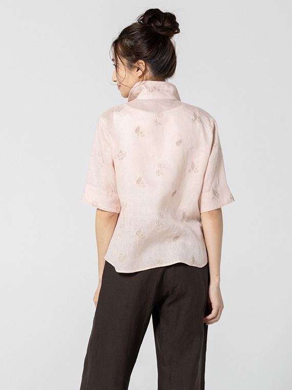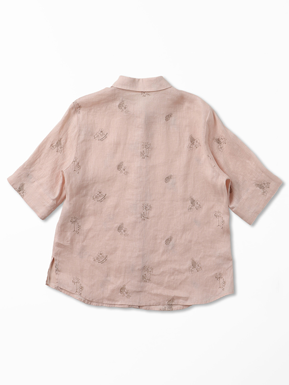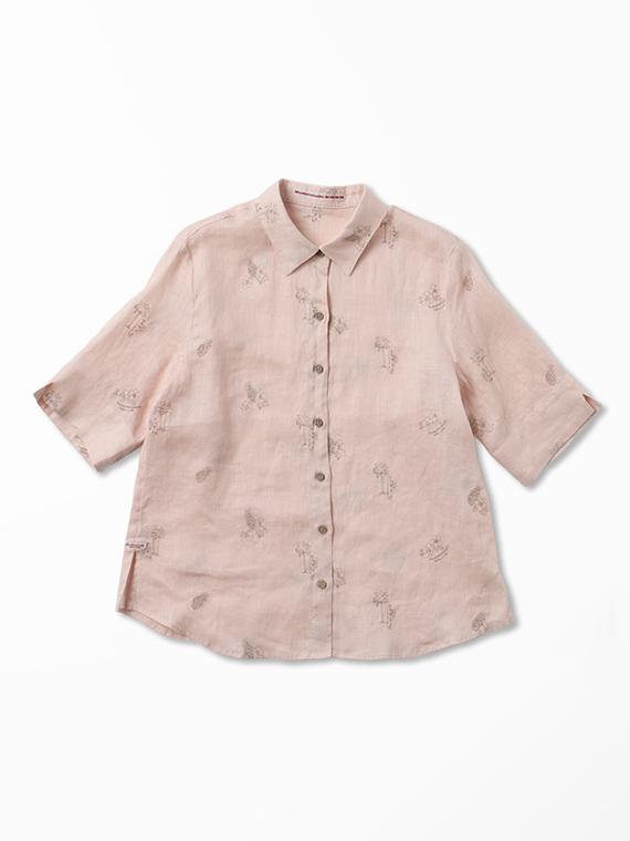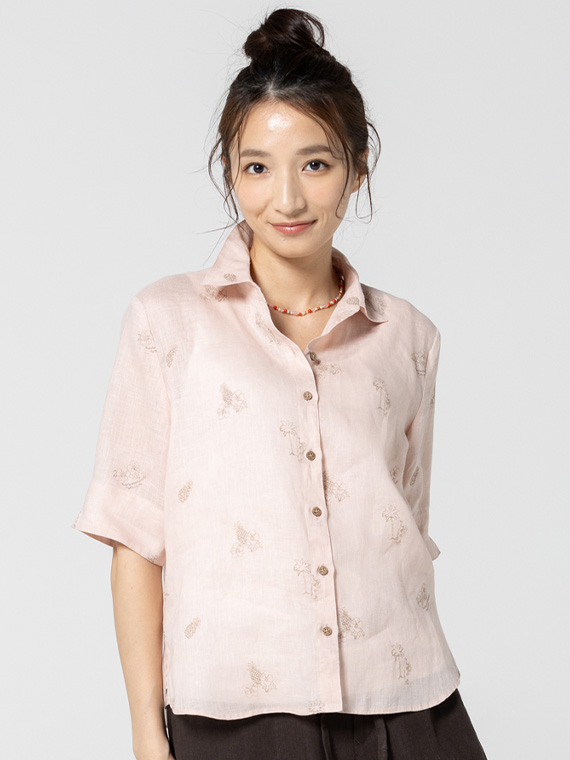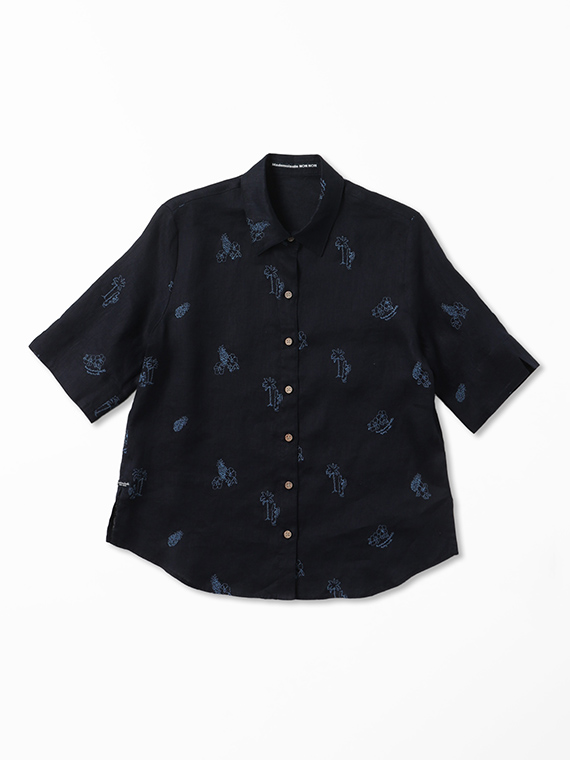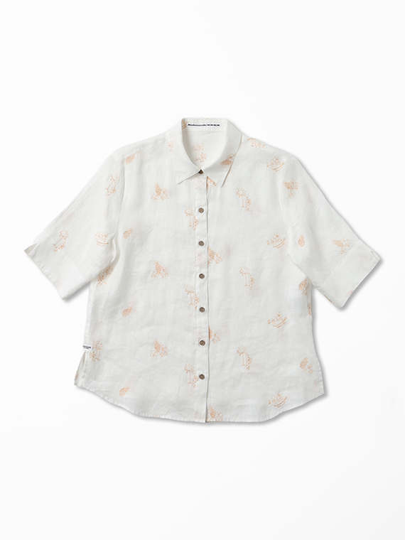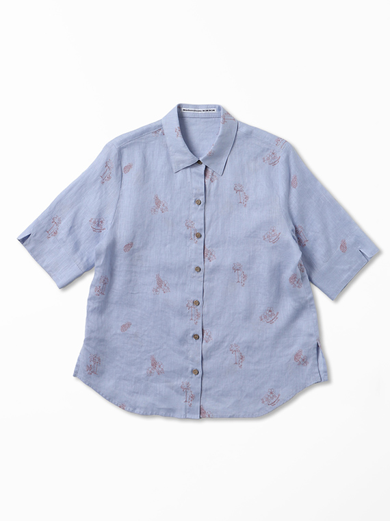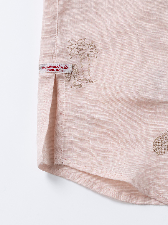 下生地は60/1リネンキャンバスです。最後のエアフロー加工でソフトな風合いに仕上げた素材です。夏の定番モチーフでもあるハワイに関するフラガール、ヤシ、ハイビスカス、パイナップルと『medemoiselle nonnon』を組み合わせて少し小さめにサイズを設定しました。光沢感、清涼感のある生地で単色のシンプルなステッチで、カジュアルで着やすい刺繍柄となりました。