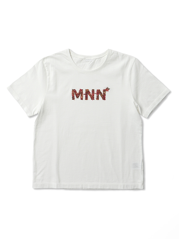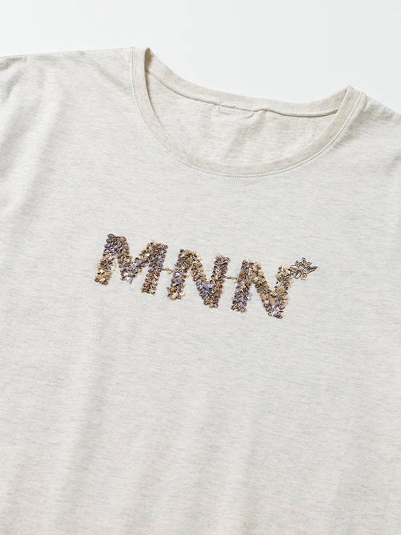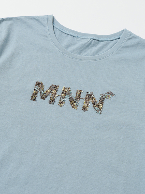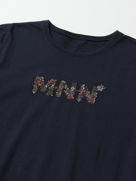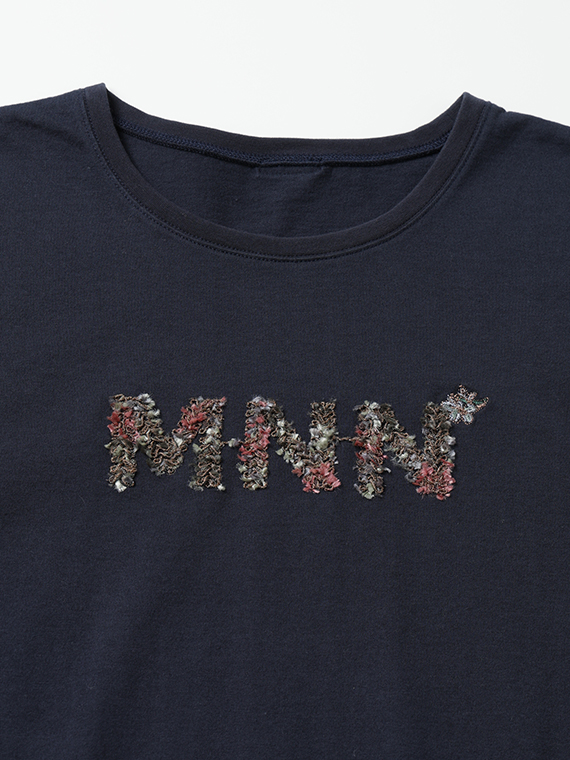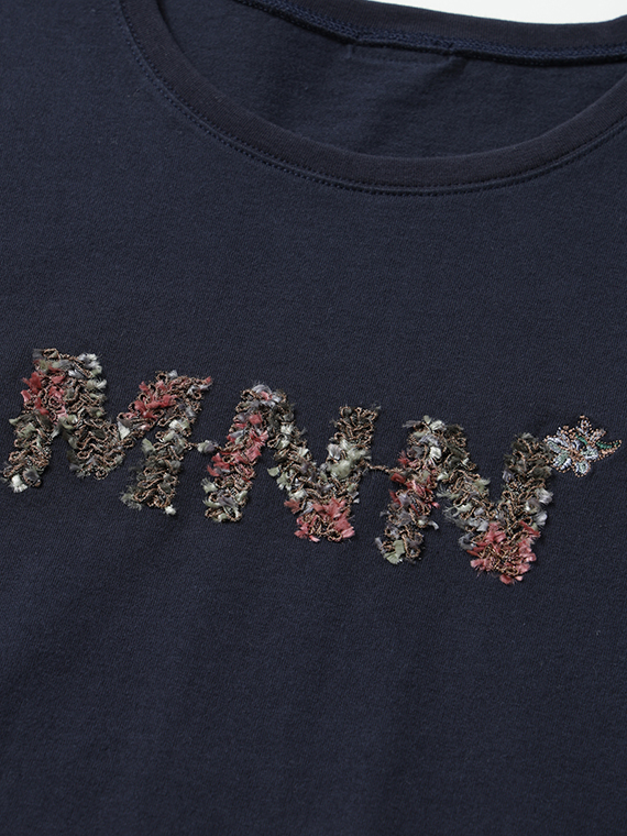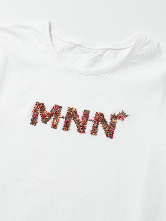 前身頃にはMNNロゴとフラワーを、意匠糸刺繍と4色刺繍で立体的に表現しました。