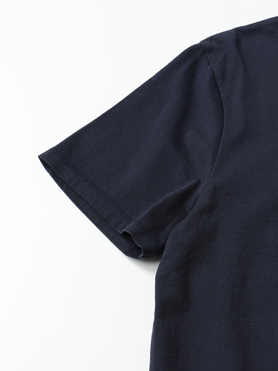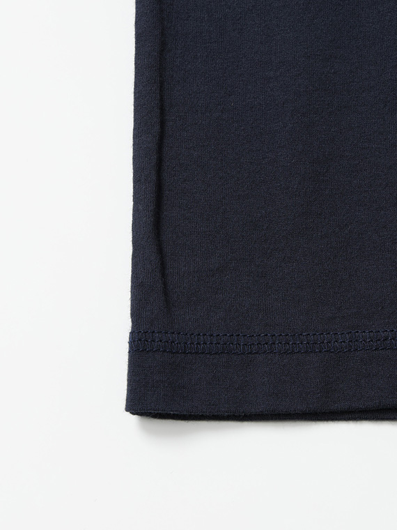 60/2コンパクト糸を使用しています。2本の糸を同じ撚り数にして、丁寧に双糸加工を施すことで斜行を軽減しています。染色はなるべく化学薬品は使用せず、生地に負荷をかけずに、優しく、丁寧に、空気を含ませながら染色しています。コンパクト糸の綺麗な表面感と肌触り、環境に優しい染色方法で仕上げた着心地の良い天竺です。