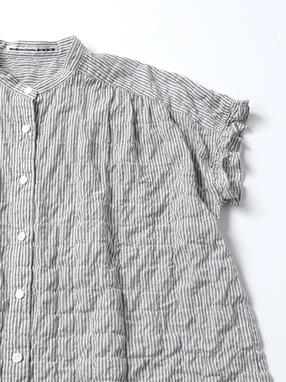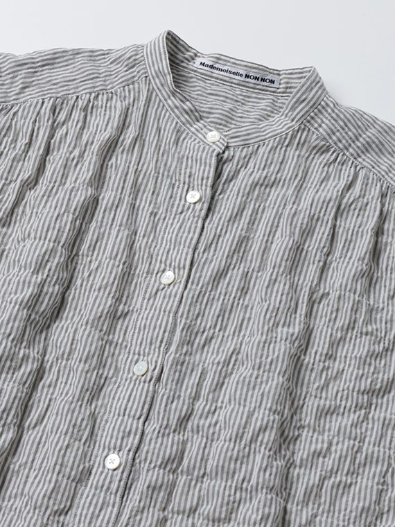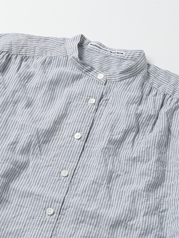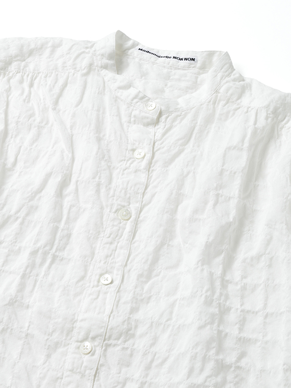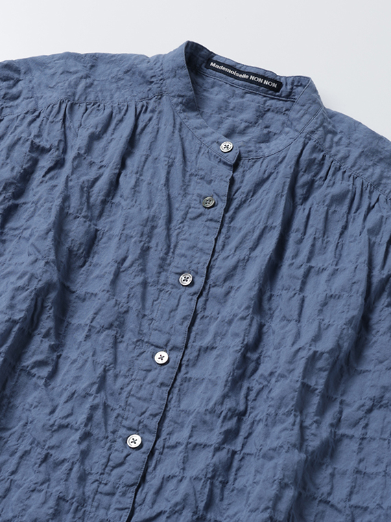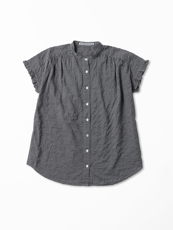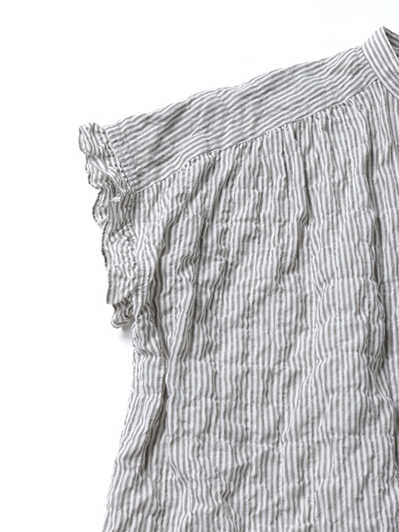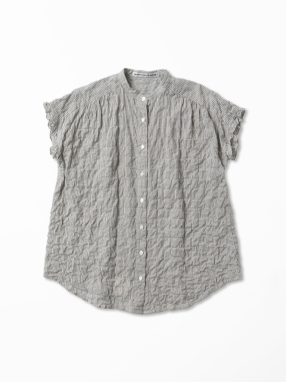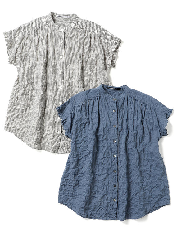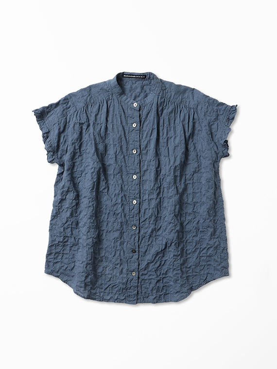 すっきりとしたバンドカラーに、フレンチスリーブと袖口の共地フリルがやさしい表情を添えます。涼しげで女性らしい着こなしが楽しめる一枚です。