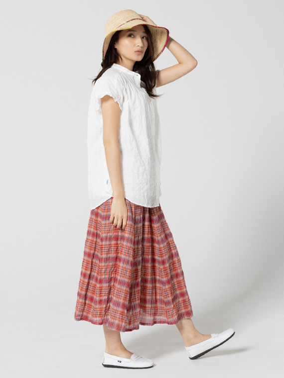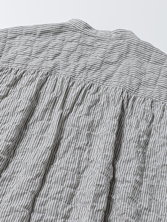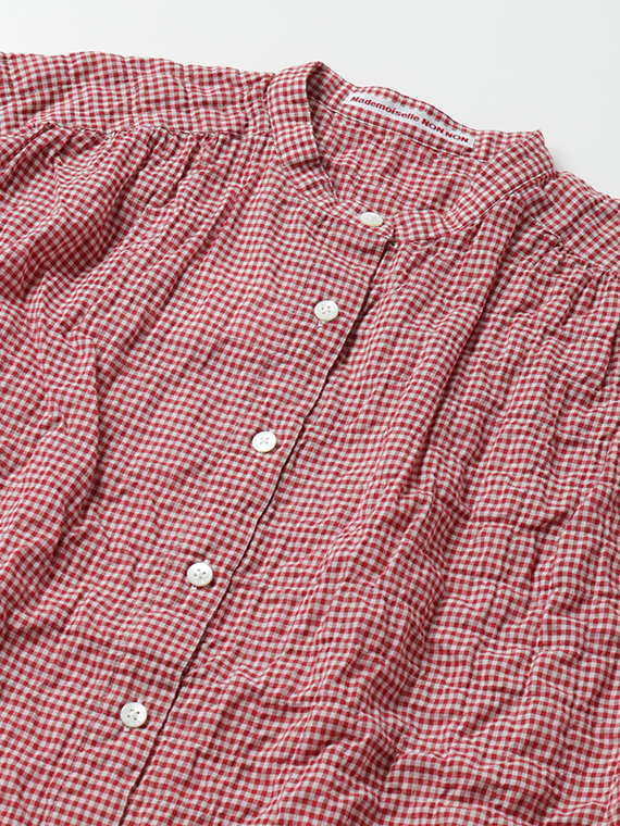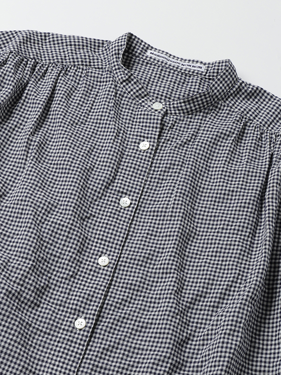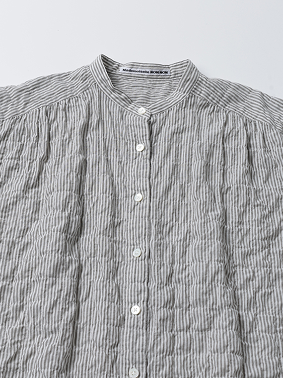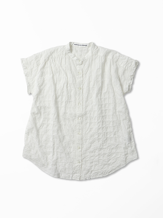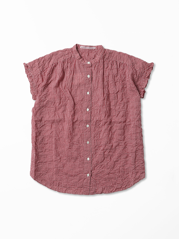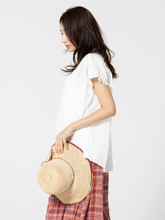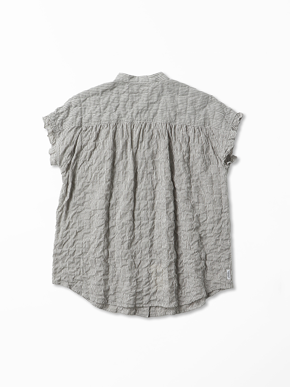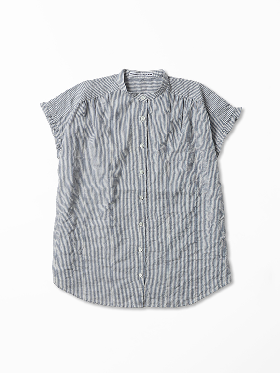すっきりとしたバンドカラーに、フレンチスリーブと袖口の共地フリルがやさしい表情を添えます。涼しげで女性らしい着こなしが楽しめる一枚です。