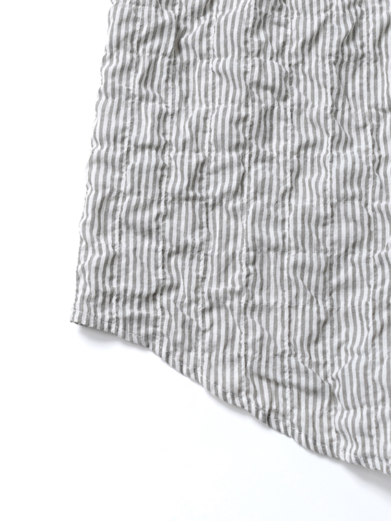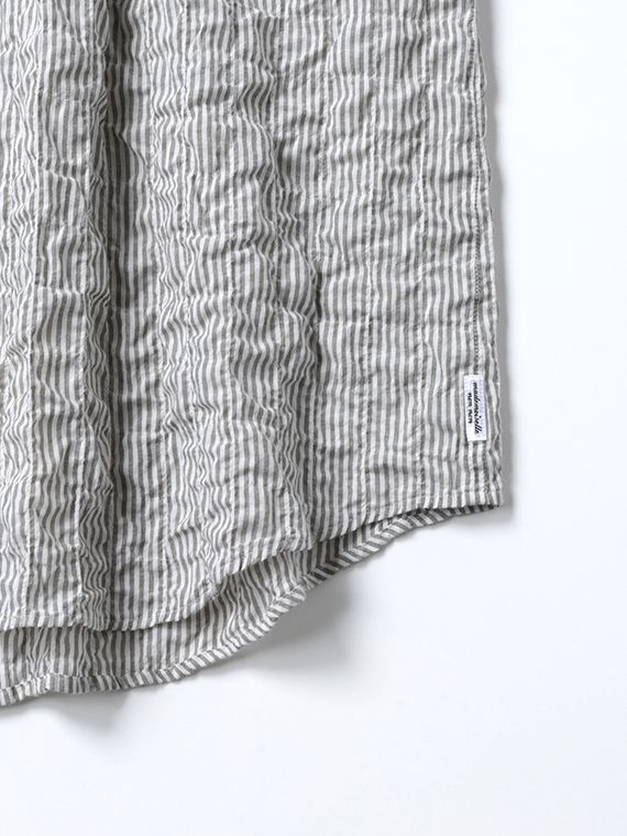 タテ糸・ヨコ糸共に70/1綿コンパクト糸のローンシャーリングです。綺麗で極細な糸を使用してエアリアルに織り上げました。C/#01と02は無地。C/#03・04はギンガムチェック。C/#05・06はストライプの展開です。タテ糸・ヨコ糸共にポリウレタン糸を部分的に配置し、仕上げにソフトワッシャー加工を施すことで通常のワッシャー加工では表現出来ない立体感のある表情と独特のシボ感が生まれました。原料の良さによるソフトな風合いも特徴です。