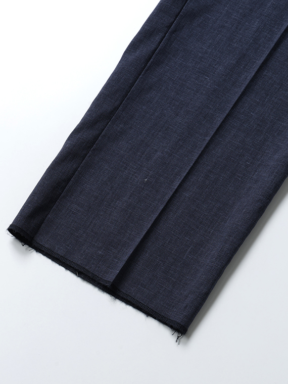 経糸にポリエステル/リネン混紡糸、緯糸には同混紡糸とソロテックスを交互に配置した、平織のストレッチ素材を使用。ニ浴染によってポリエステルとリネンそれぞれに色差をつけ、奥行きのあるTOP調の表情を表現しています。さらにエアワッシャーとバイオ加工を施すことで、清涼感とほどよいラスティックな風合いをプラス。ナチュラルな質感とストレッチ性を兼ね備えた、快適な穿き心地が魅力の素材です。