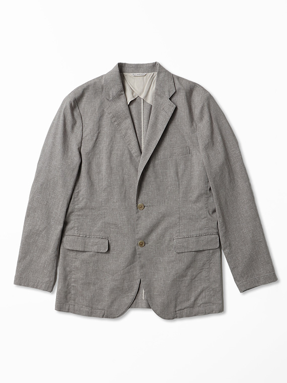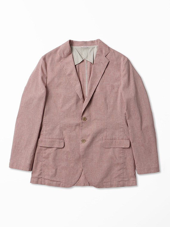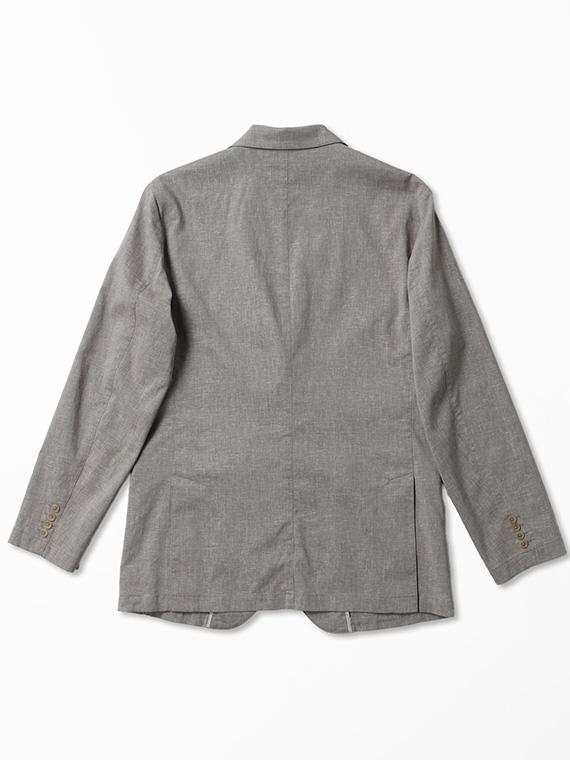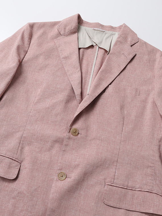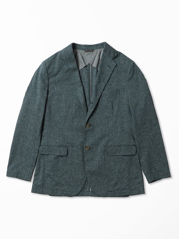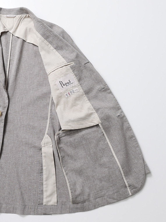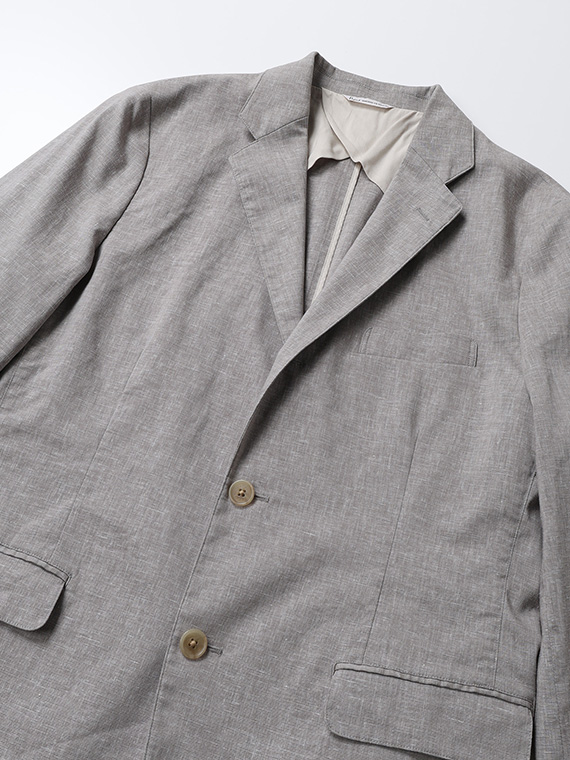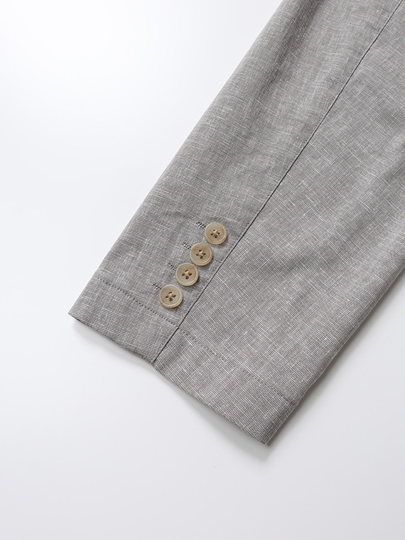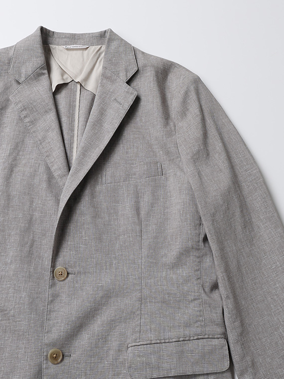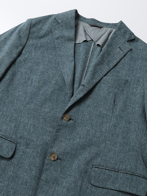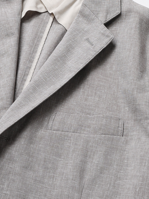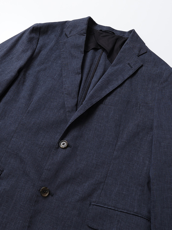経糸にポリエステル/リネン混紡糸、緯糸には同混紡糸とソロテックスを交互に配置した、平織のストレッチ素材を使用。ニ浴染によりポリエステルとリネンそれぞれに色差をつけ、奥行きのあるTOP調の表情を表現しています。さらにエアワッシャーとバイオ加工を施すことで、清涼感とほどよいラスティックな風合いをプラス。ナチュラルな質感とストレッチ性を兼ね備えた、軽やかで快適な着心地を楽しめる素材です。