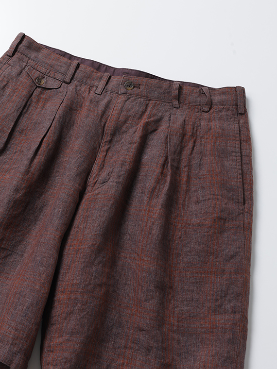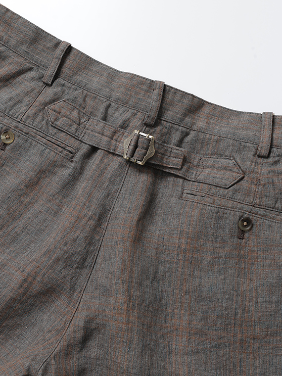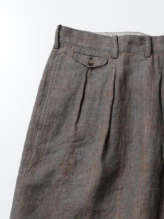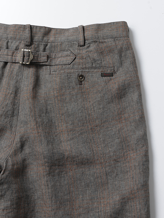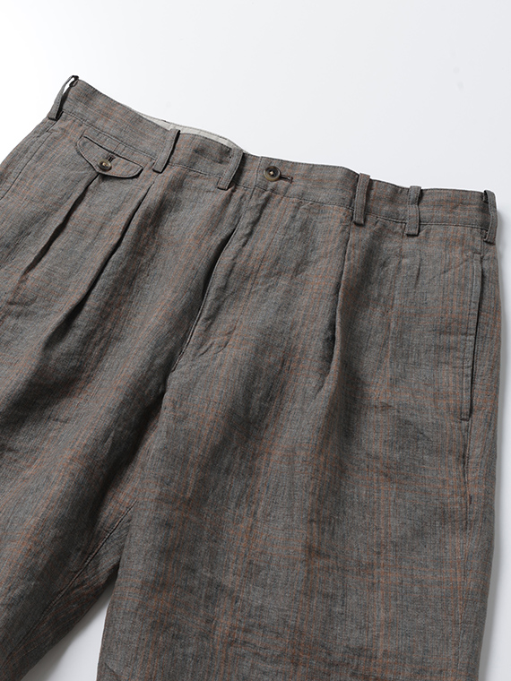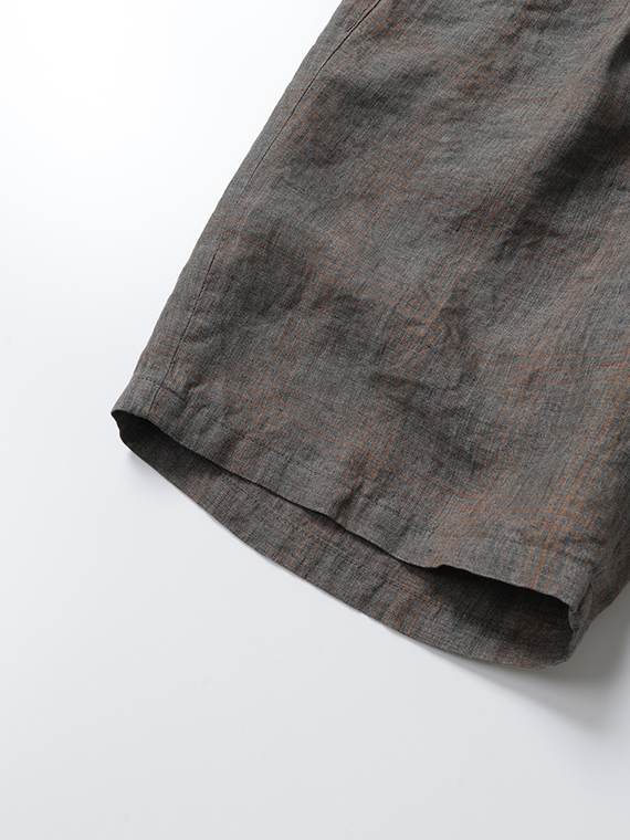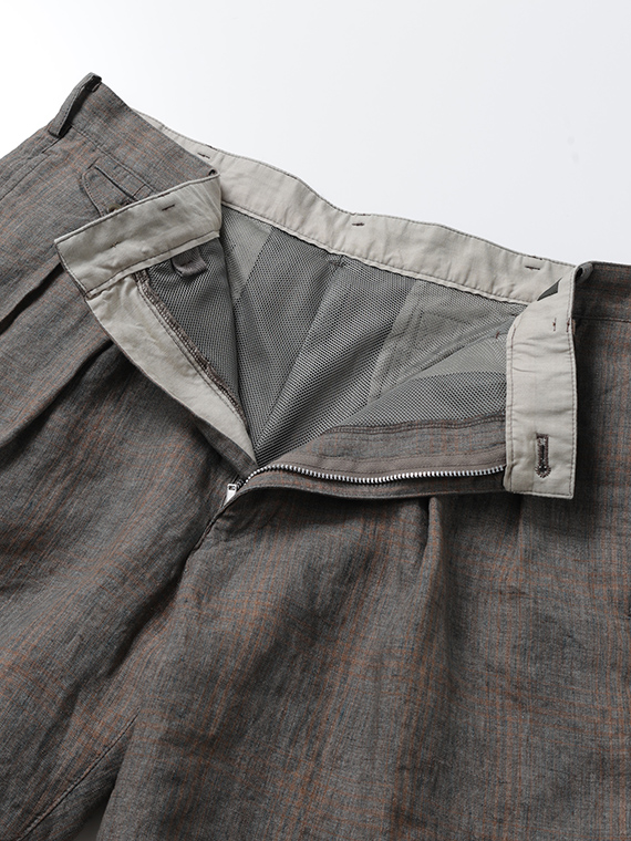 イタリア・トスカーナ地方プラトーに拠点を置く「LEOMASTER」社の素材を使用。リネン100%の糸を特殊な染色方法(染料顔料)で染め上げ、平織で仕上げた素材です。洗い晒したようなミックス調のフェード感に、奥行きのあるシャドウチェックが重なり、上品なヴィンテージ感を演出。リネン特有の清涼感と軽やかさを兼ね備え、春夏シーズンに最適な素材に仕上がっています。