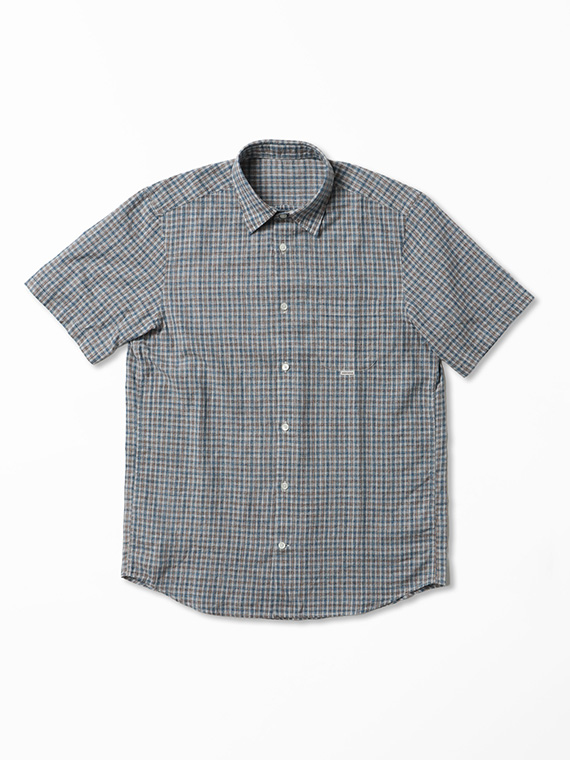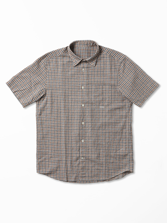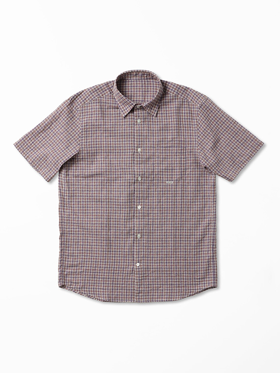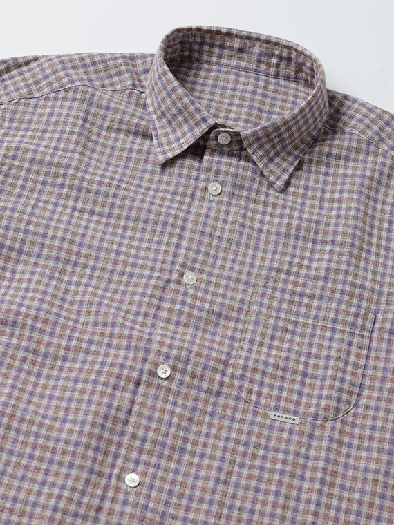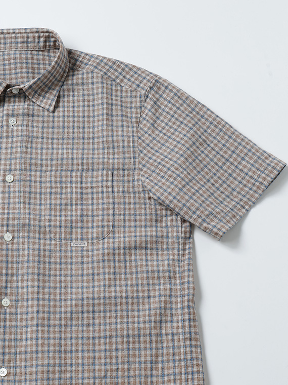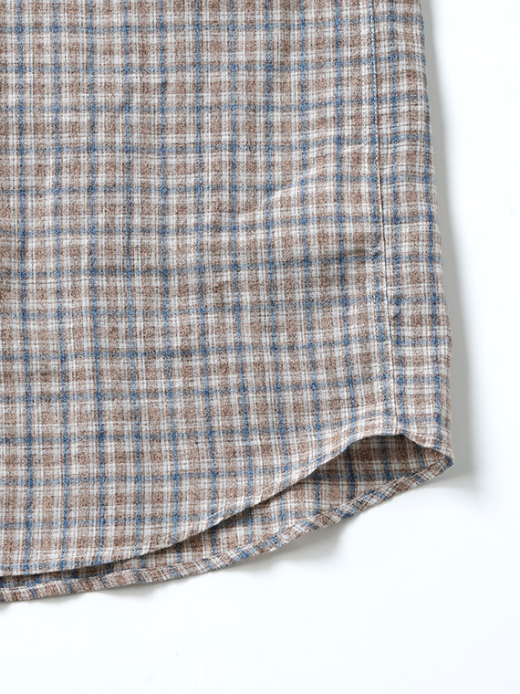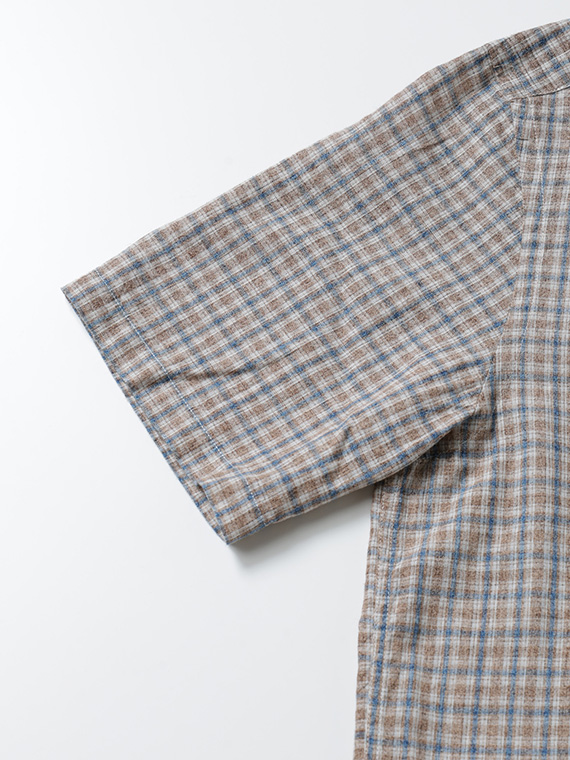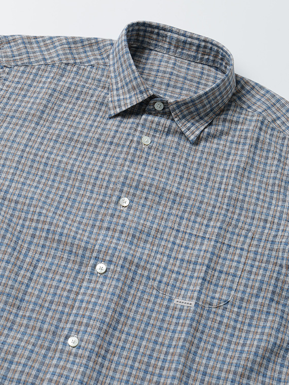 タテ・ヨコ糸ともに30/1の綿麻混紡糸を使用した平織チェック素材。スペック染め(ムラ染め)を施すことで、奥行きのあるTOP調のカラーリングを表現しています。さらにエアーワッシャー加工により、ナチュラルでやさしい風合いと柔らかな肌触りを実現。軽やかで通気性にも優れ、春夏に快適な着心地を楽しめる素材です。