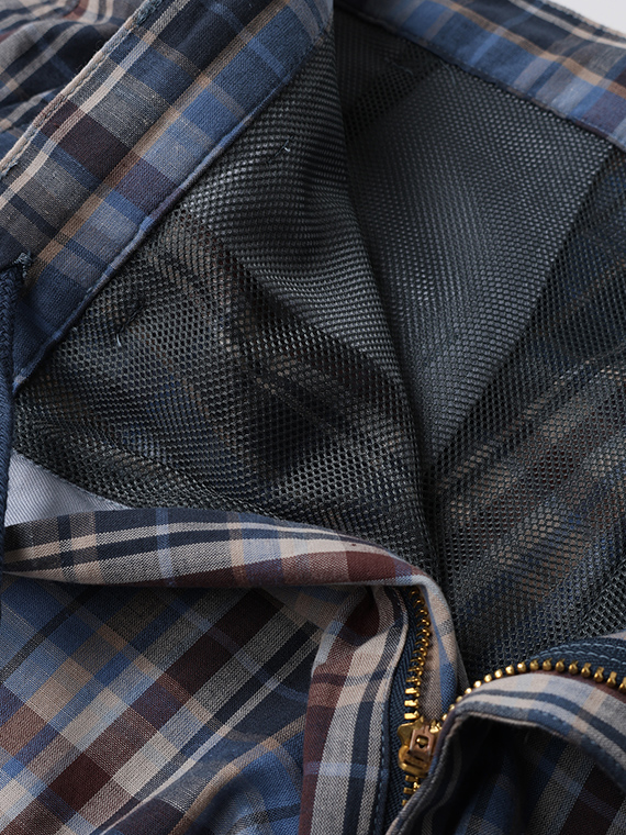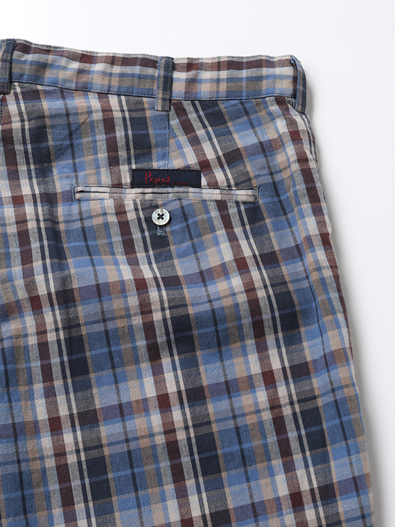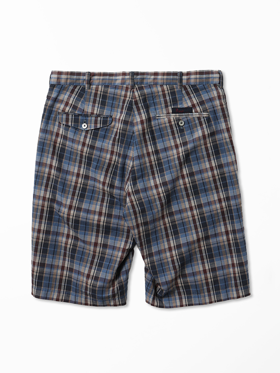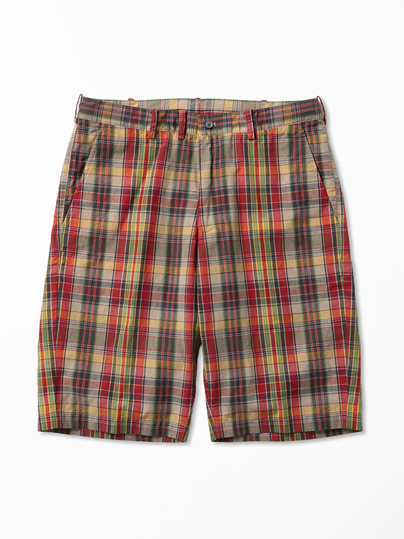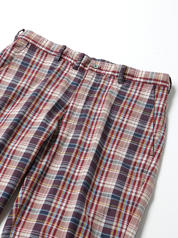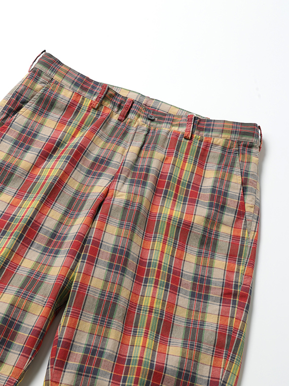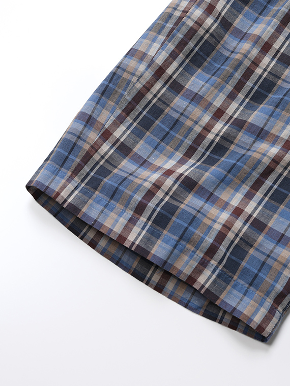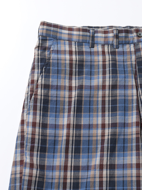 タテ糸に40/1コットン、ヨコ糸にコットン/リネンの混紡糸を使用した、マドラスチェック柄の平織素材を使用。リネン特有のスラブ感とインドマドラスを思わせるチェックが、ナチュラルで程よくカジュアルな雰囲気を演出します。仕上げにワッシャー加工を施し、しっかりと揉み込むことで、軽やかでやわらかな風合いに仕上げました。
