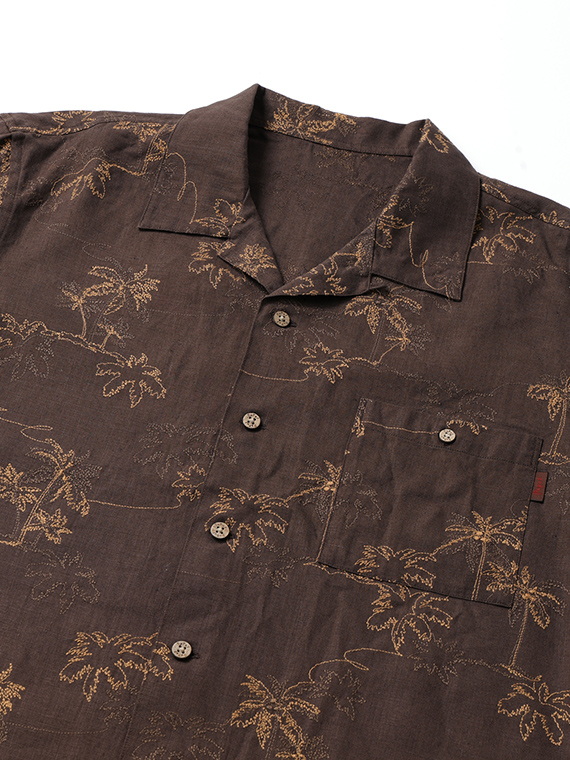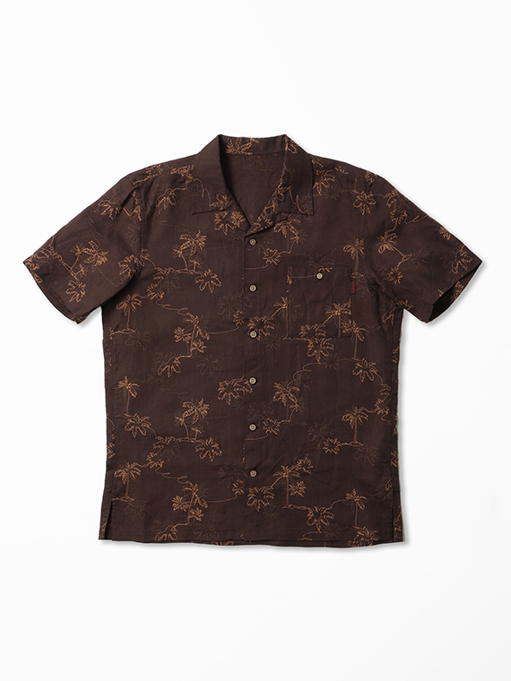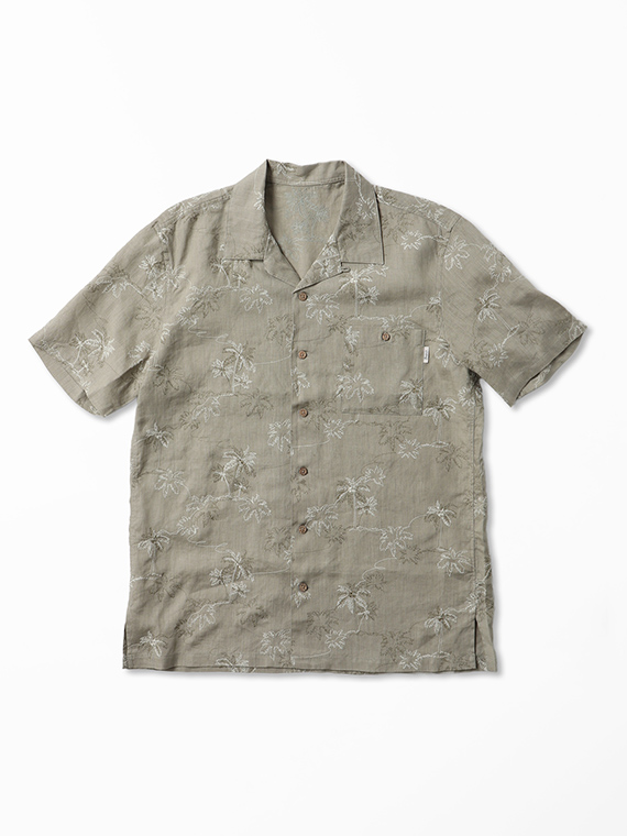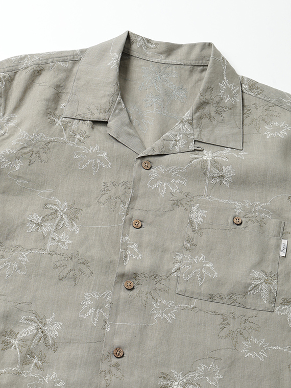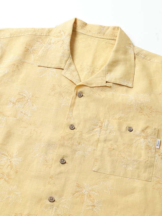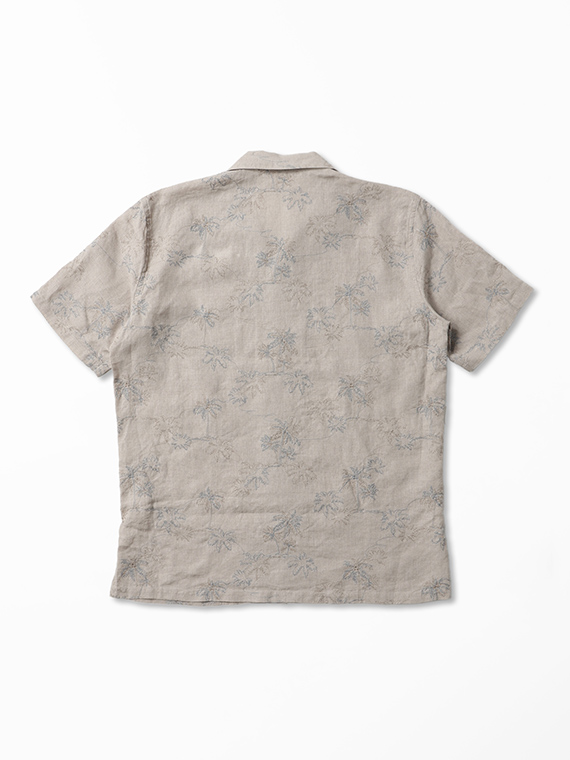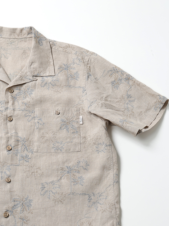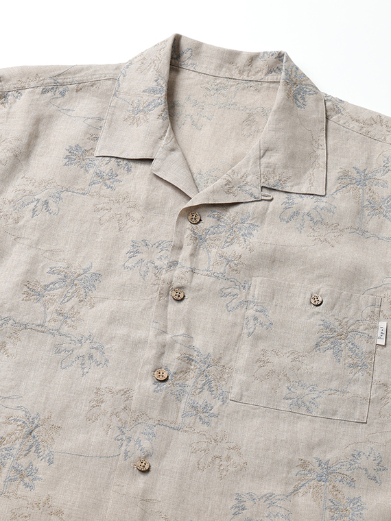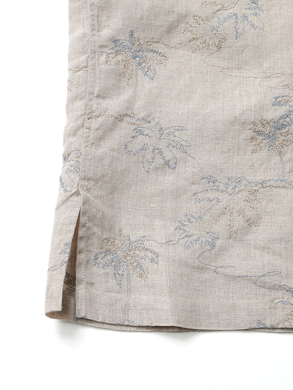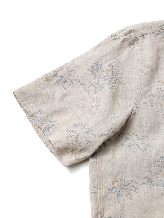 60/1のフレンチリネンを使用した、軽やかで上質な素材。リネンならではの清涼感とナチュラルな風合いが魅力で、春夏シーズンに快適な着心地を提供します。刺繍にはコットンの60/2と40/2を組み合わせ、細さの異なる糸で2色使いにすることで、奥行きと立体感のある表現に仕上げています。