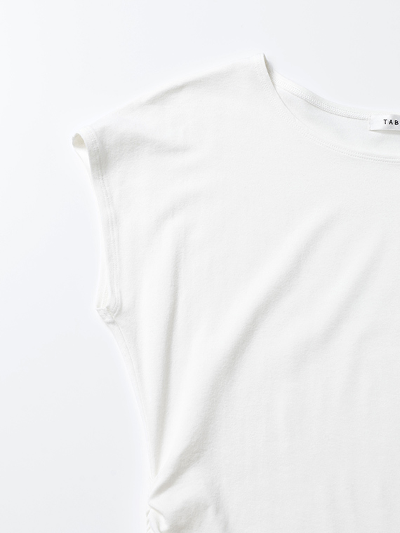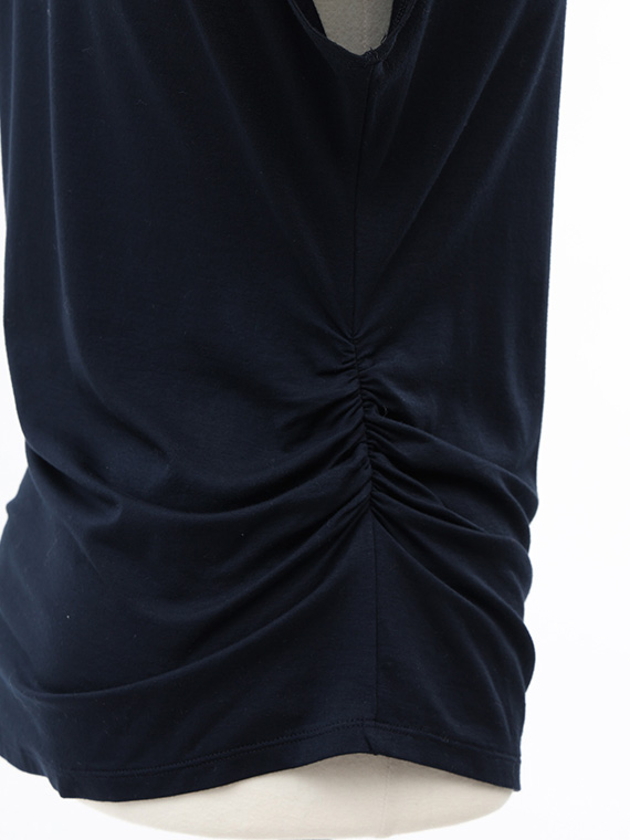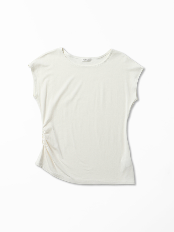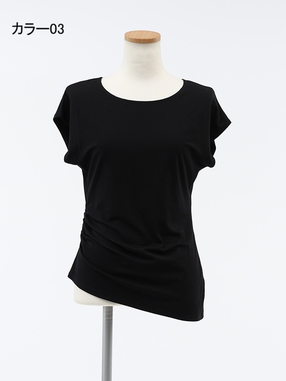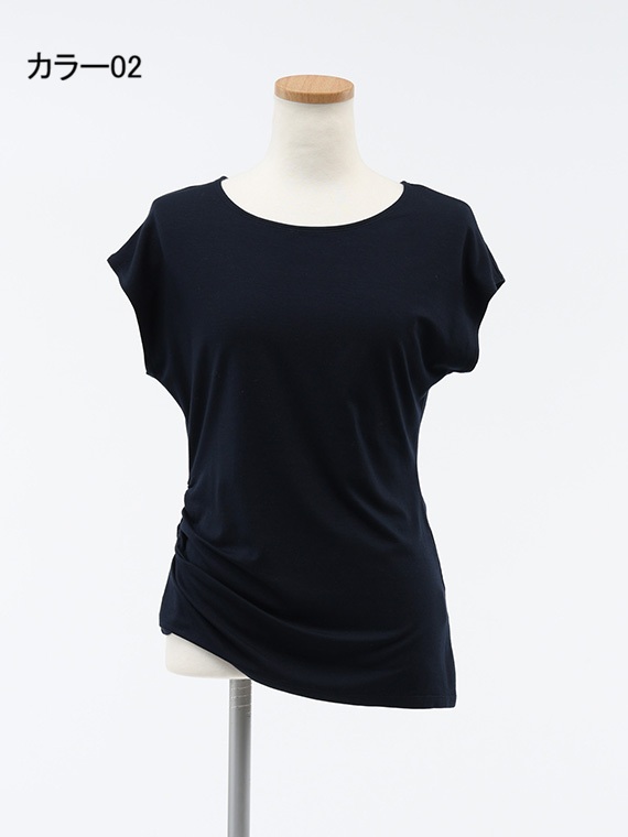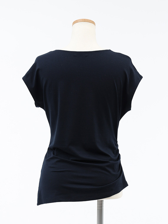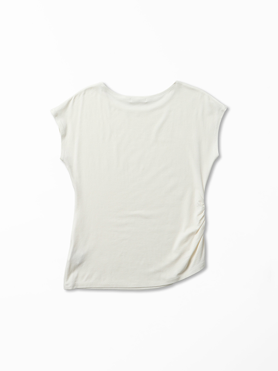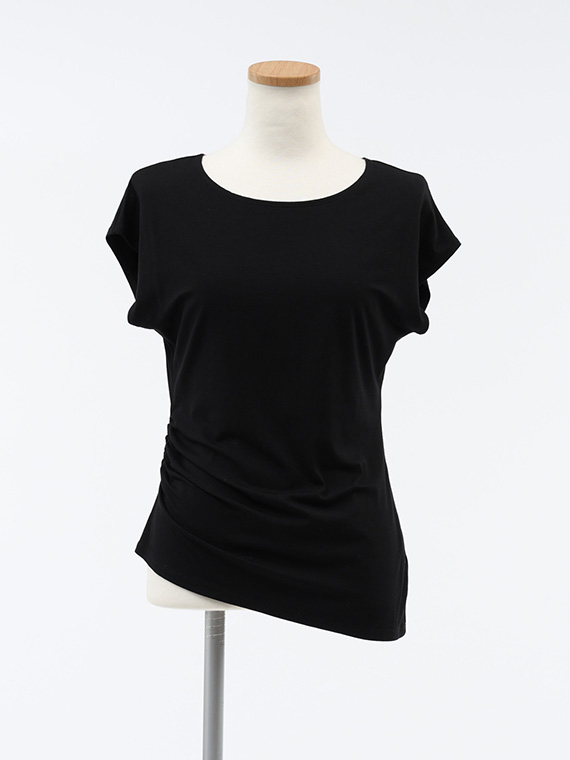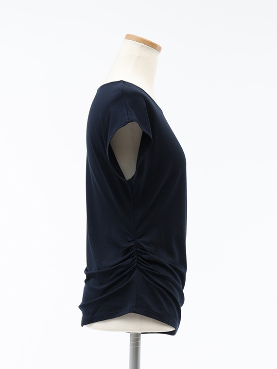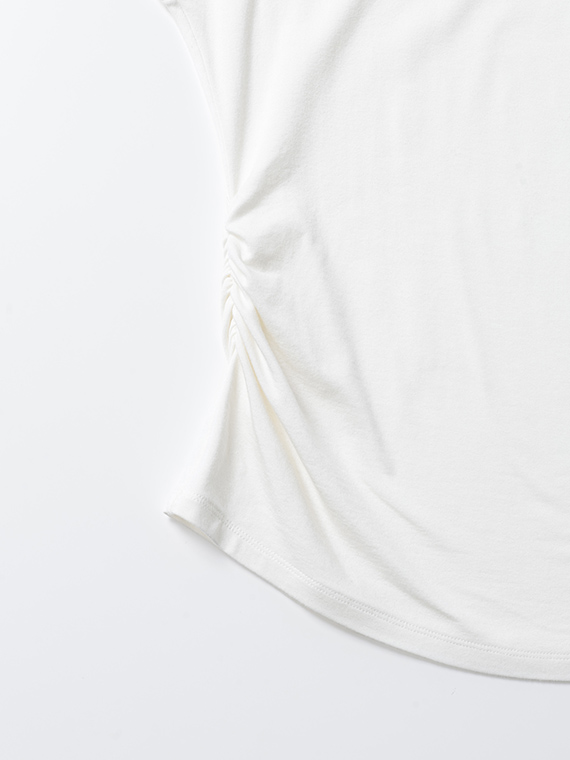 右脇にだけ寄せたシャーリングが、お腹周りをさりげなくカバーしつつ、洗練されたこなれ感を演出してくれます。