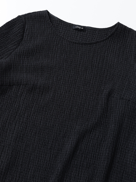 このお洋服の最大の魅力は、タテ糸とヨコ糸を複雑に絡ませて編み上げた、特殊なシャーリング素材にあります。