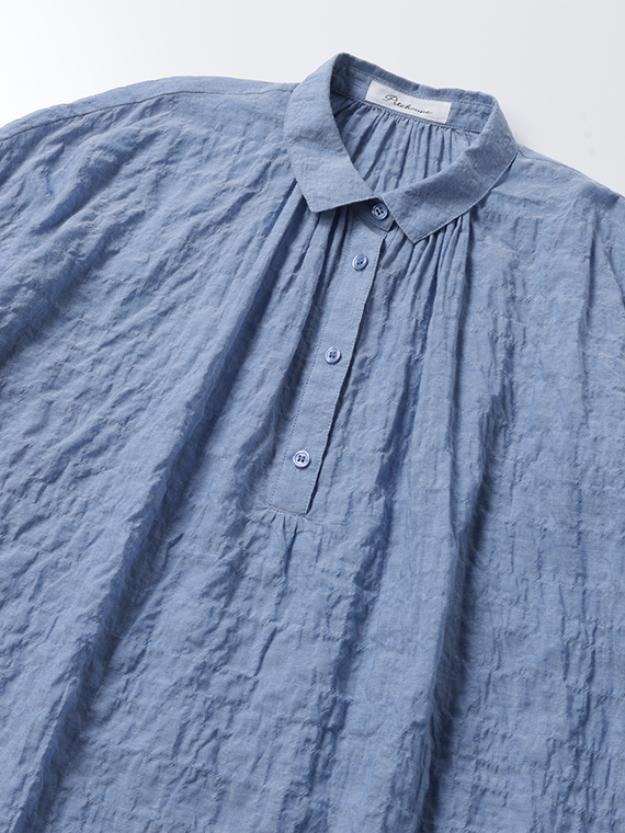 前開き下にもギャザーが入り、すとんと着るだけでサマになるふんわり感のある一着です。