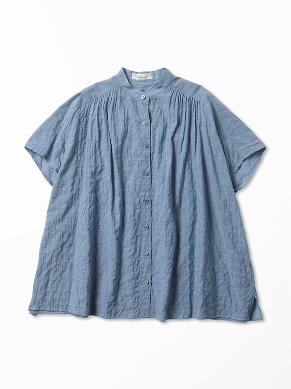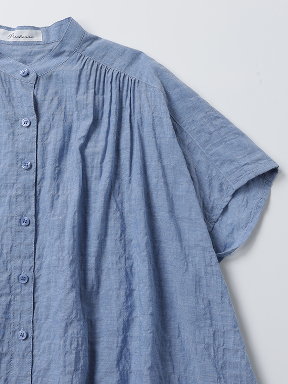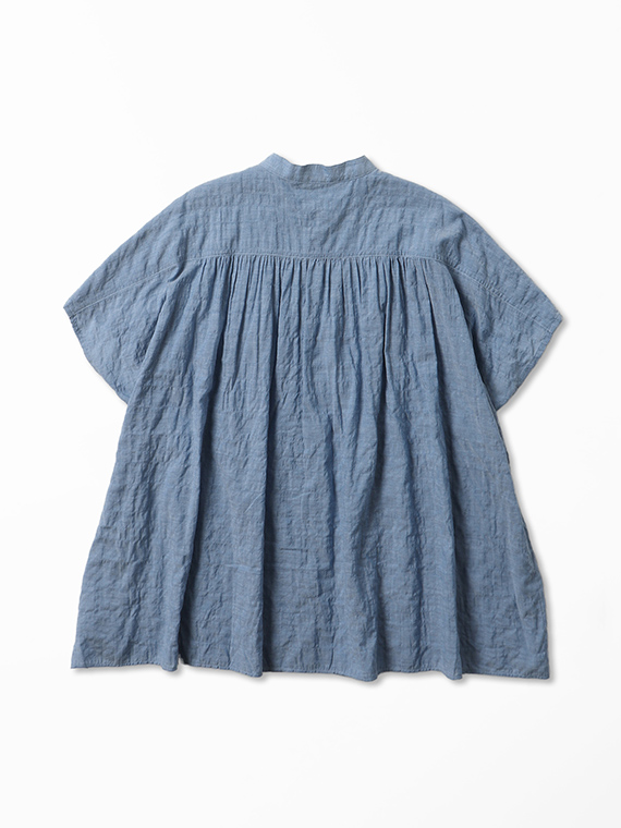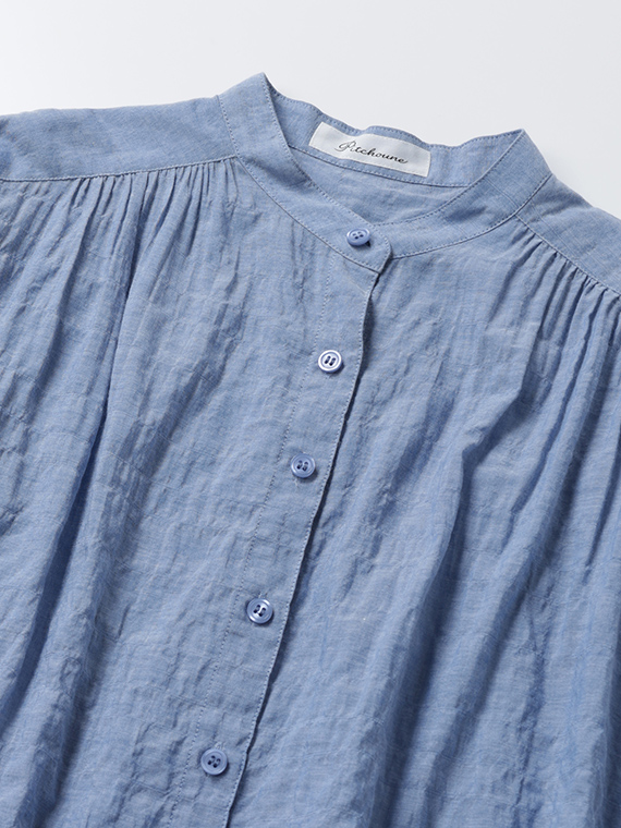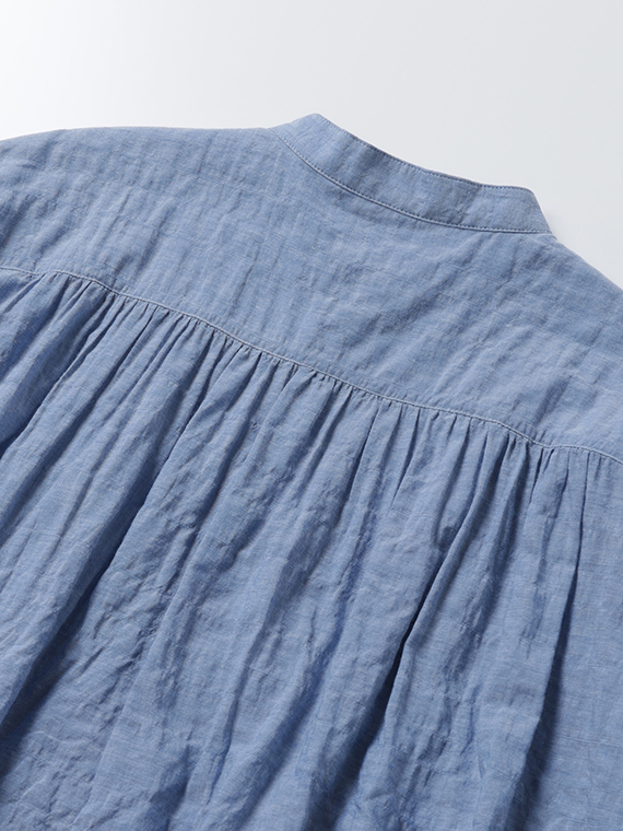 肩線をあえて少し前側に持ってくることで、お顔周りをスッキリと見せつつ、そこから前身頃へ、また後ろのヨーク下からたっぷりのギャザーを流れるように施しました。