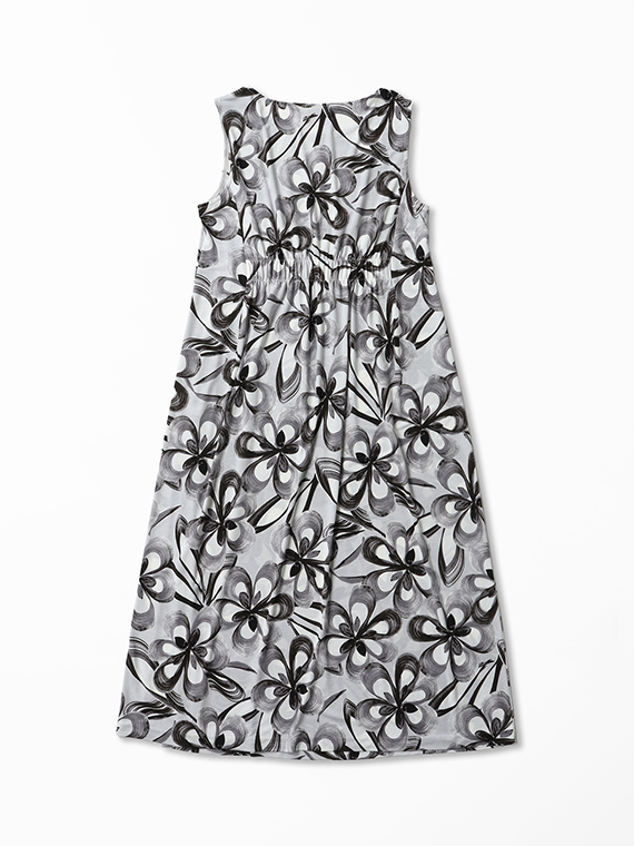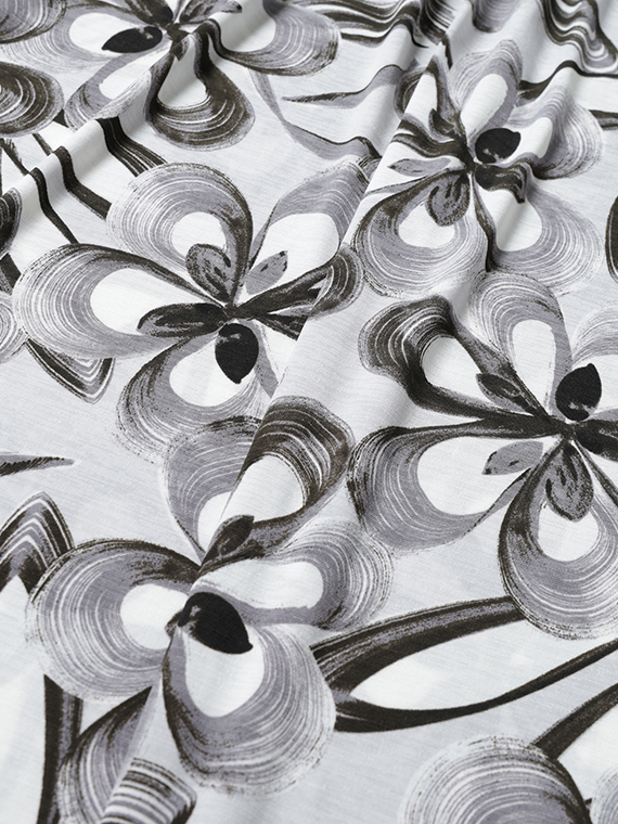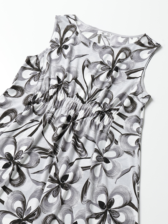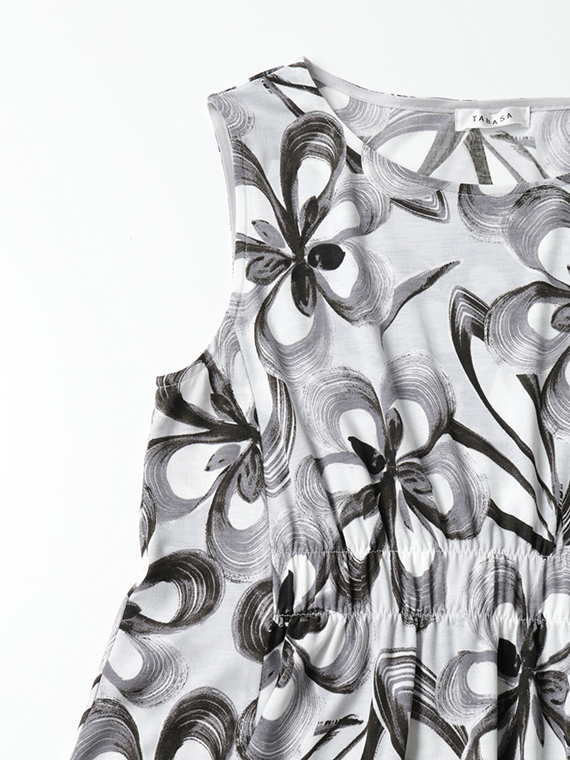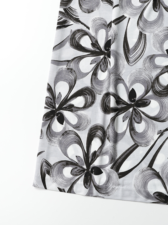 あえてワントーンで表現することで、大きな柄でありながらも主張しすぎず、大人の女性にふさわしい涼やかで都会的な表情に仕上げています。