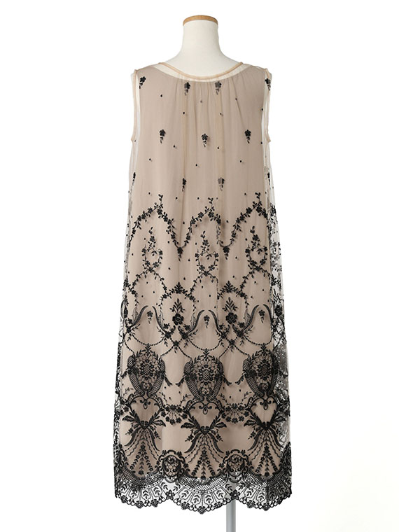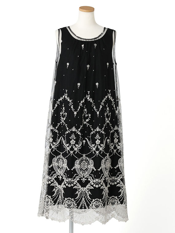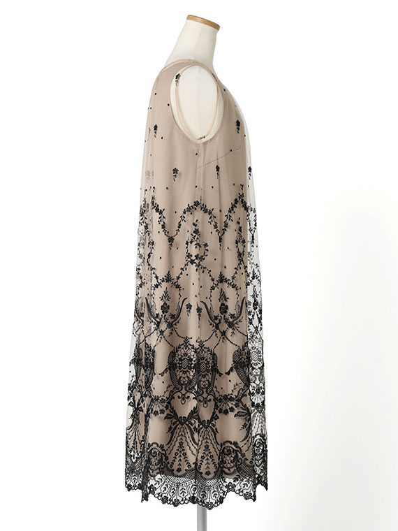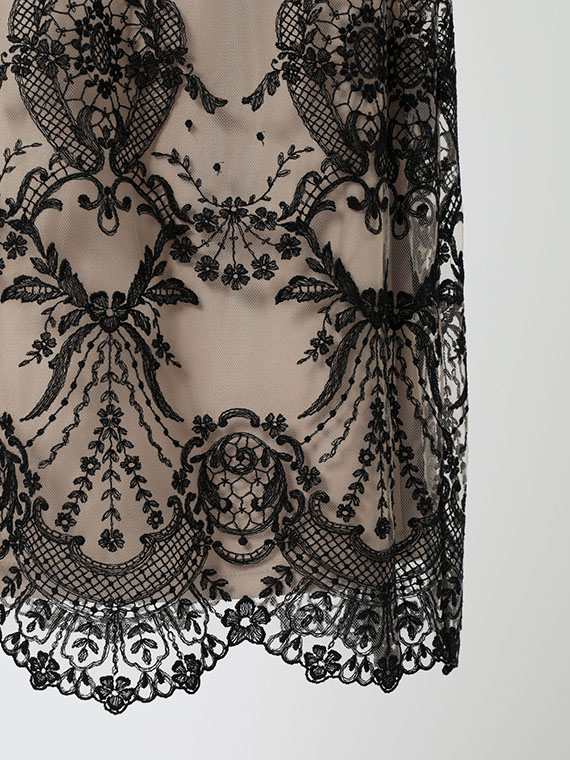 ベースに使用しているのは、空気を纏うような軽やかさを持つチュール素材で、その繊細なキャンバスに、細番手の糸でこれまた繊細なレース刺繍を贅沢に全面に施しました。