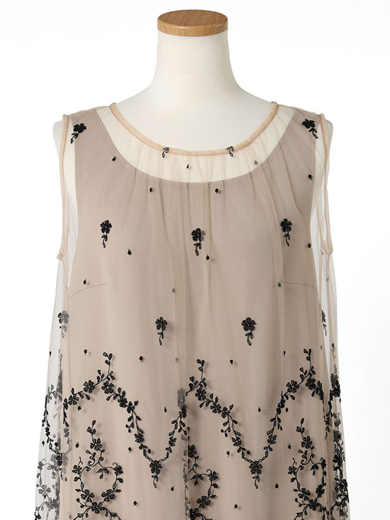 最大の見どころは、刺繍の密度の変化で、裾周りにはこれ以上ないほどたっぷりと重厚な刺繍を配し、肩に向かって徐々に刺繍の量を減らしていくグラデーションのようなデザインを採用しています。