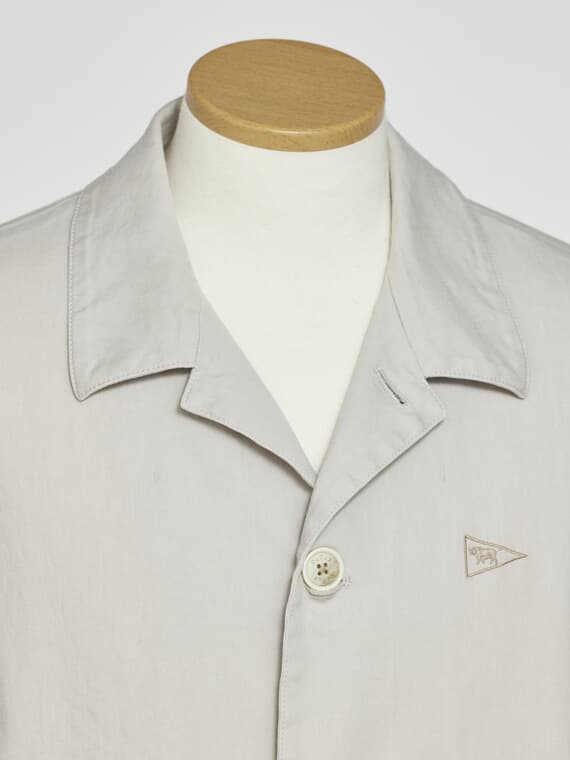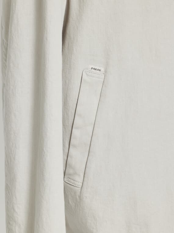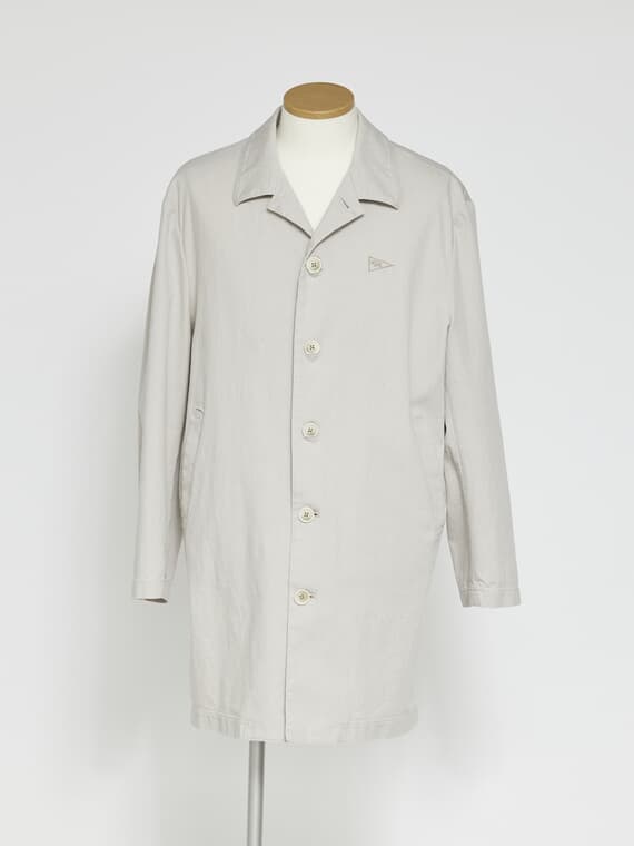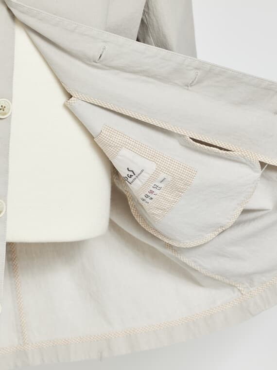 胸元のさりげないサイ刺繍、別布のギンガムチェックがパパスらしいポイントです。さっと羽織ってサマになるアウターはコーディネートに大活躍の一着。