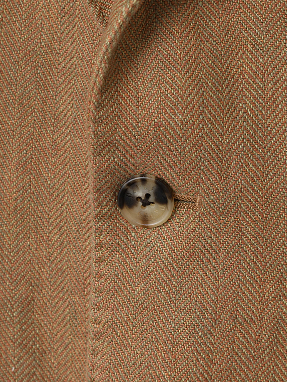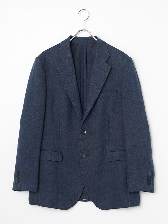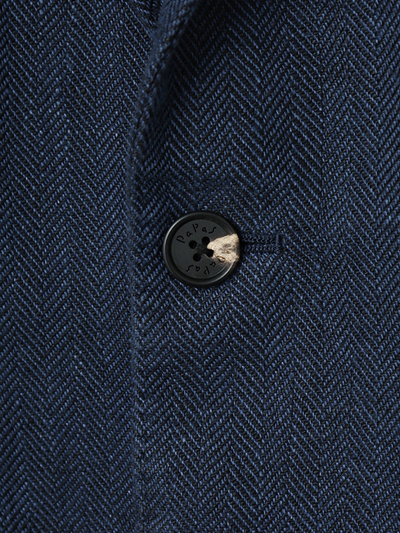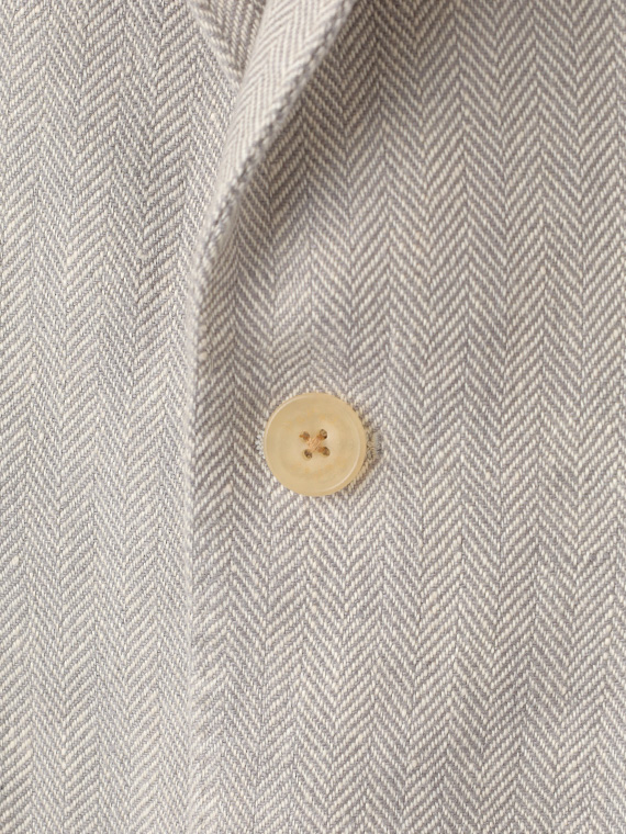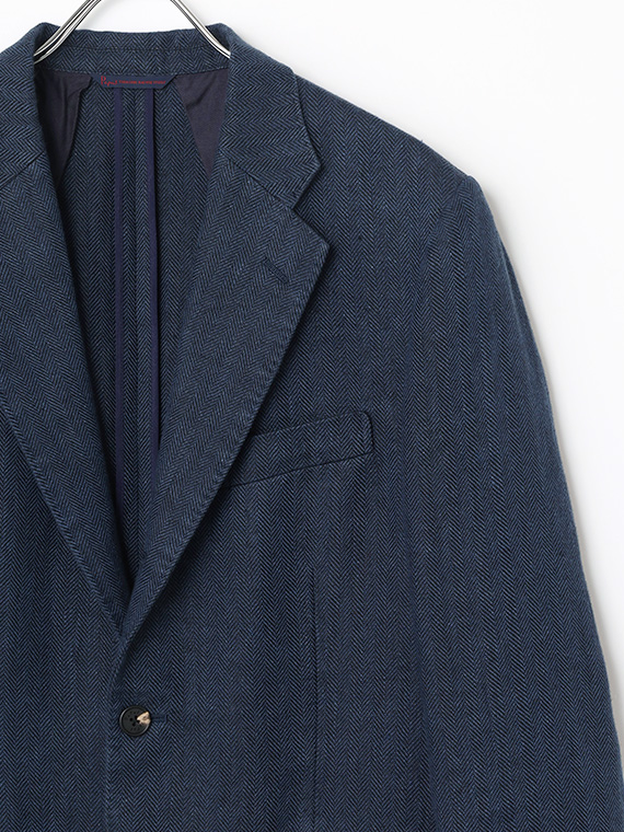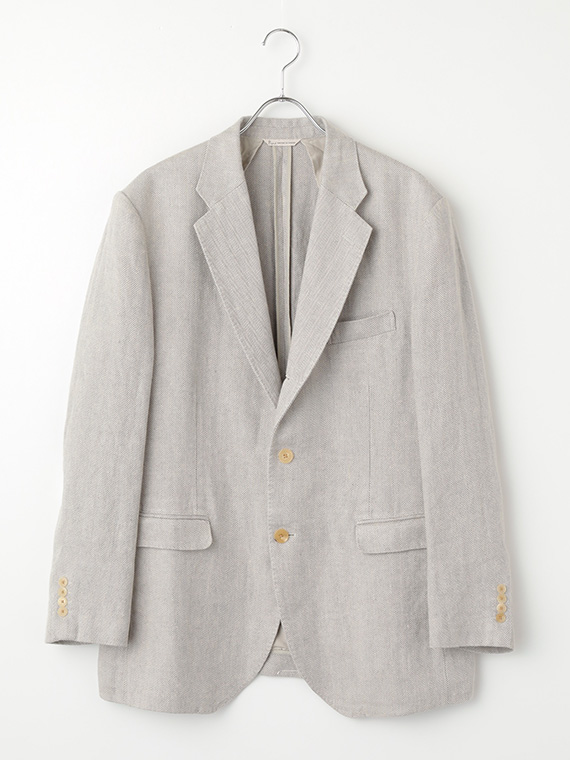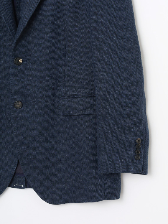 本素材は、海からのインスピレーションをカラーリングに反映した、伝統的なヘリンボーン柄のリネンツイード。タテ糸・ヨコ糸ともに16番手の太番手糸を使用し、しっかりとした重さと存在感を持たせています。クラシカルな表情とリネンならではの風合いを兼ね備えた、格調高い素材です。