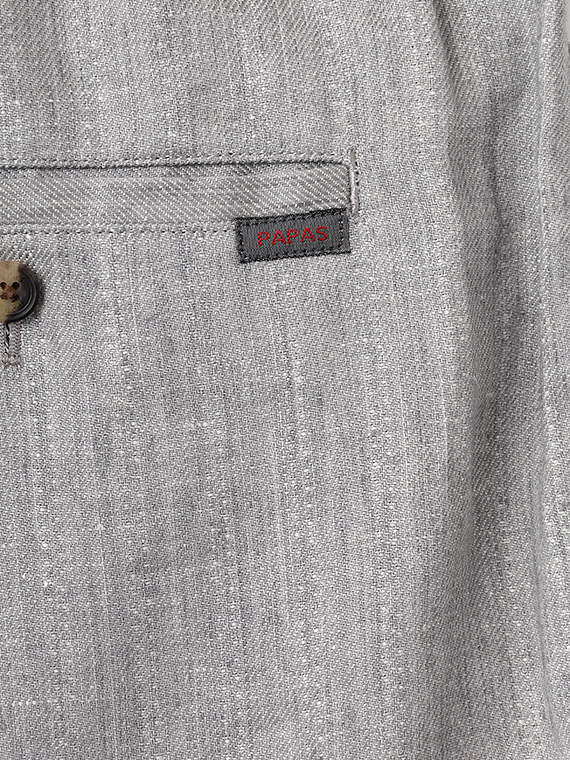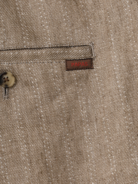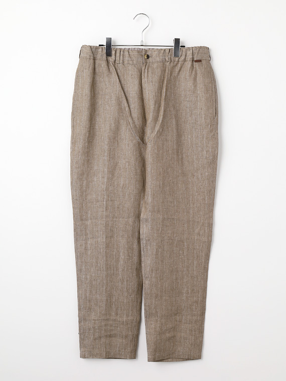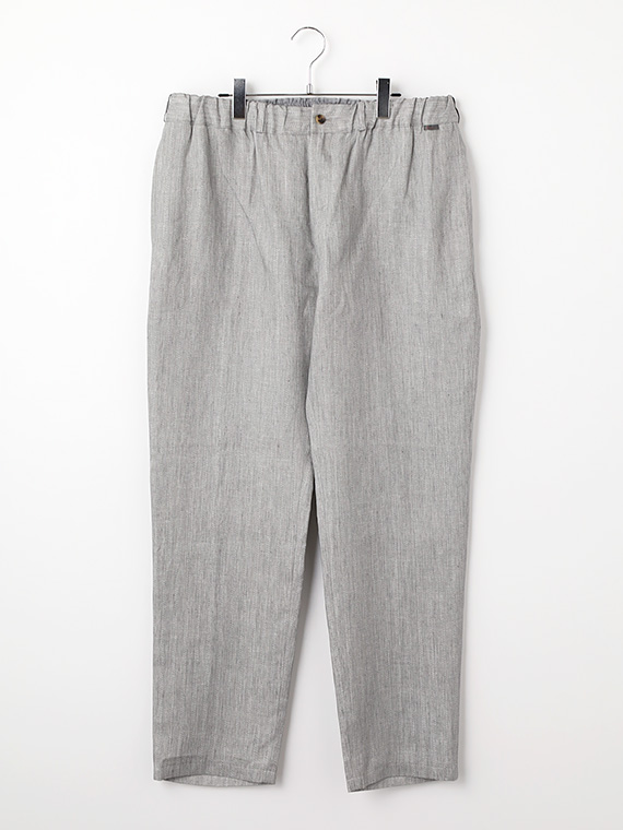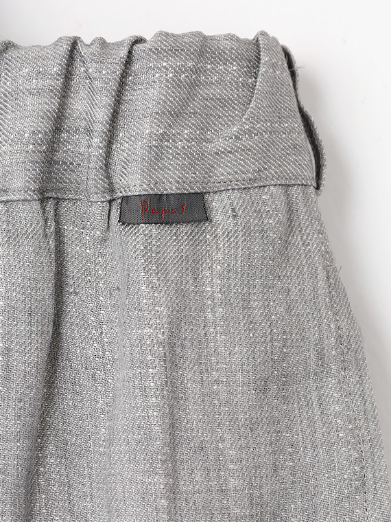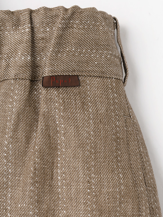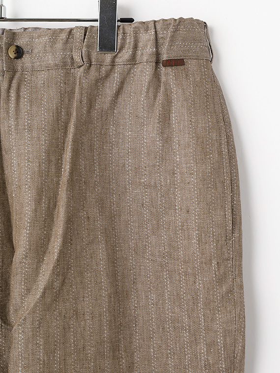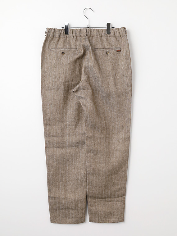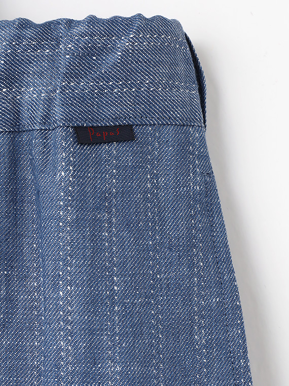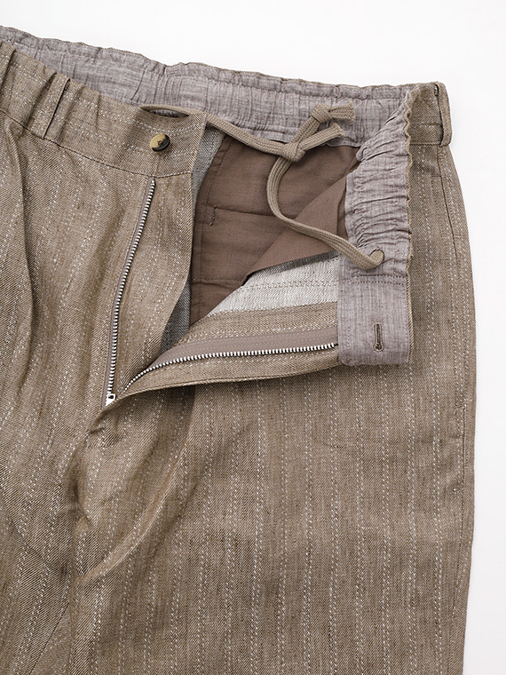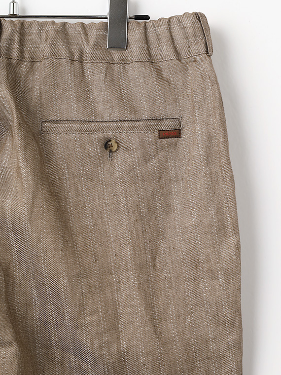 ウエストはゴム仕様に加え、内側には平スピンドルを通し、フィット感の調整もスムーズです。脇にはスラッシュポケット、後ろには片玉縁の釦付きポケットを配し、実用性と上品さをあしらい、デイリーからリゾートスタイルまで幅広く活躍する一本です。