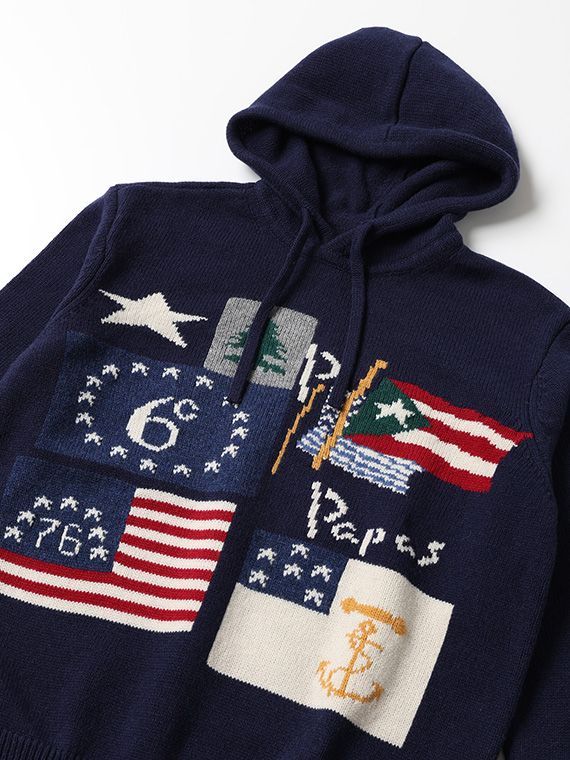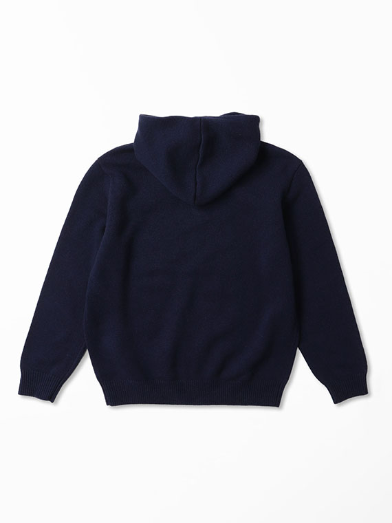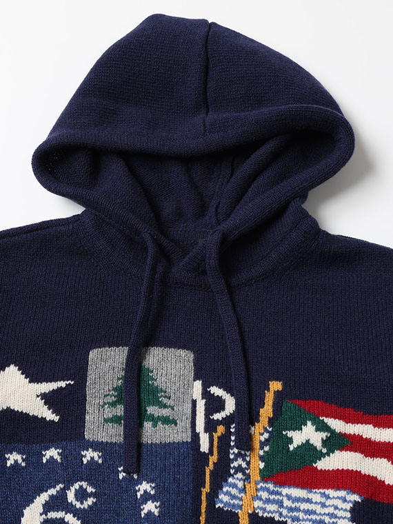 裏の糸始末まで綺麗に処理されている、完全にフラットなインターシャです。日本国内では編めない、インターシャに特化した特殊な多色インターシャ編み機で編んだ貴重なニット。時間をかけて1枚1枚丁寧に作られたこちらの商品は出来上がりの雰囲気も格別です。