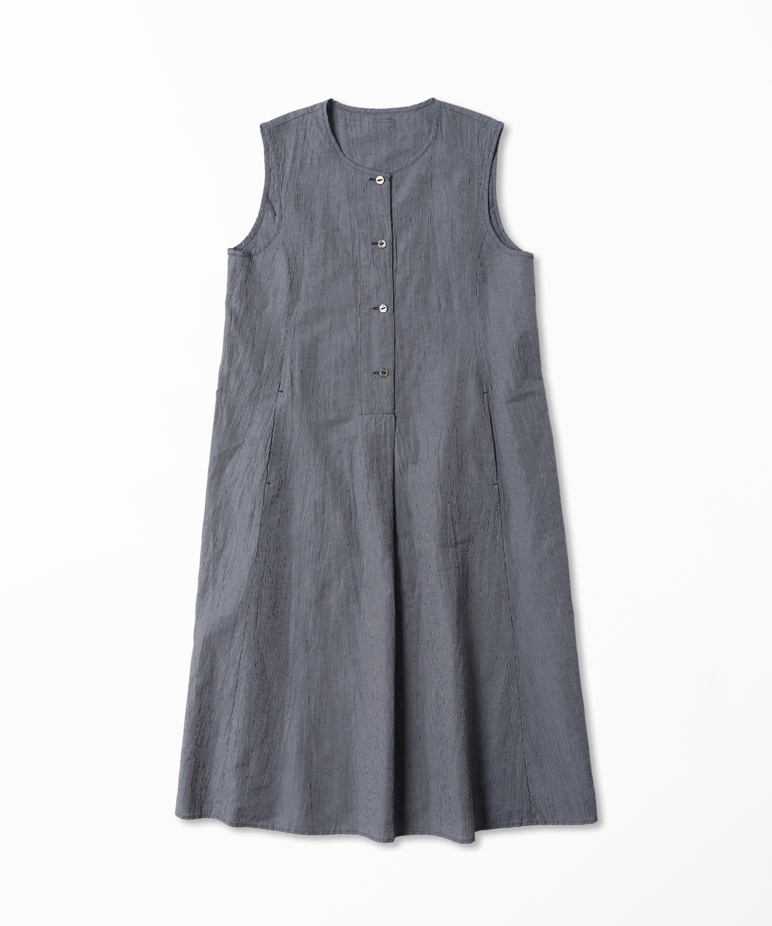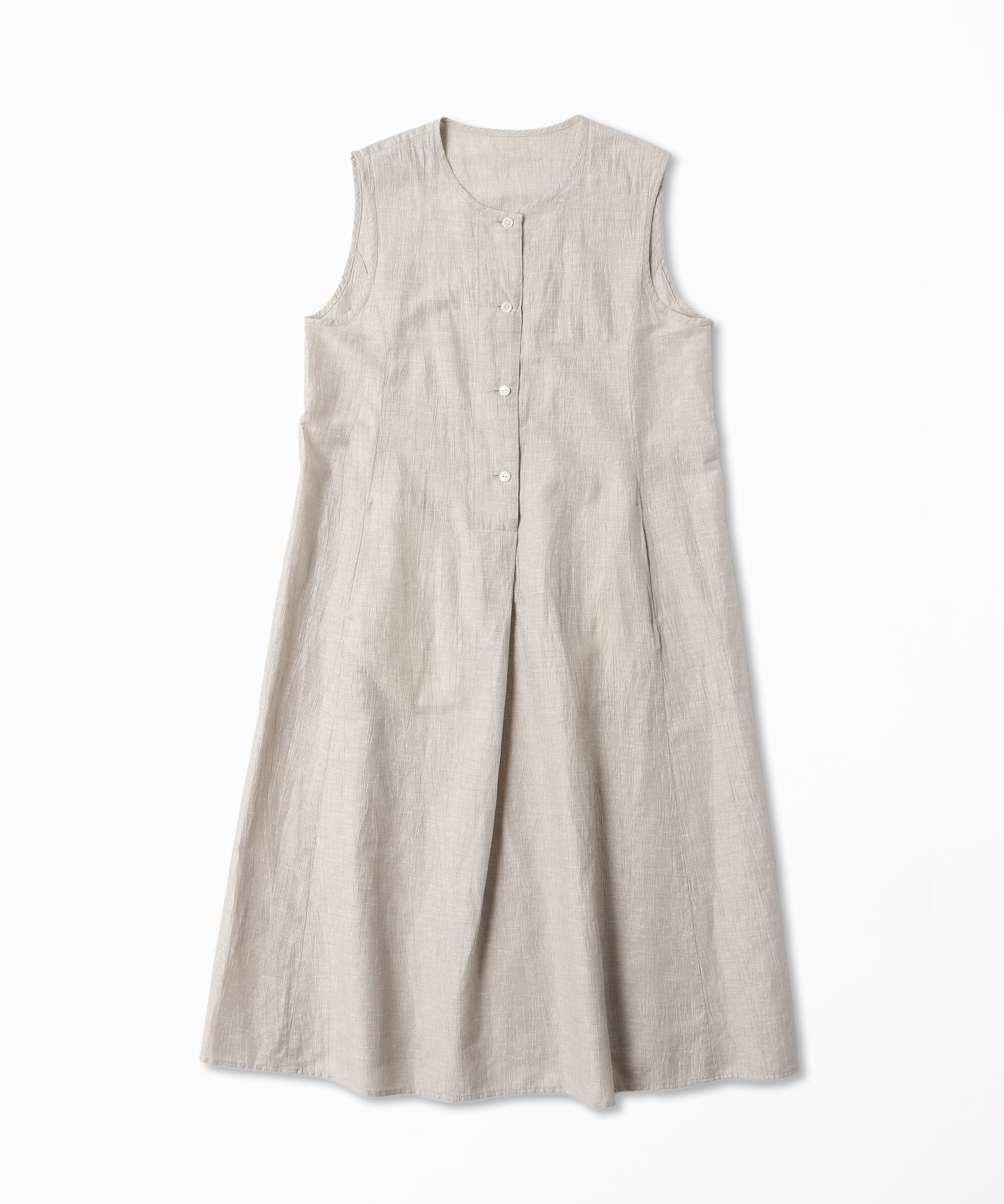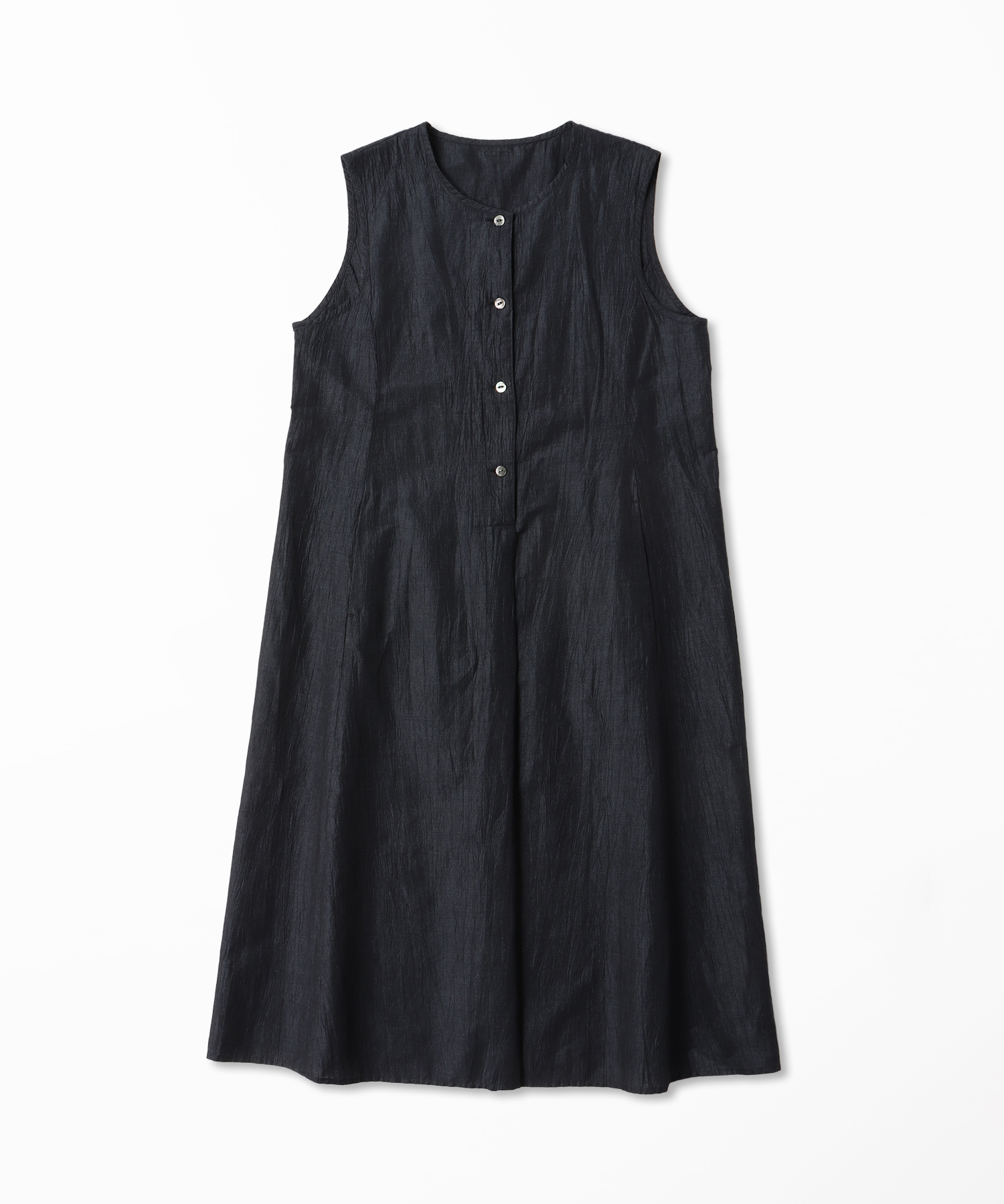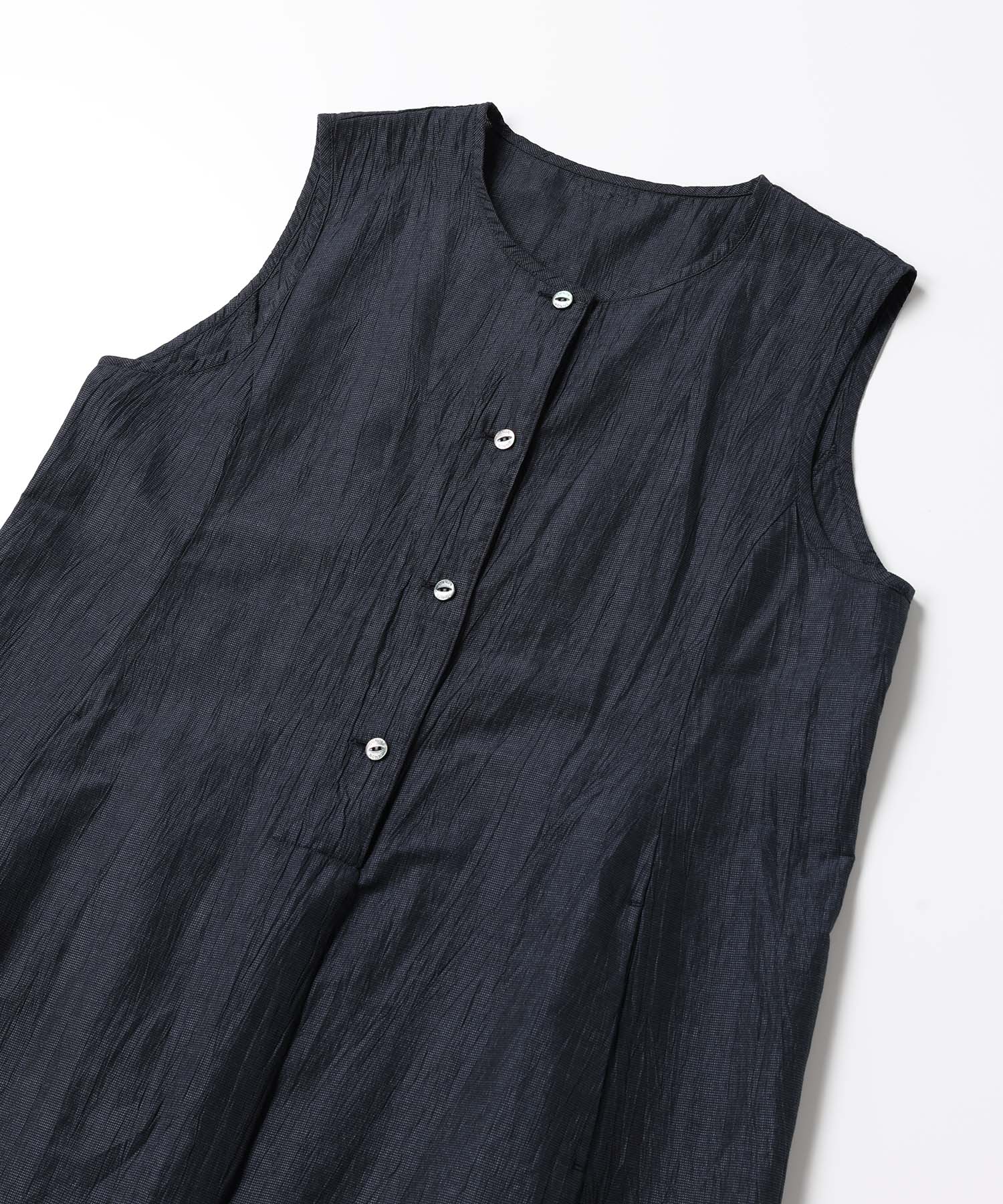 ノースリーブワンピースとしてもご着用いただけるよう、衿ぐりやアームホールの開き具合に注意してデザインしました。肌離れのよい、たっぷりした分量感ですがとっても軽くお召しいただけます。