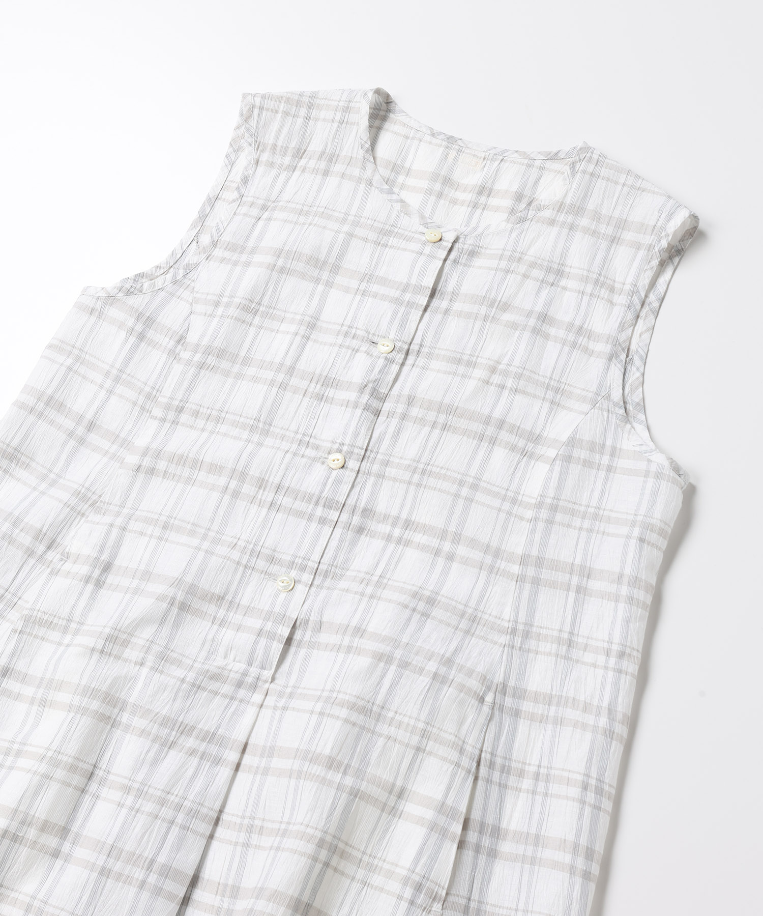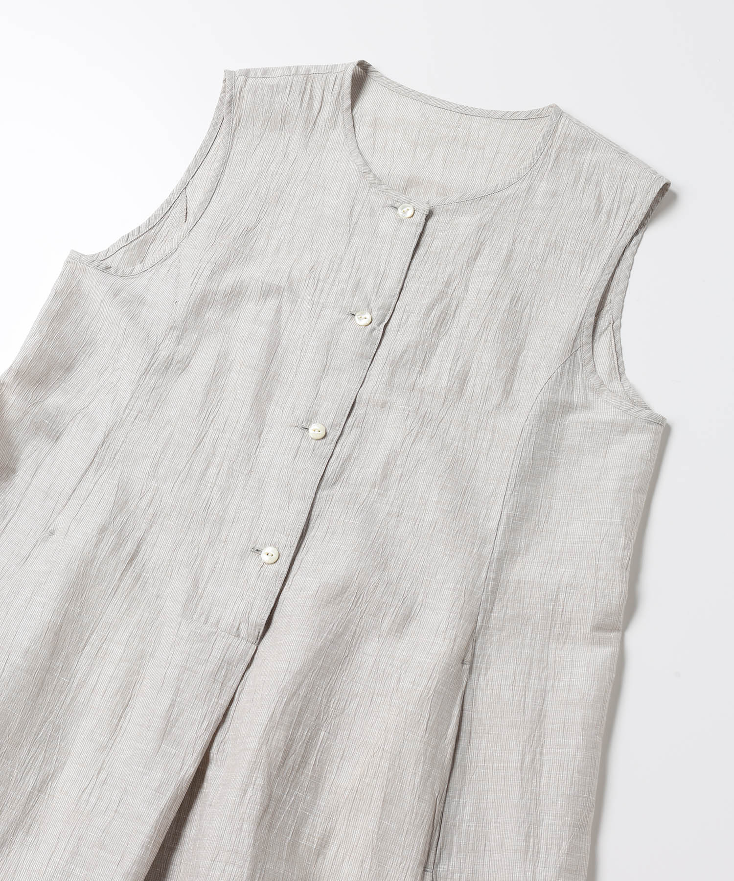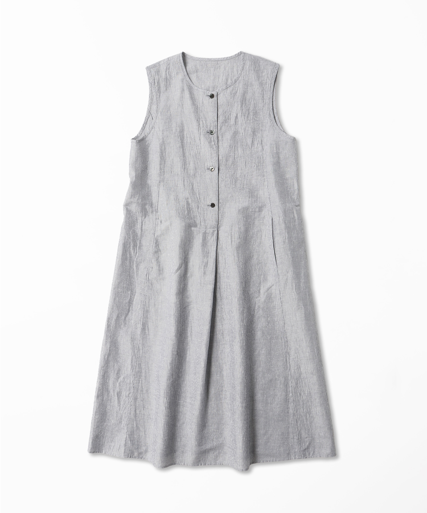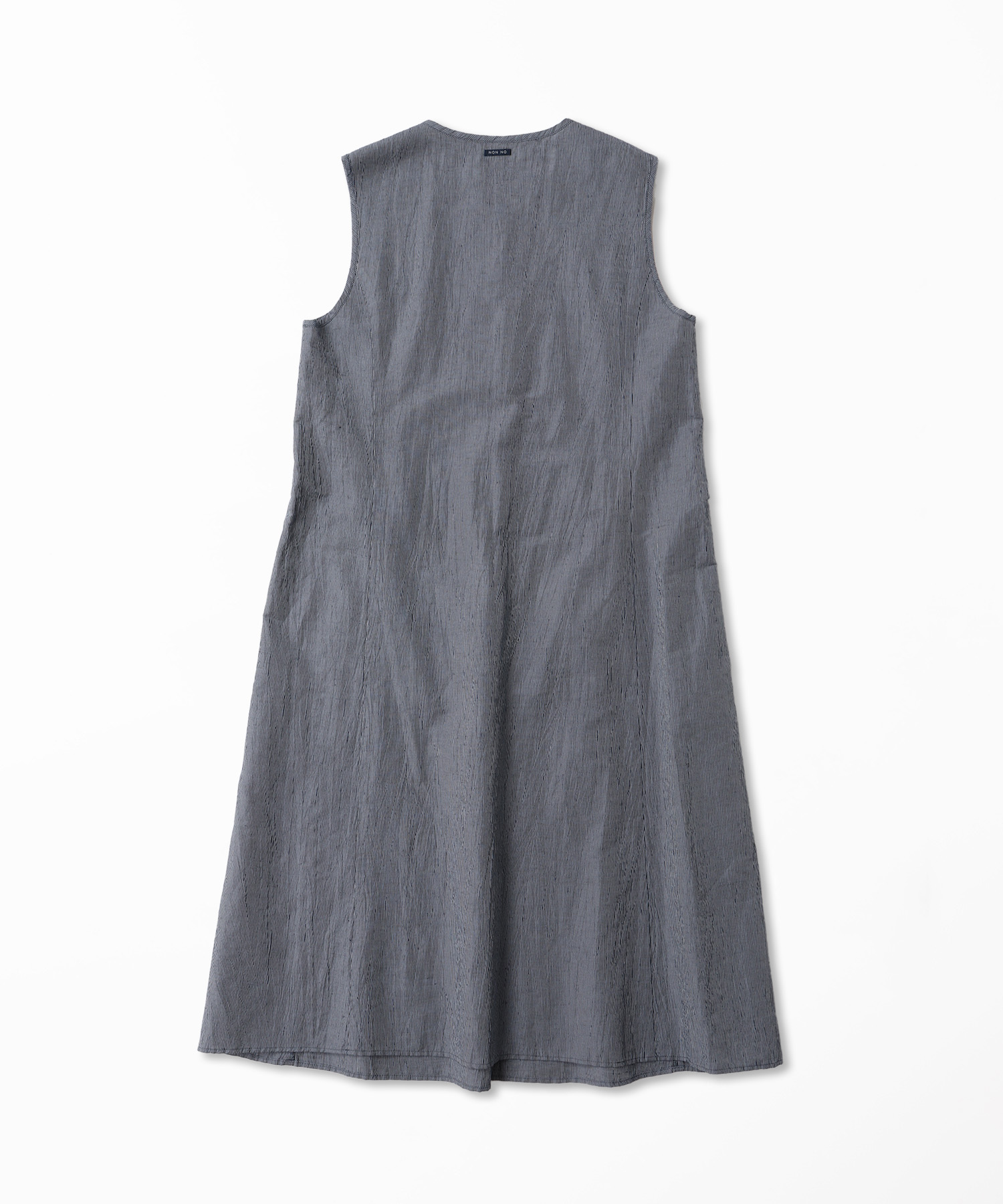 ノースリーブワンピースとしてもご着用いただけるよう、衿ぐりやアームホールの開き具合に注意してデザインしました。肌離れのよい、たっぷりした分量感ですがとっても軽くお召しいただけます。