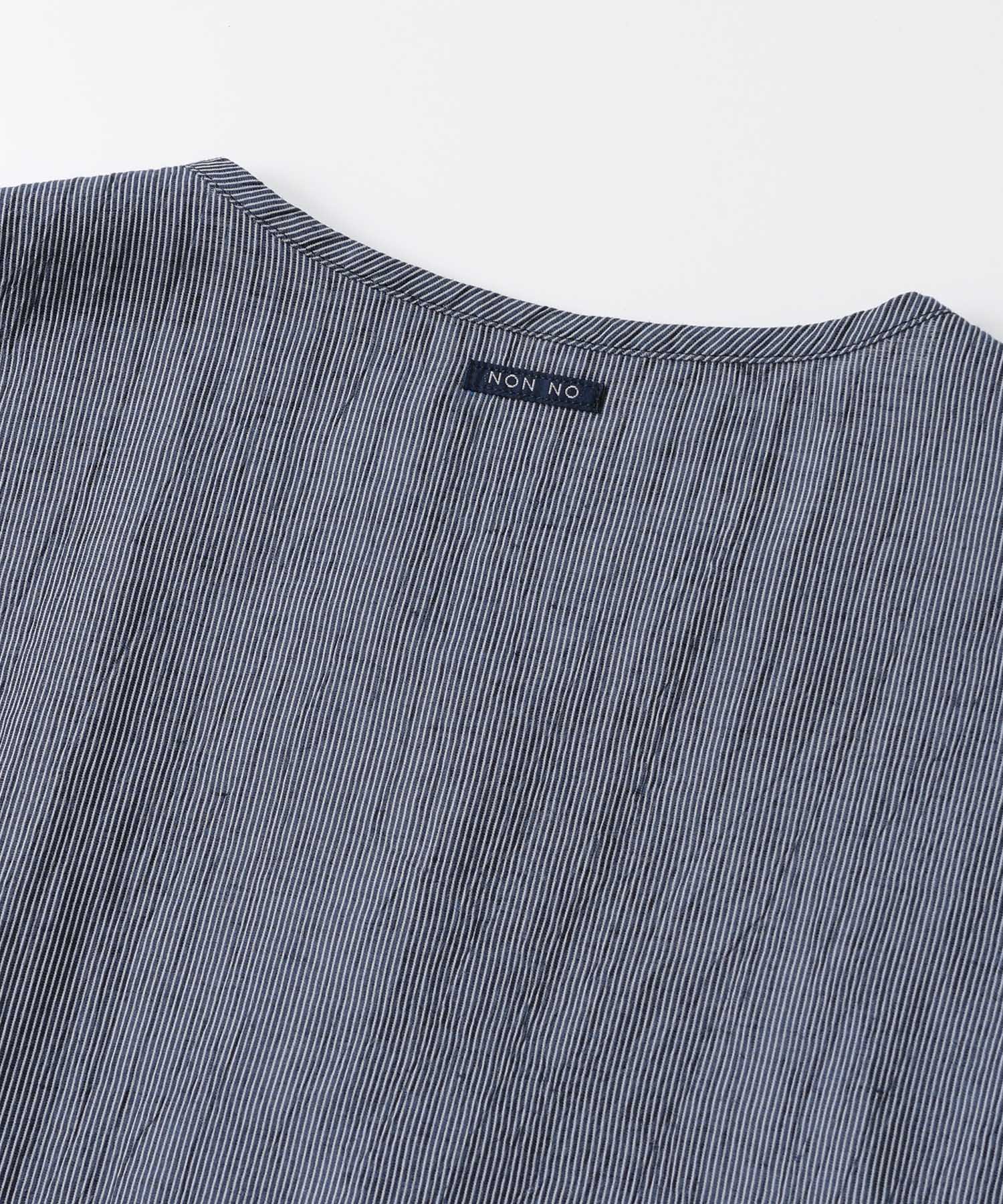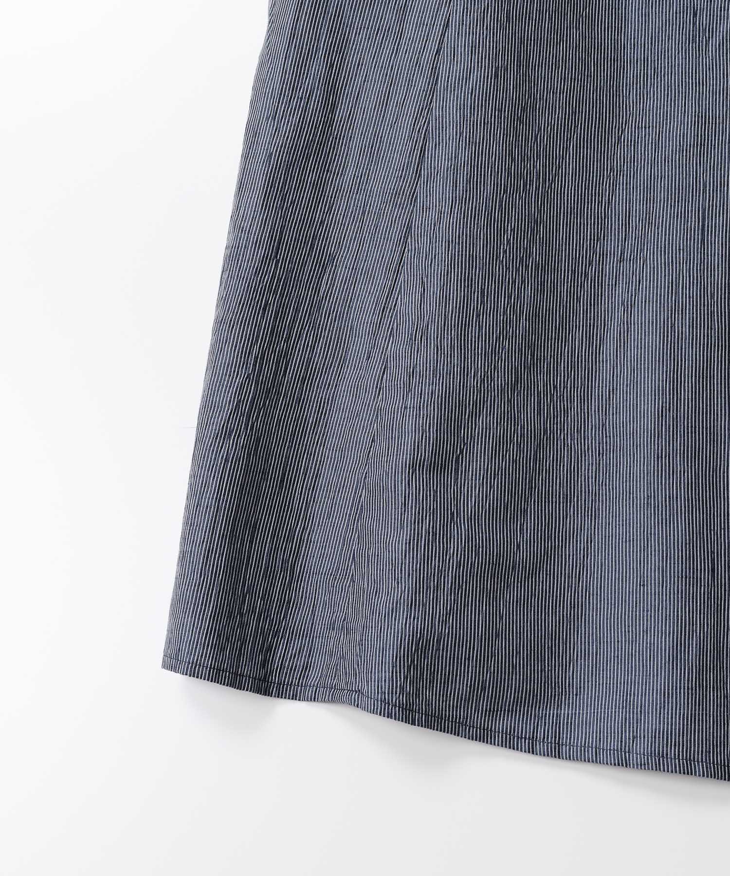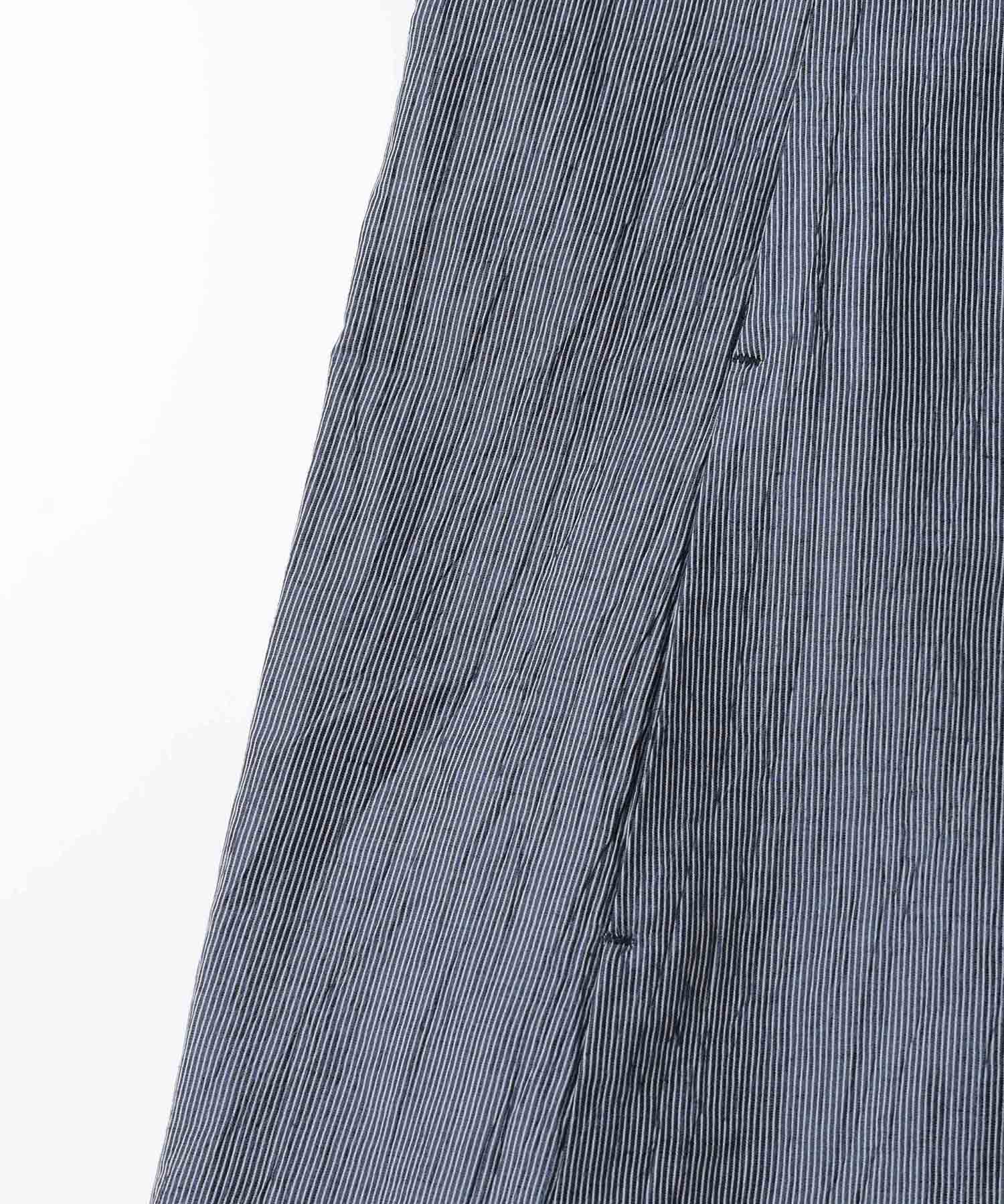 タテ糸に30Dポリエステル、ヨコ糸に1/60リネンと80/2コットンを配置し織り上げた平織の先染めストライプ&チェック素材です。 筒状の機械に生地を通し熱を加えることで凹凸のあるシワ感を表現した、薄くて軽い清涼感のある素材に仕上がっています。 自然な光沢も上品な印象です。
