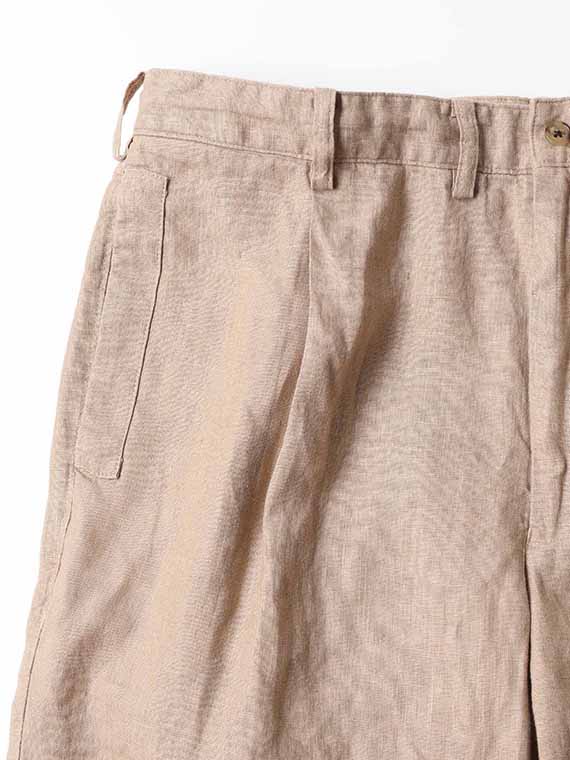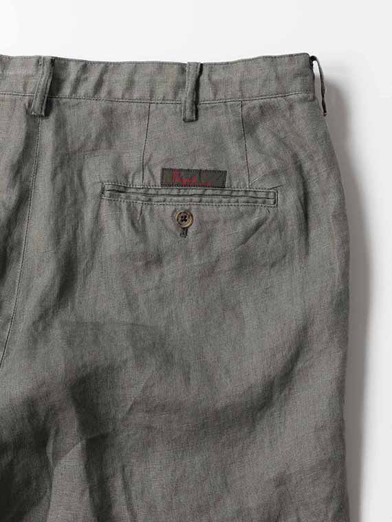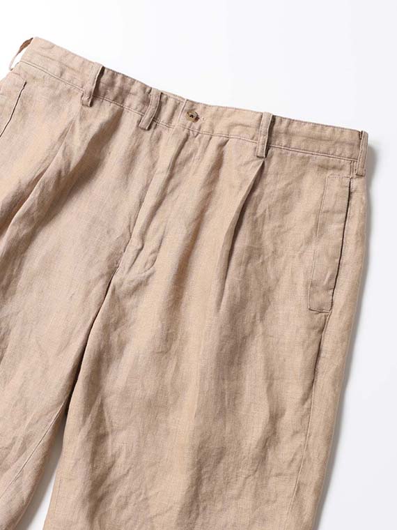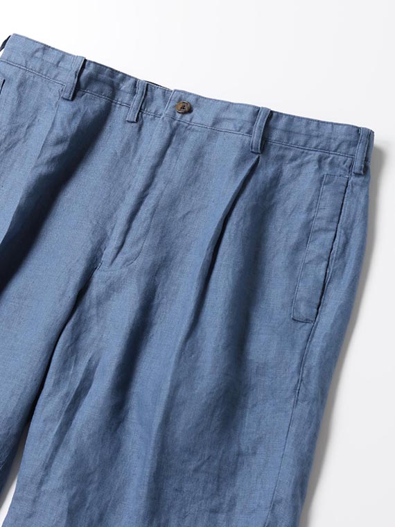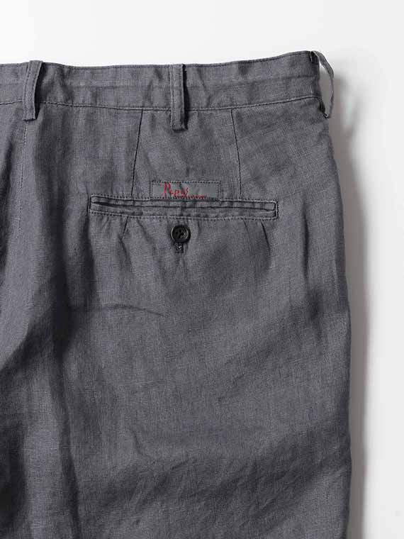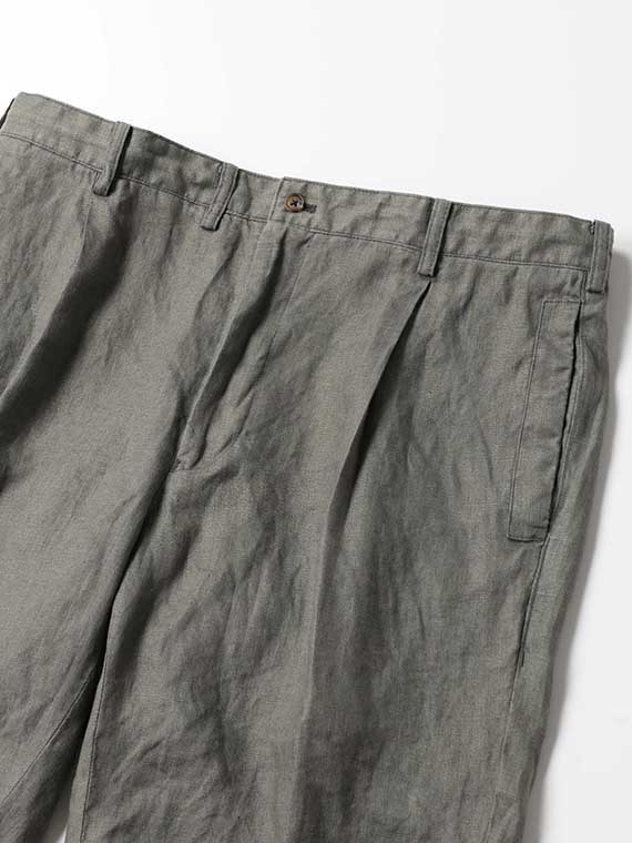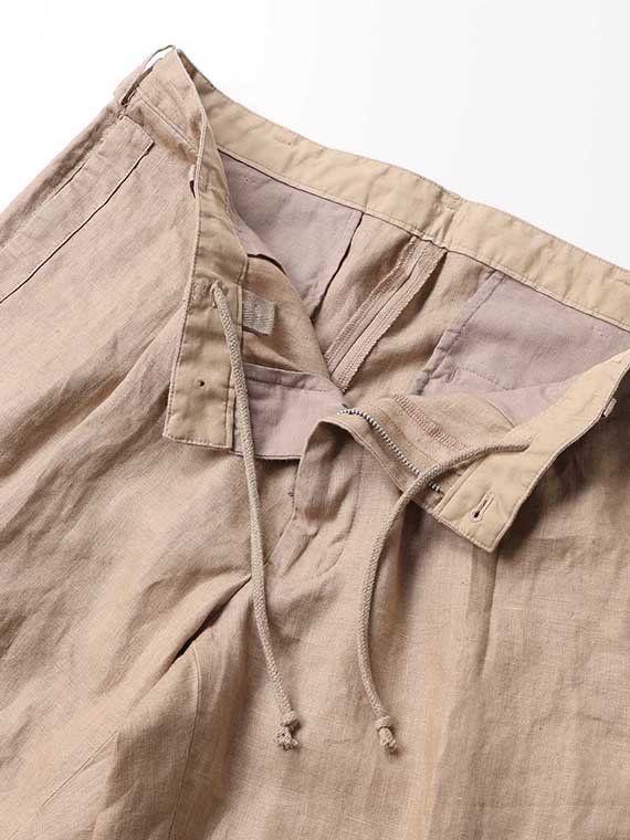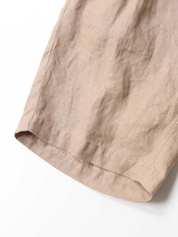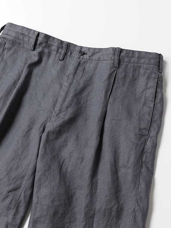 タテ糸・ヨコ糸共に1/42ヘンプを使用した高密度平織マット組織の素材です。ビッグライズ(中白染め)をすることでフェード感を出し、タタキ加工(揉み込みエアーワッシャー加工)によってソフト感を出したアウター素材です。