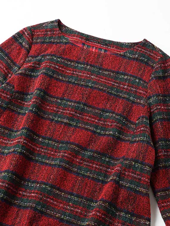 タータンチェック素材の上に透け感のあるシフォンを重ね、特殊な針を刺し込み、生地を一体化させたタバサオリジナルの素材です。